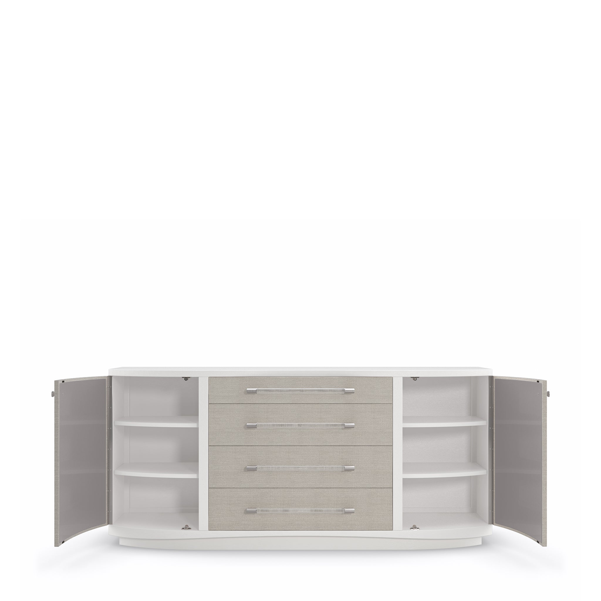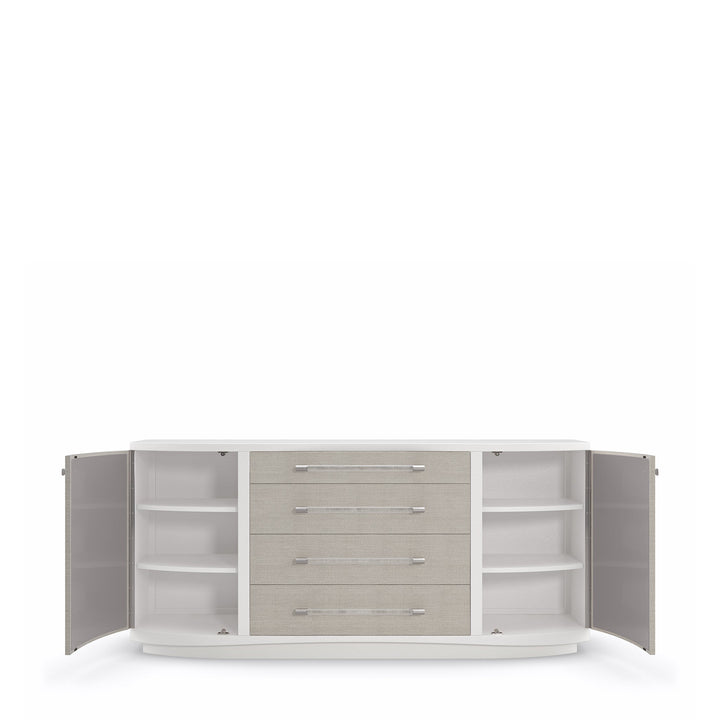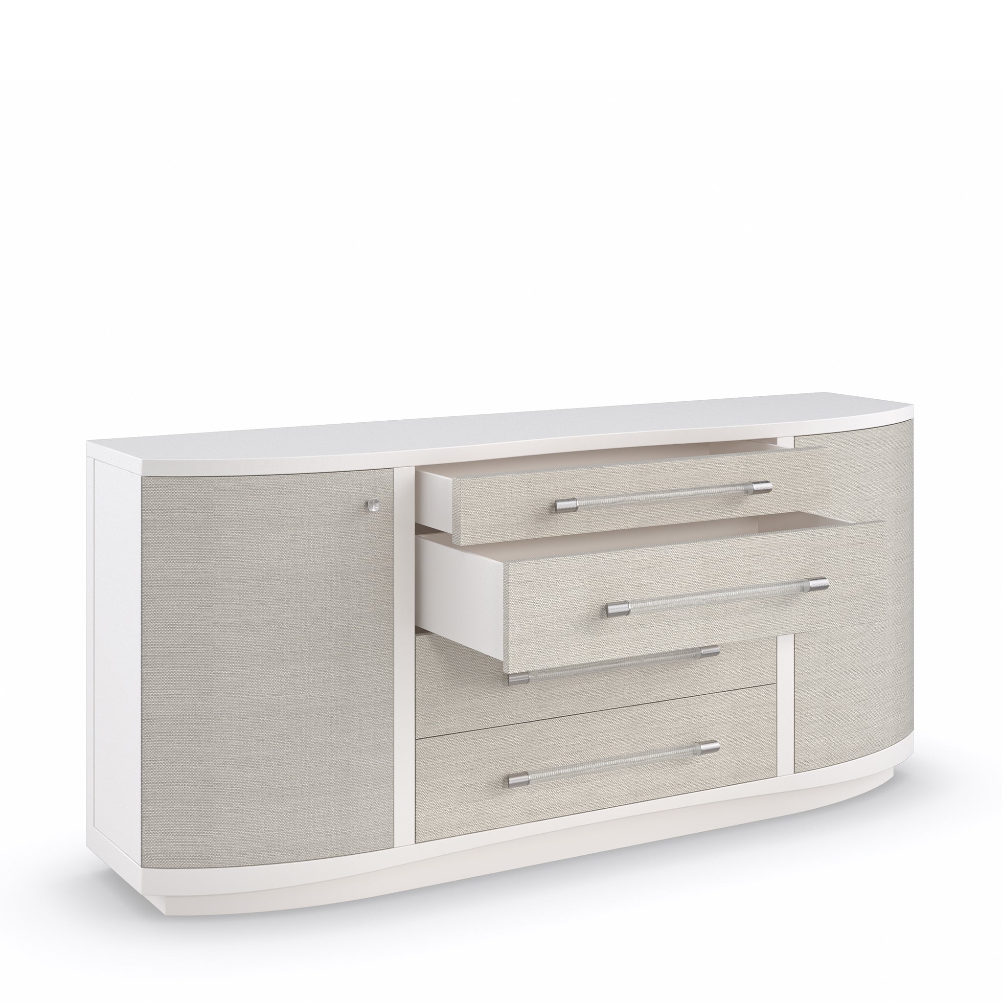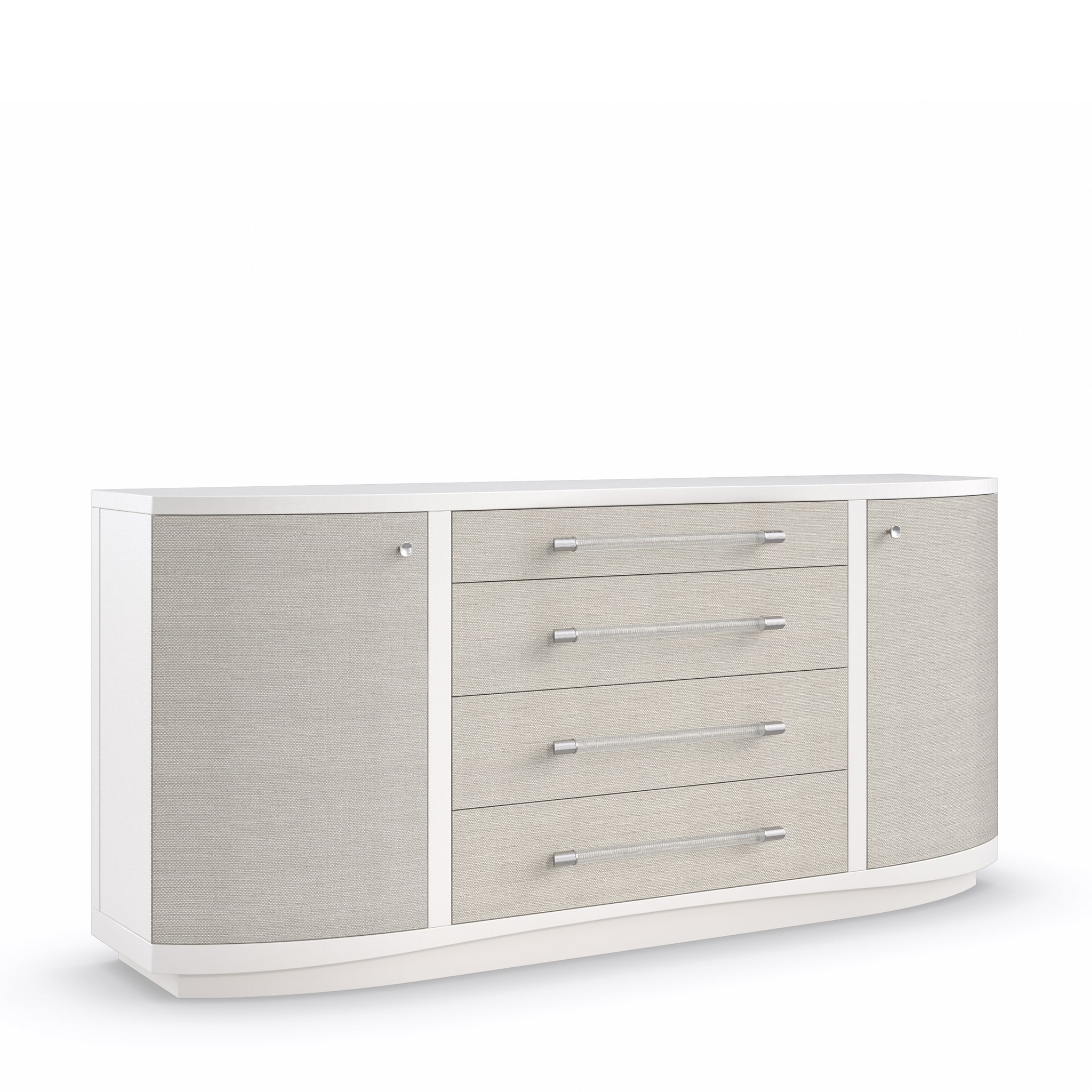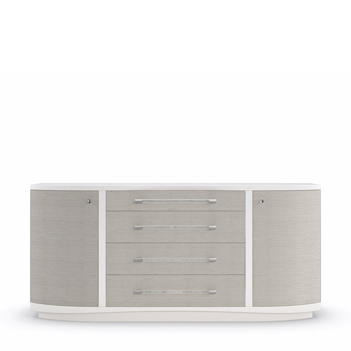 With modern lines and mixed materials, this dresser injects a contemporary flair into your decor. Crafted in Pearly White with woven Rafia front accents in Sunkissed Silver finish, it tastefully blends whole aesthetics. Tuck away your clothing easily with the help of Acrylic drawer pulls capped in ribbed Stainless Steel and square knobs inscribed with a ginkgo leaf pattern. This piece features four roomy drawers and shelves to keep your bedroom tidy.
