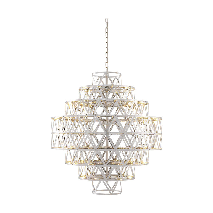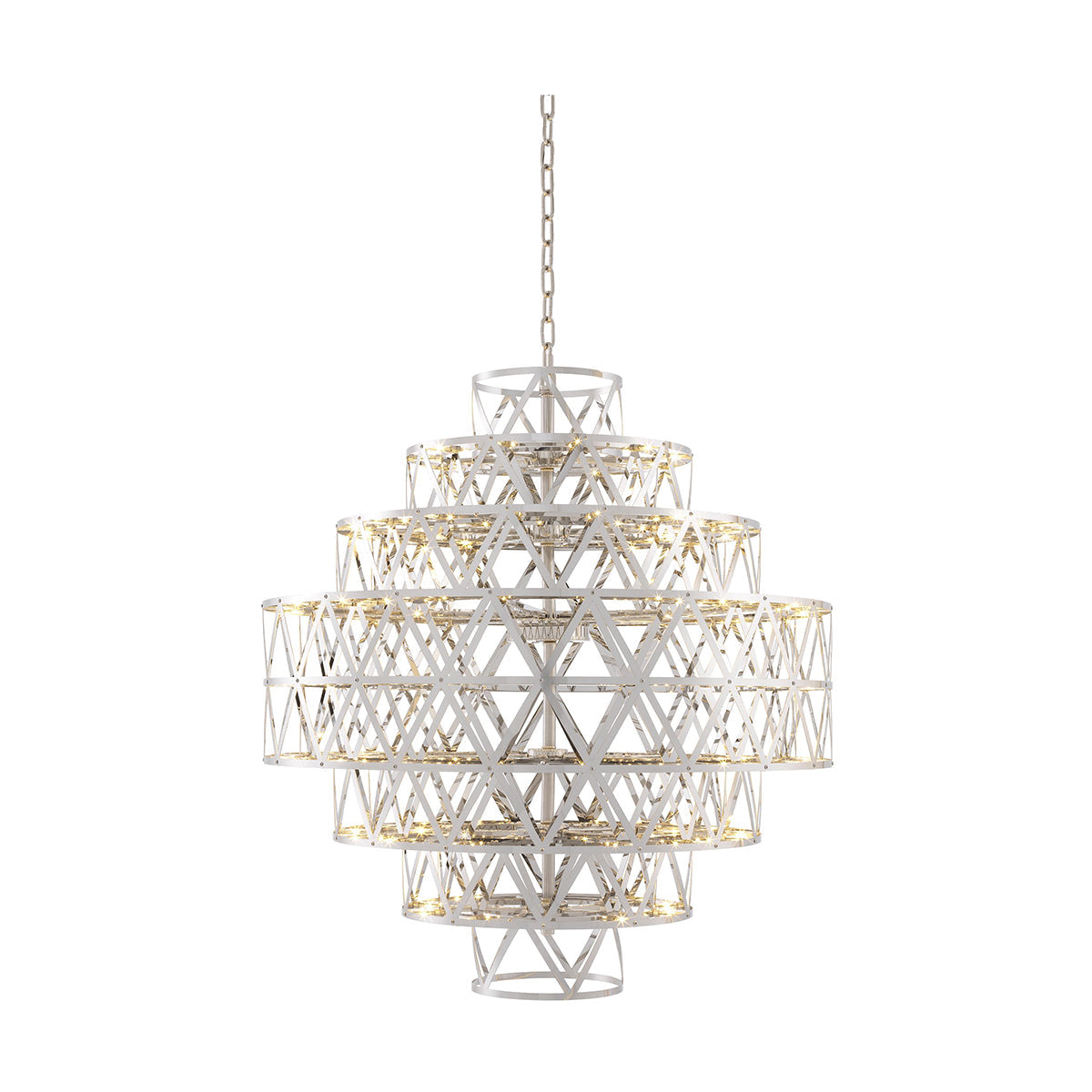 With the Clinton Chandelier, you can bring a modern twist to the traditional design. Its geometrical frame is crafted in steel and connects 160 LED lights to create a spectacular illumination. This piece features a striking design in a Nickel finish that stands out in a contemporary living room setting.