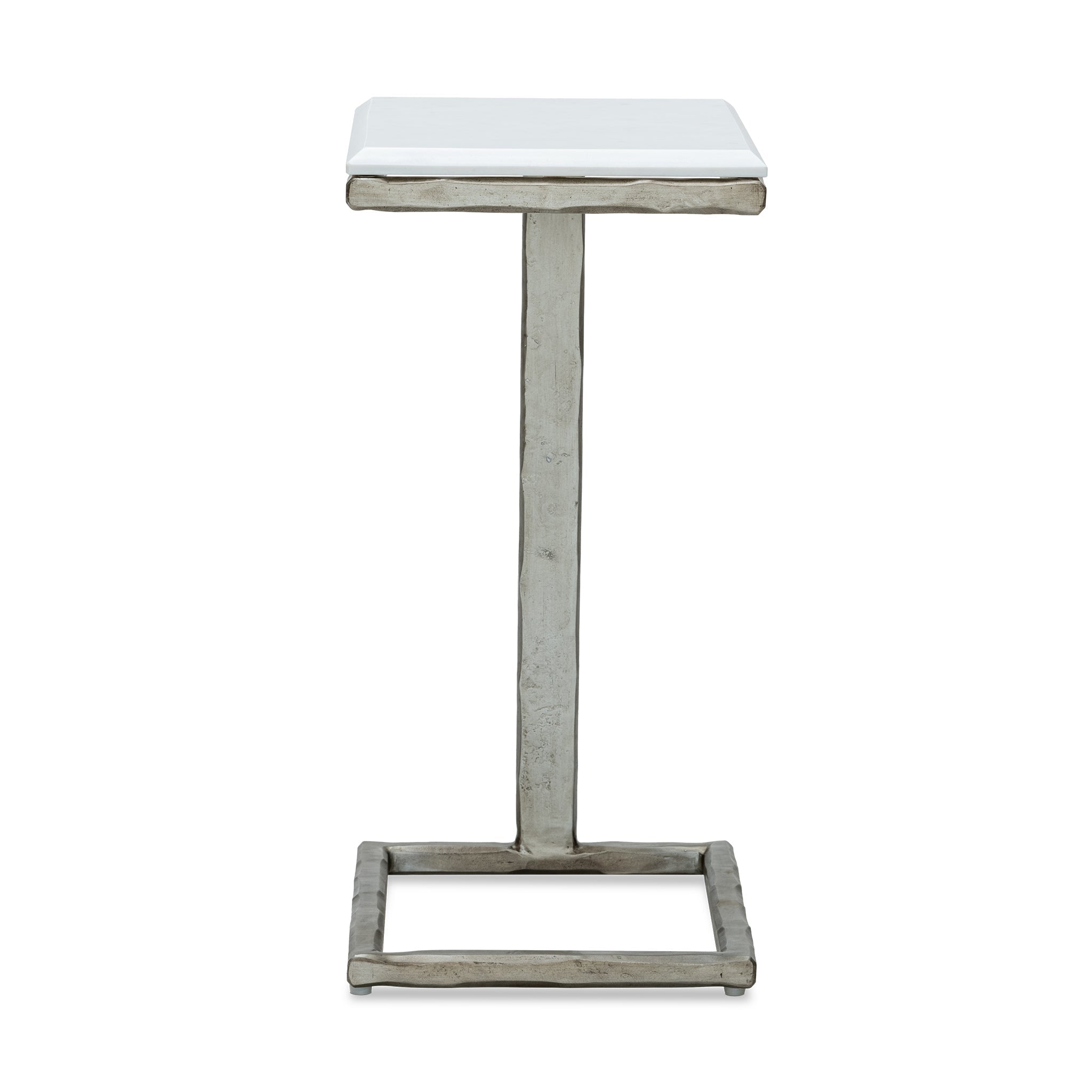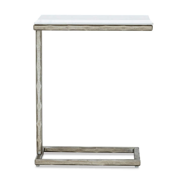 The polished white banswara marble top offers a smooth, glossy surface, while the hand-hammered base in a silver finish showcases skilled artisanal craftsmanship and adds depth and character to the design.