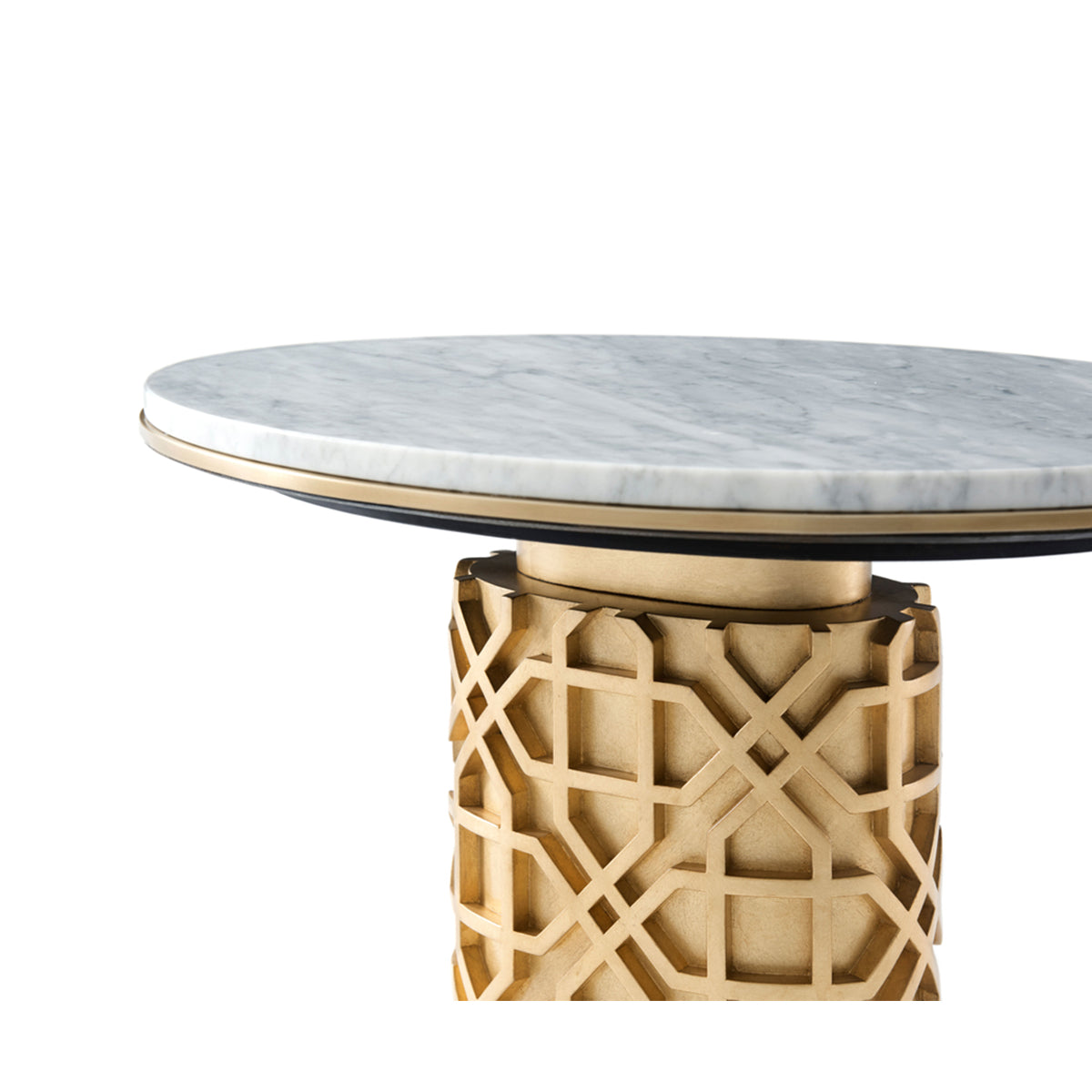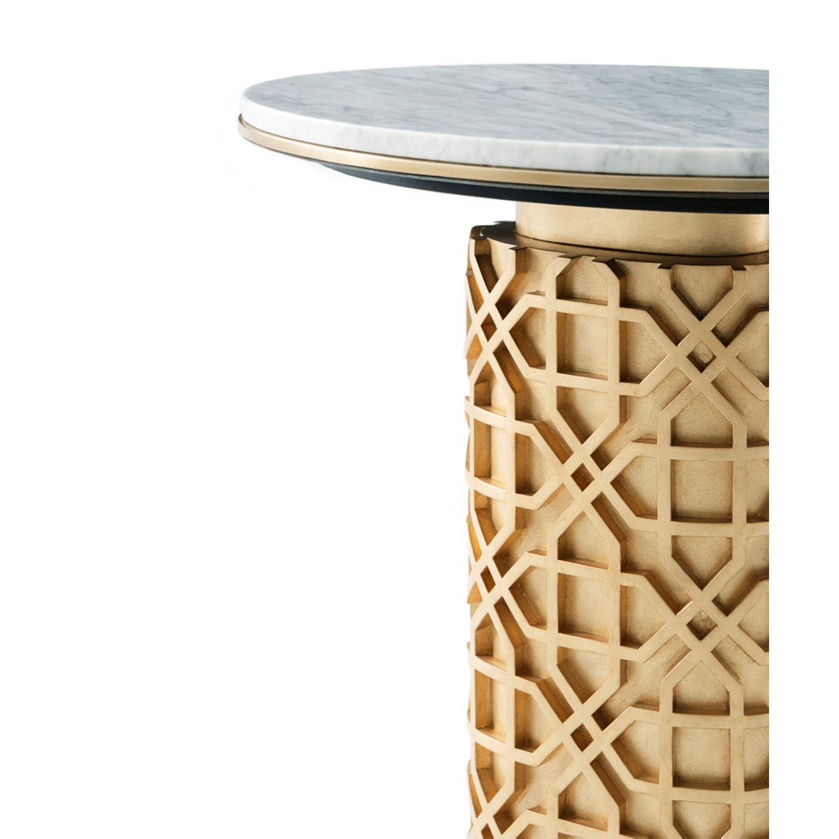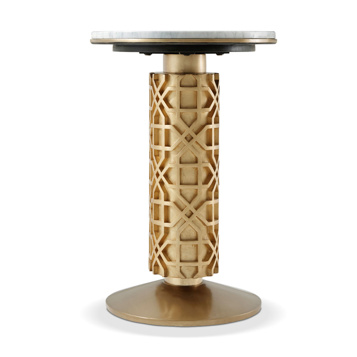 Unfold the luxury with Colter Side Table. A premium selection for your place, the unit features a circular marble top merged with the Brass finish molding detail. The Mughal-inspired lattice impressive star design on a Gilt Bas relief column is further shining, giving the domed Disc base a distinctive appeal.