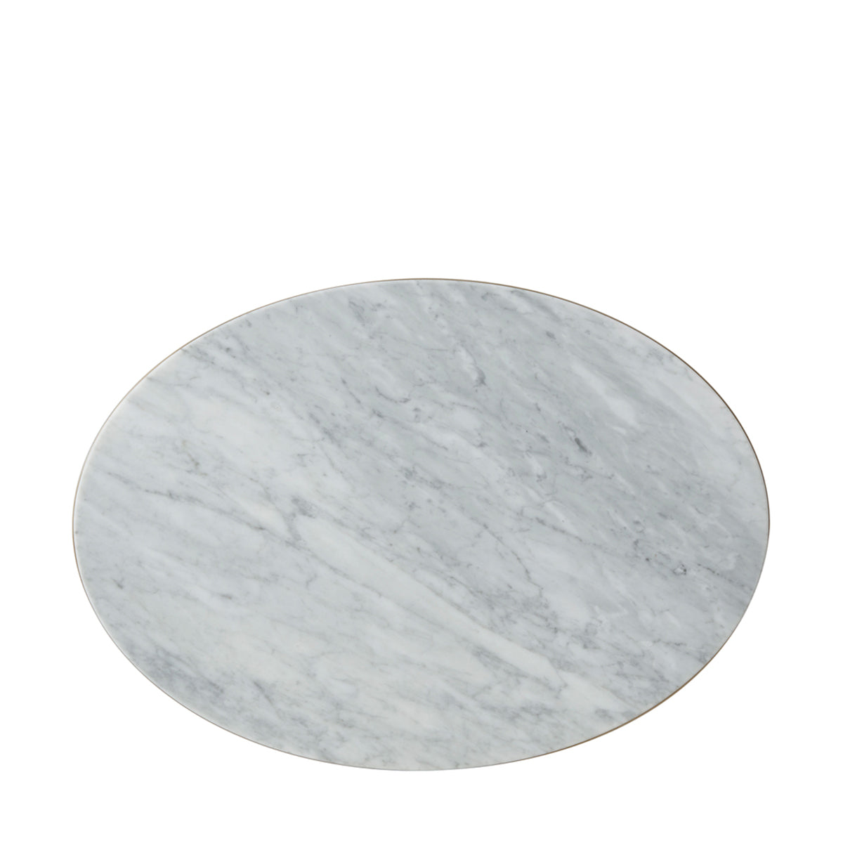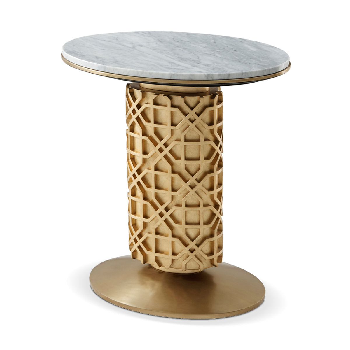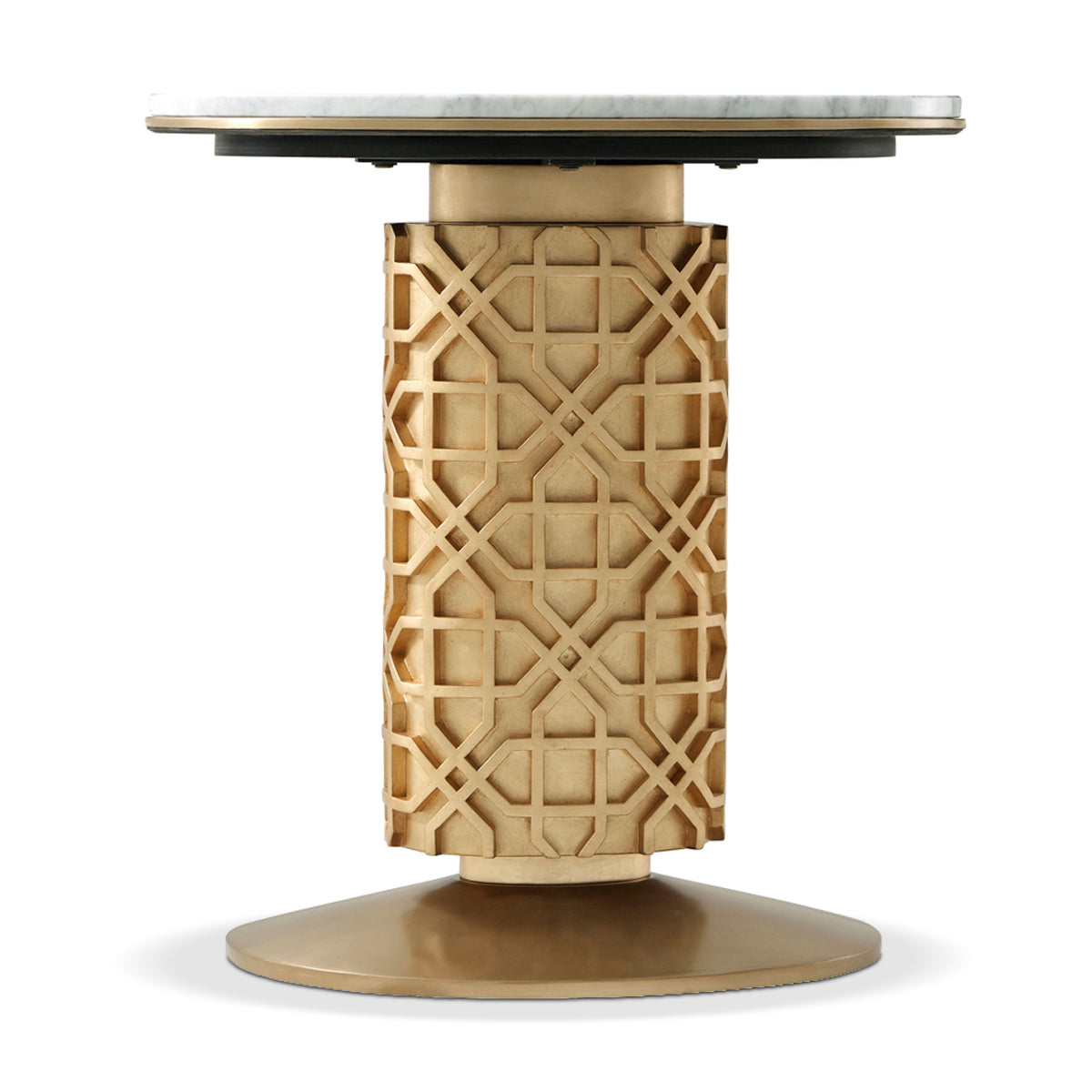 Unfold the luxury with Colter Side Table. A premium selection for your place, the unit features a circular marble top merged with the Brass finish molding detail. The Mughal-inspired lattice impressive star design on a Gilt Bas relief column is further shining, giving the domed Disc base a distinctive appeal.