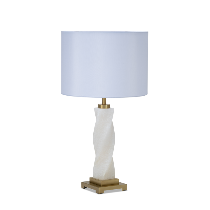 Carved from solid alabaster, the gracefully curved base evokes timeless elegance. The luminous alabaster contrasts beautifully with the antique brass finish, while the white shade softens the look with a touch of sophistication.