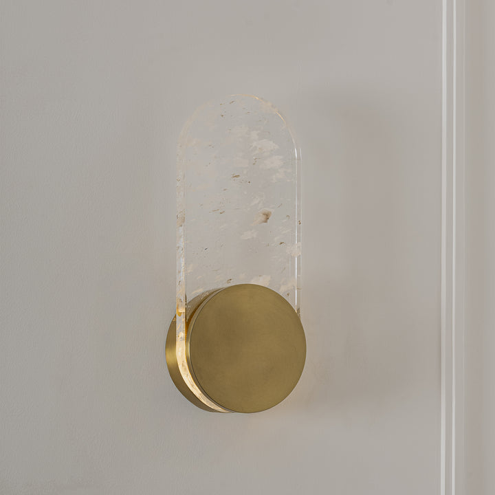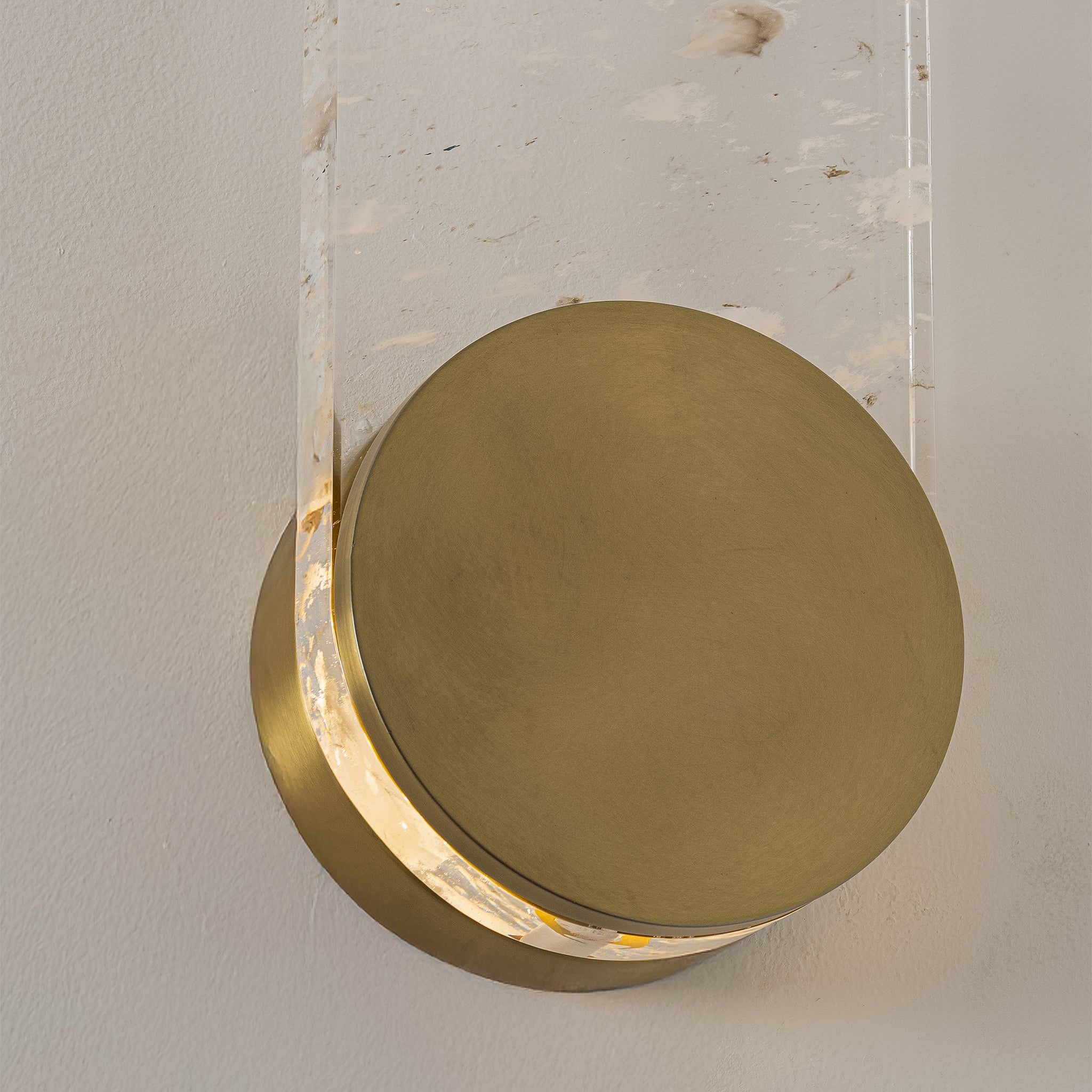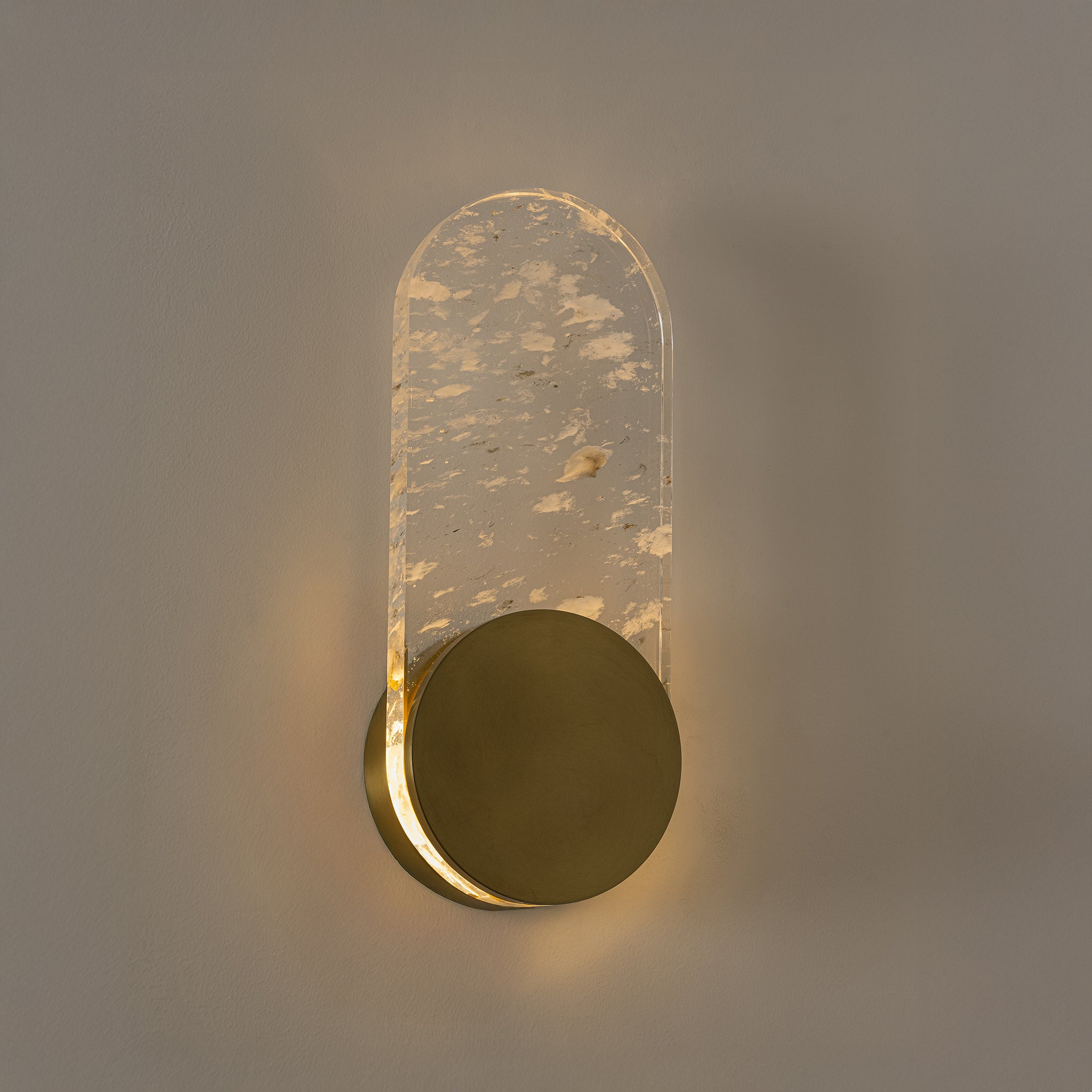 Defined by its softly clouded crystal form, this wall lamp enhances the depth of its luminous surface. Paired with an antique brass base, it balances contemporary design with timeless appeal.