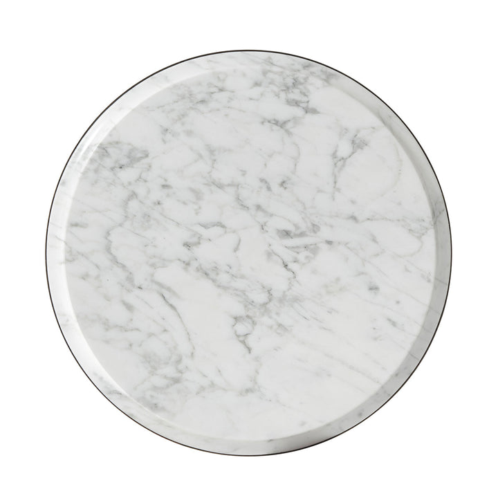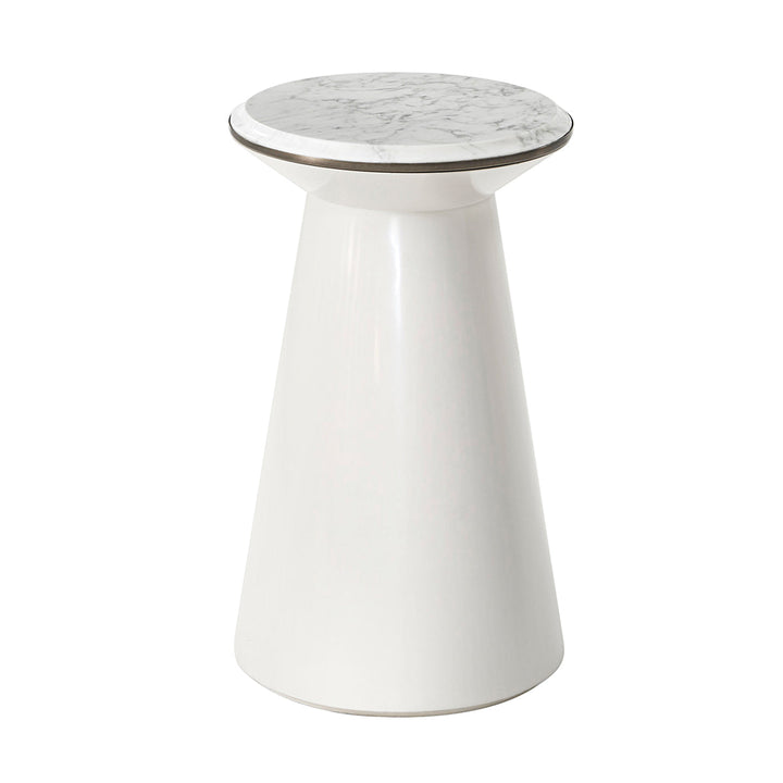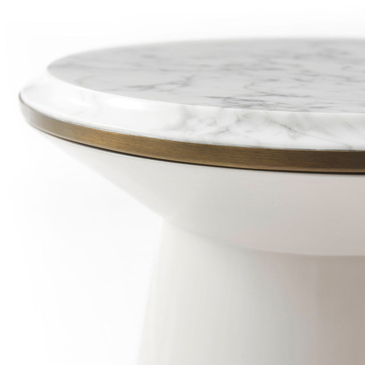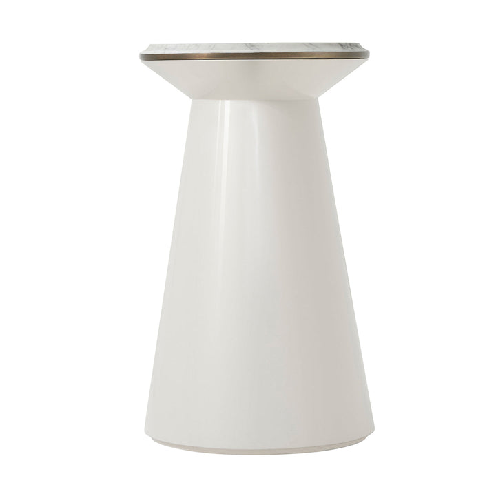 Feel modern with this uniquely patterned accent table that stuns with its appeal. The streamlined, asymmetrical hourglass silhouette is assembled with purpose. The monochromatic hued table with its rare Champagne lacquering is a manifestation of abstract deco with heritage bronze molding. Gracing with grey veins is the white marble top, appropriate to blend spaces between sofas and armchairs.