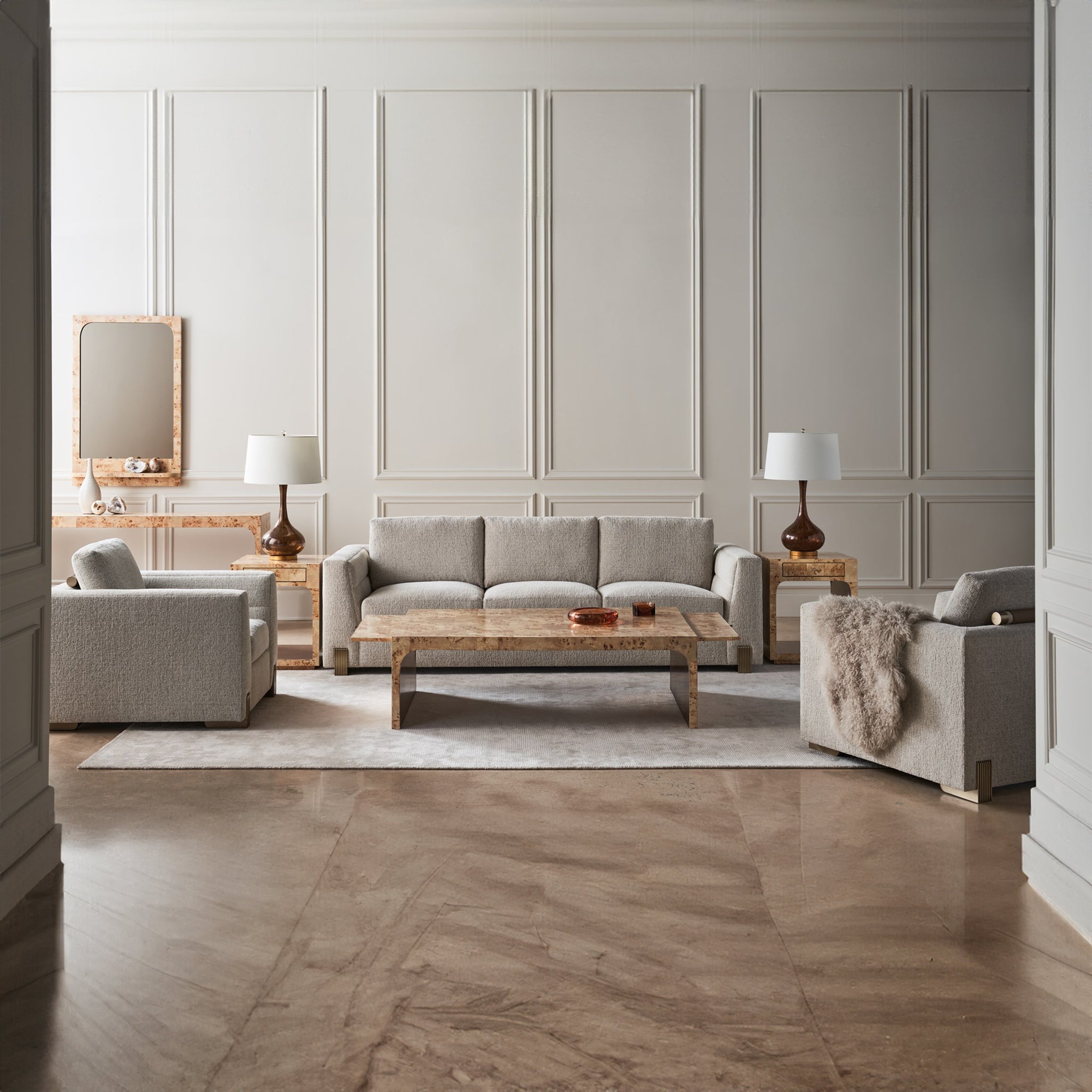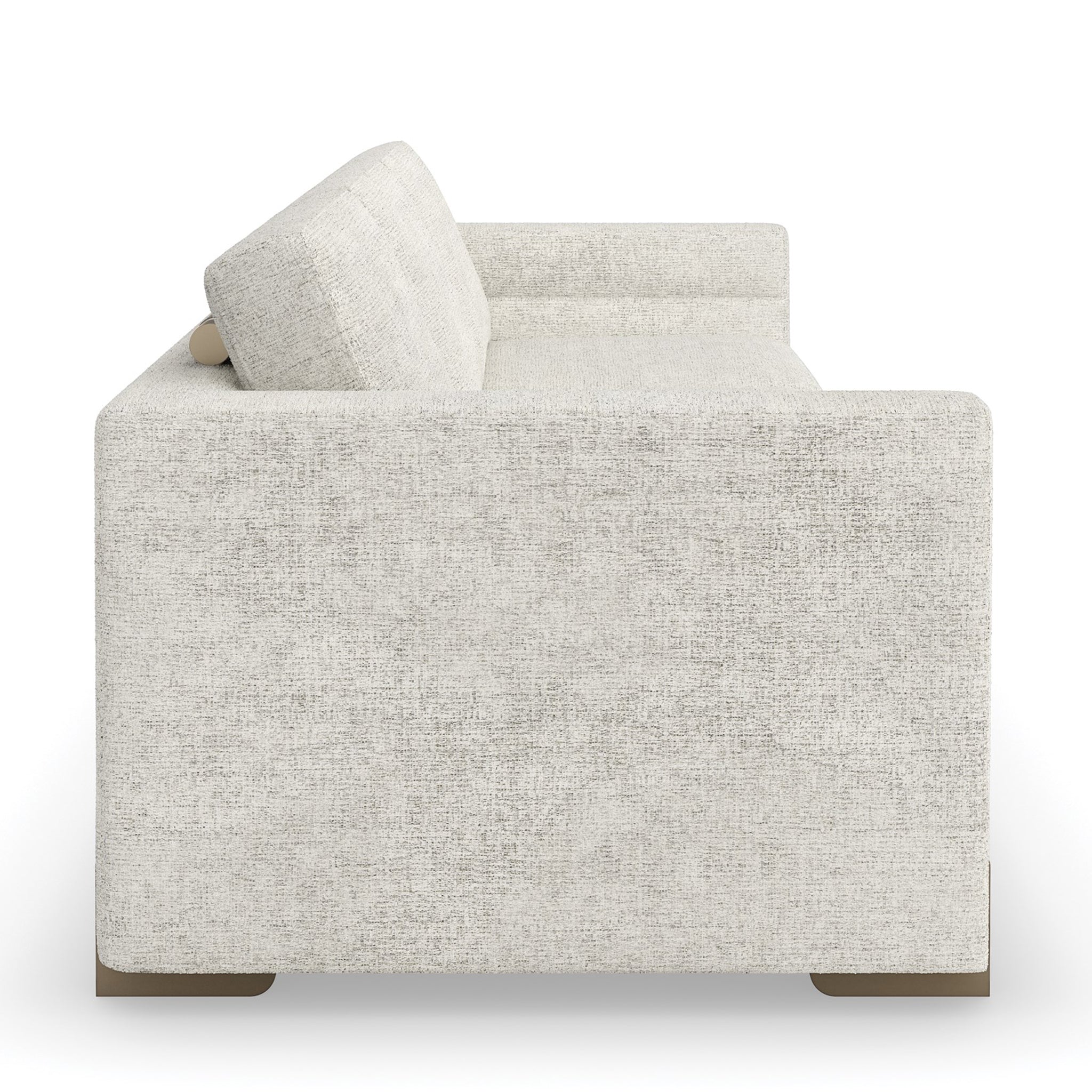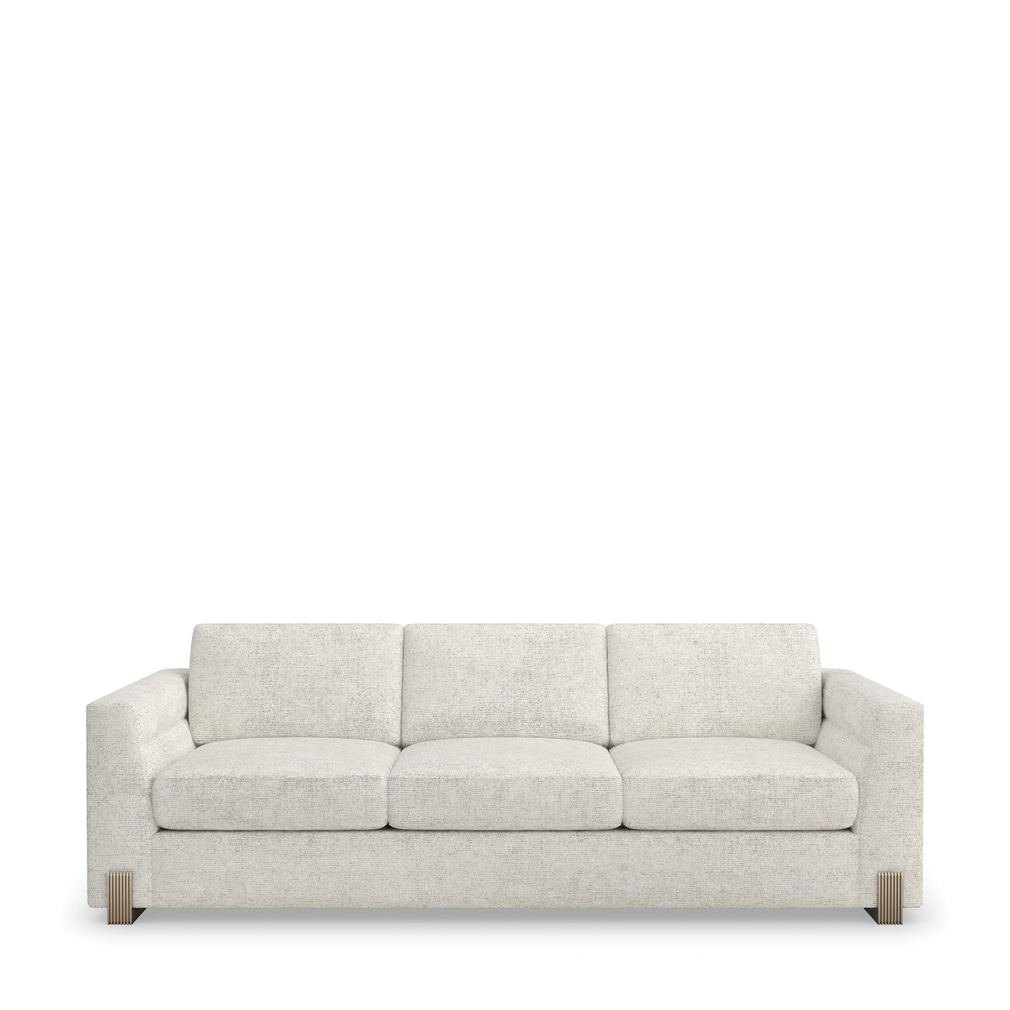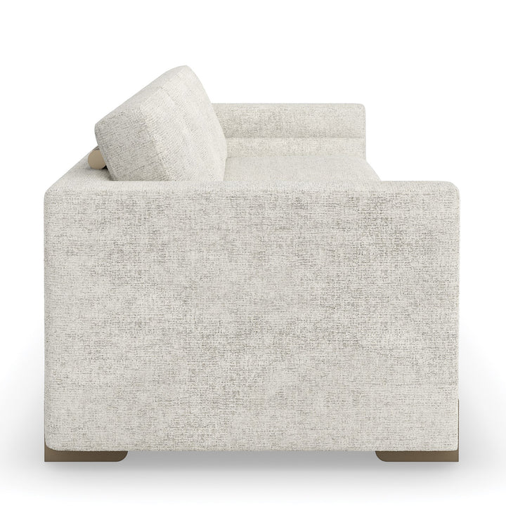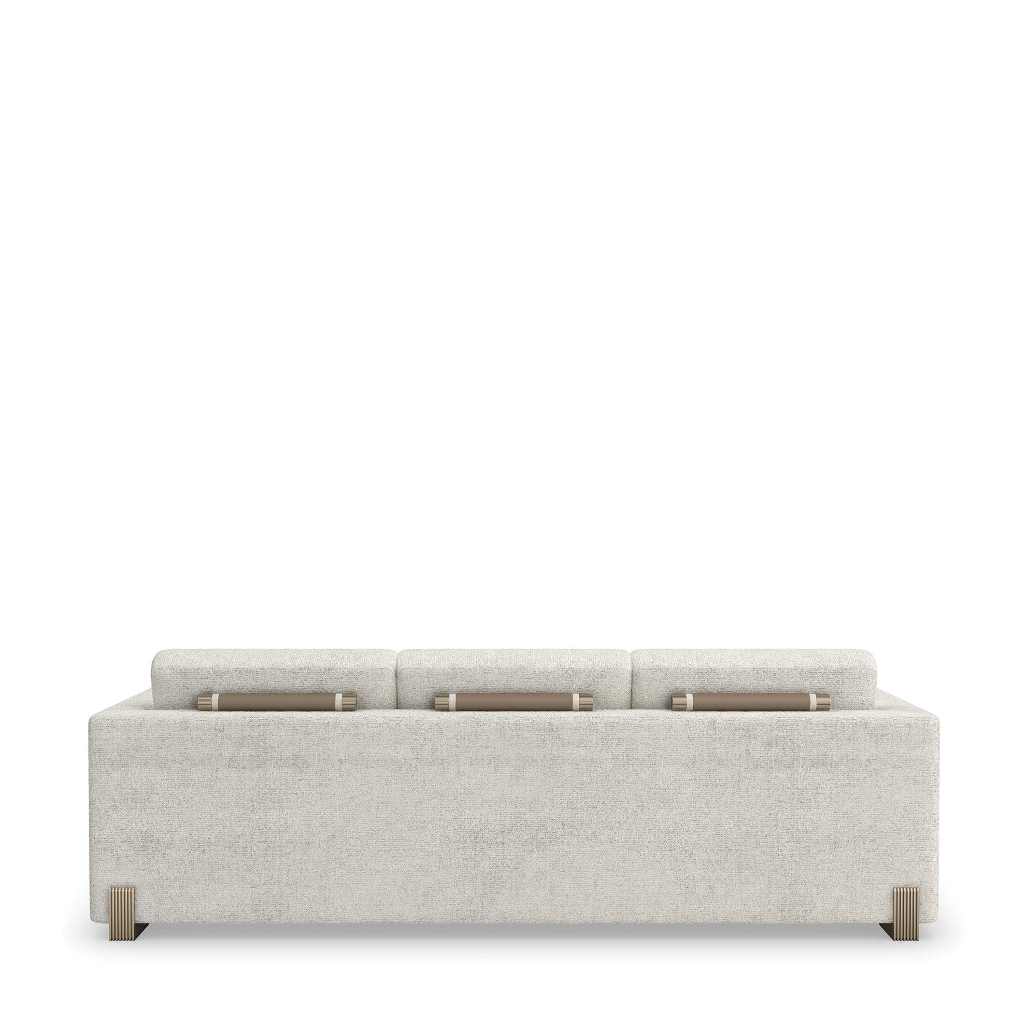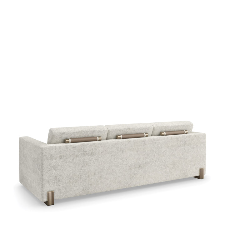 Designed to be a focal point of your space, the Counter Balance Sofa boasts a perfect equilibrium of form and function. A box-shaped form wrapped in soft fabric provides a heavenly feel when you sit on it. Its channeled-tuned arms add depth and dimension to its understated style. Amp up its look with decorative rods behind the top cushion and reeded cast legs coated in Champagne Gold to harmonize its exquisite design.