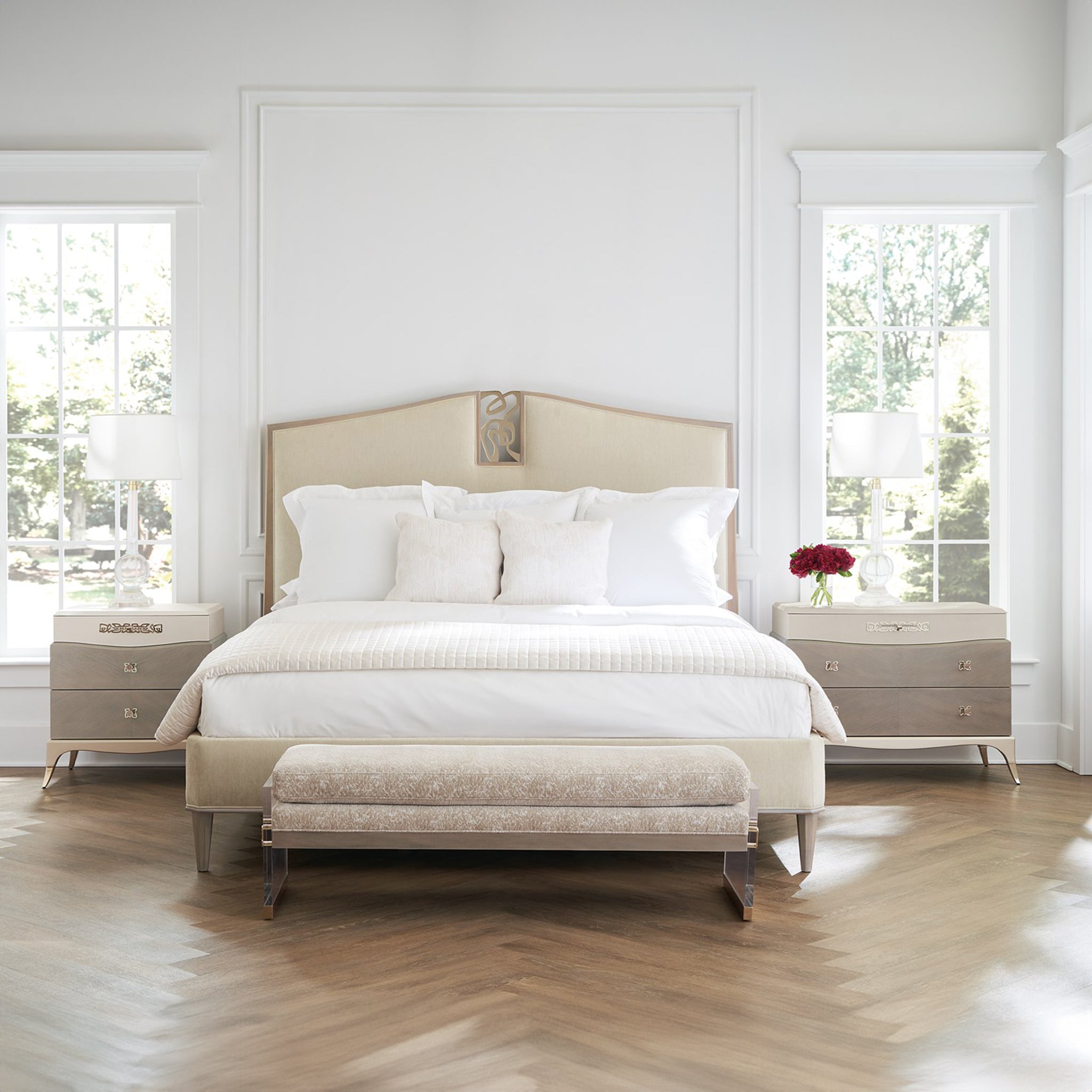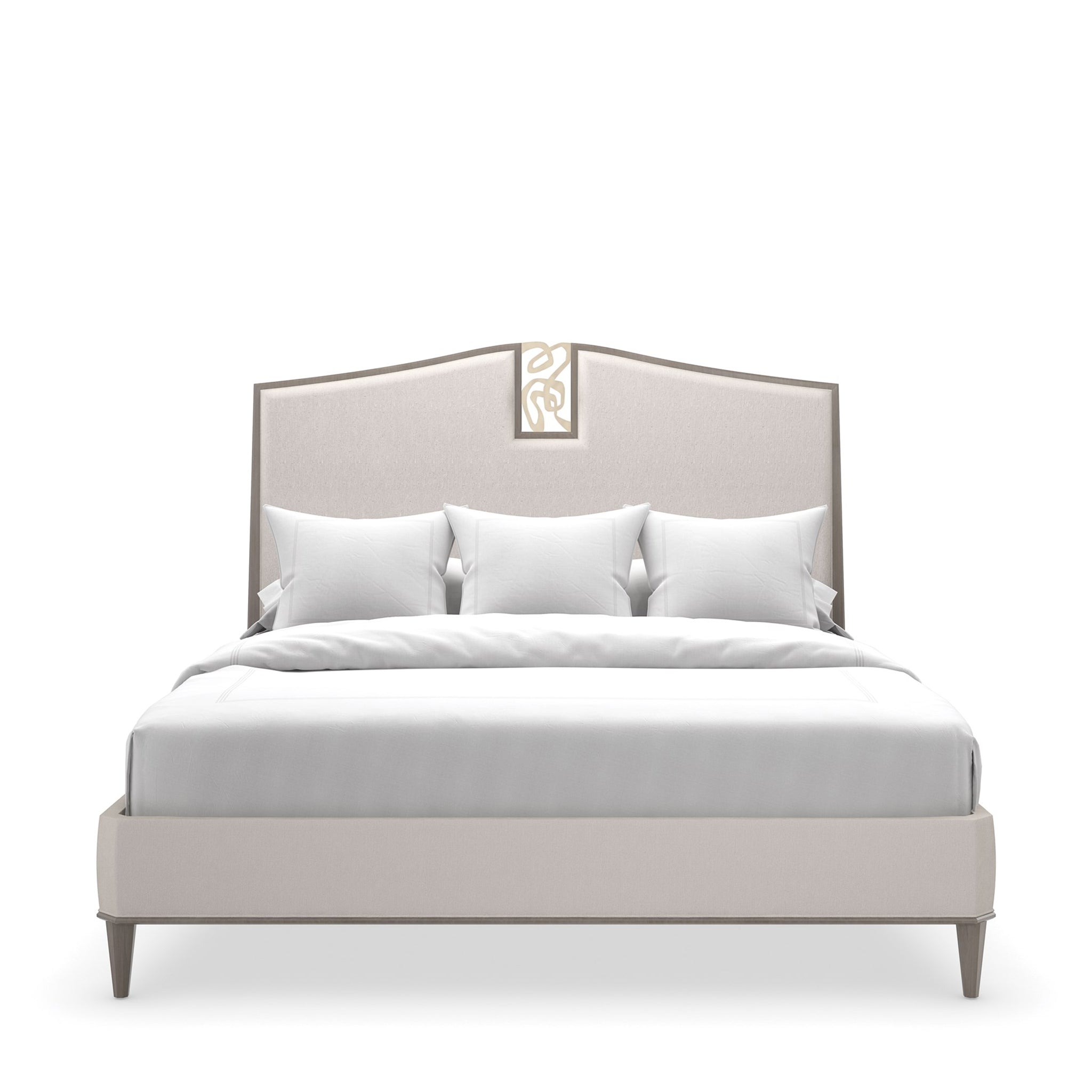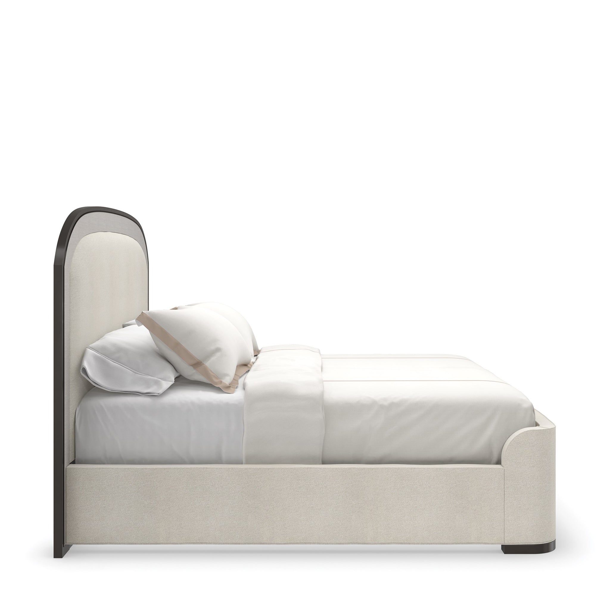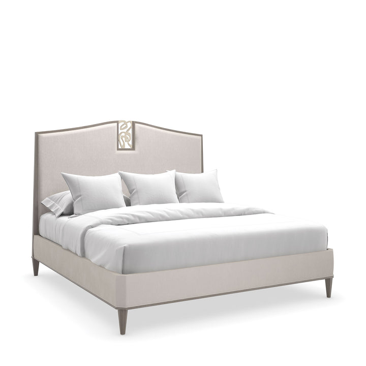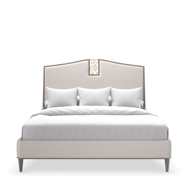 Dive into dreamland with its fully upholstered headboard, footboard, and siderails, cocooning you in chic vibes. Its headboard takes center stage with a decorative inlay in the whimsical Whisper of Gold. The exposed wood trim and feet in Cappuccino Stain add a touch of warmth. This piece is where dreams are as stylish as your waking moments!