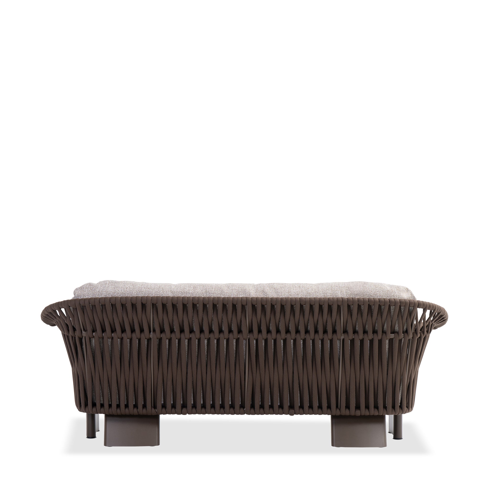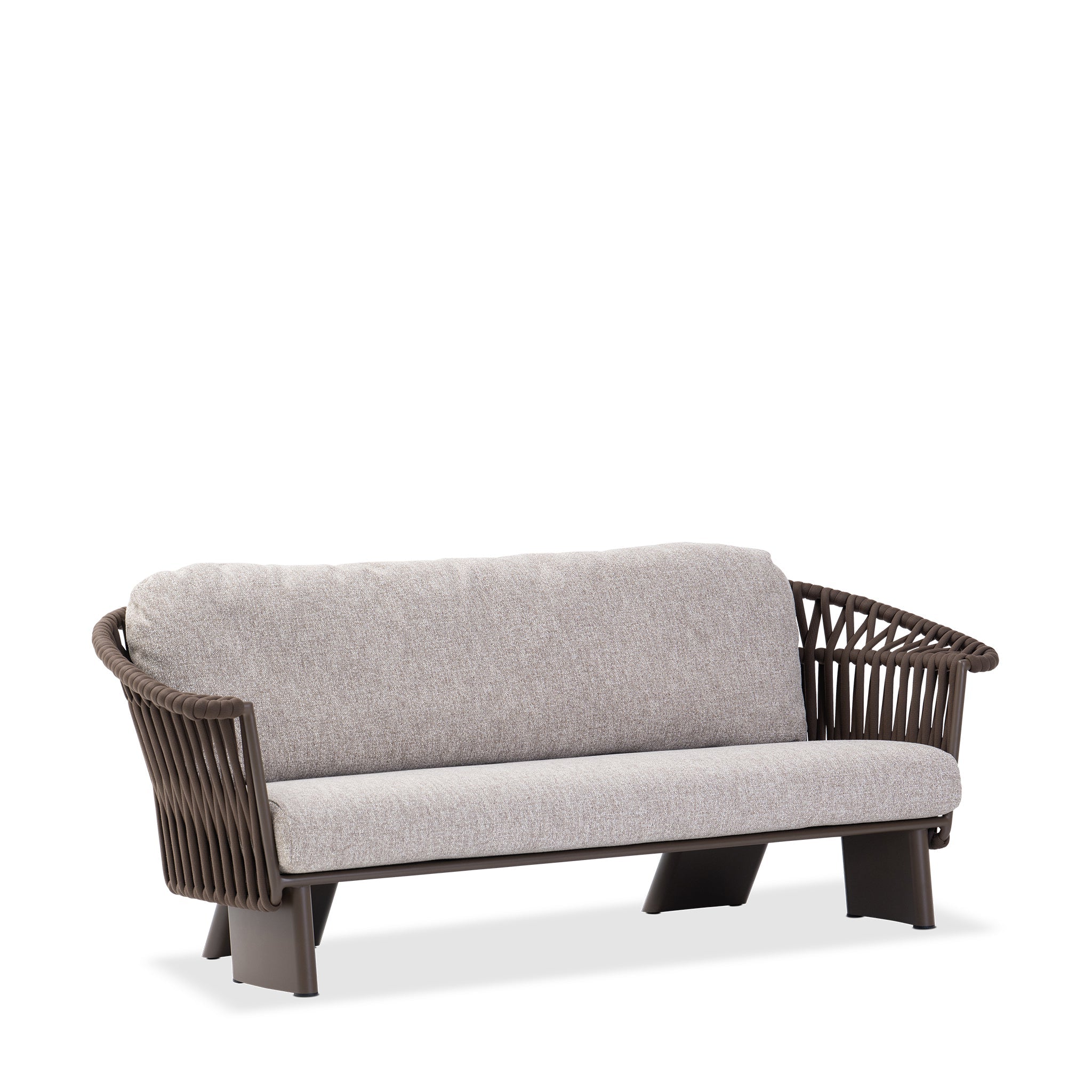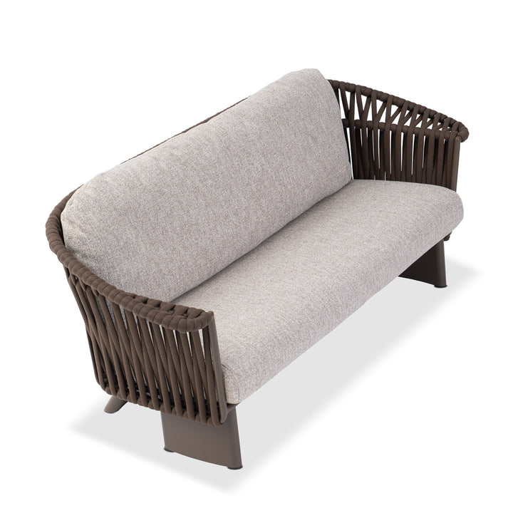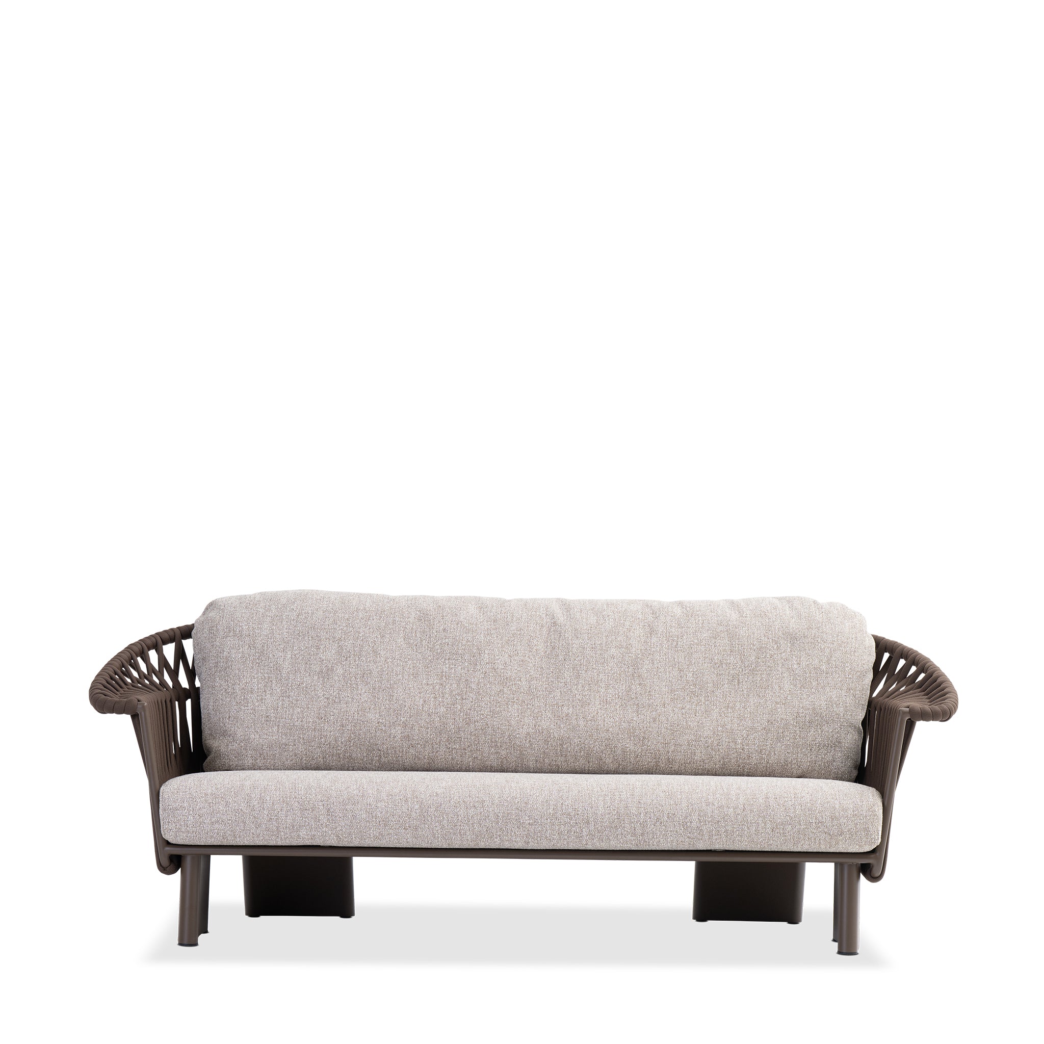 The 3-seater sofa makes a refined statement in outdoor living. Wrapped in rich, chocolate-toned cocoa fabric, it resists the elements with effortless style. A powder-coated aluminum frame supports plush quick-dry cushions, while the sculptural mocha weave, a wide vertical rope detail, adds tonal texture. Thick, structured legs in aluminum anchor the piece with bold, architectural stability.
