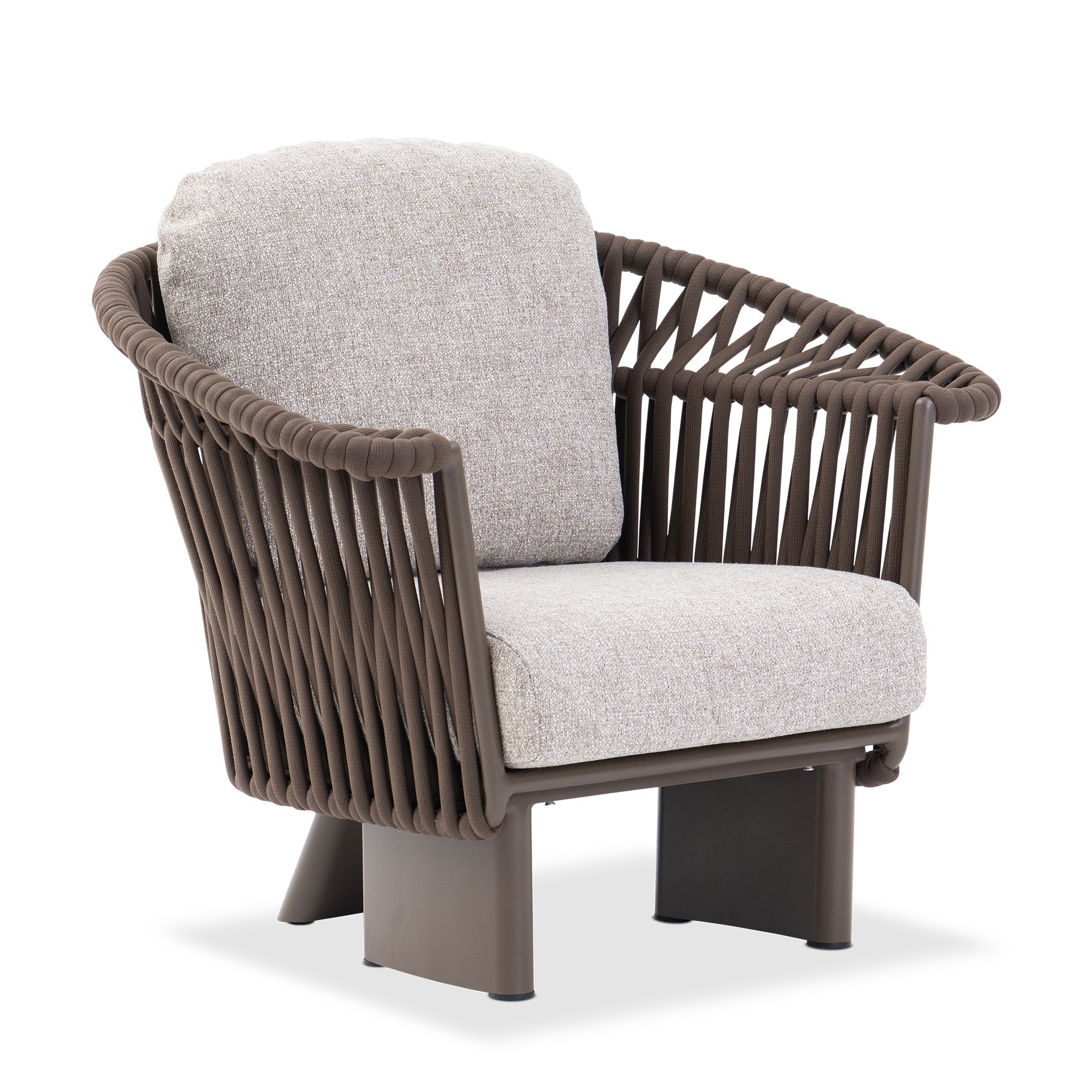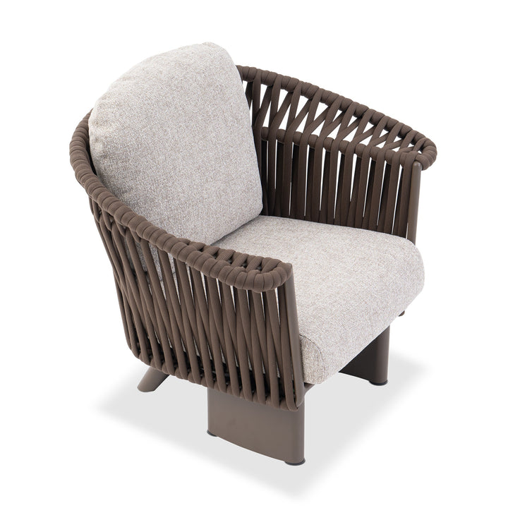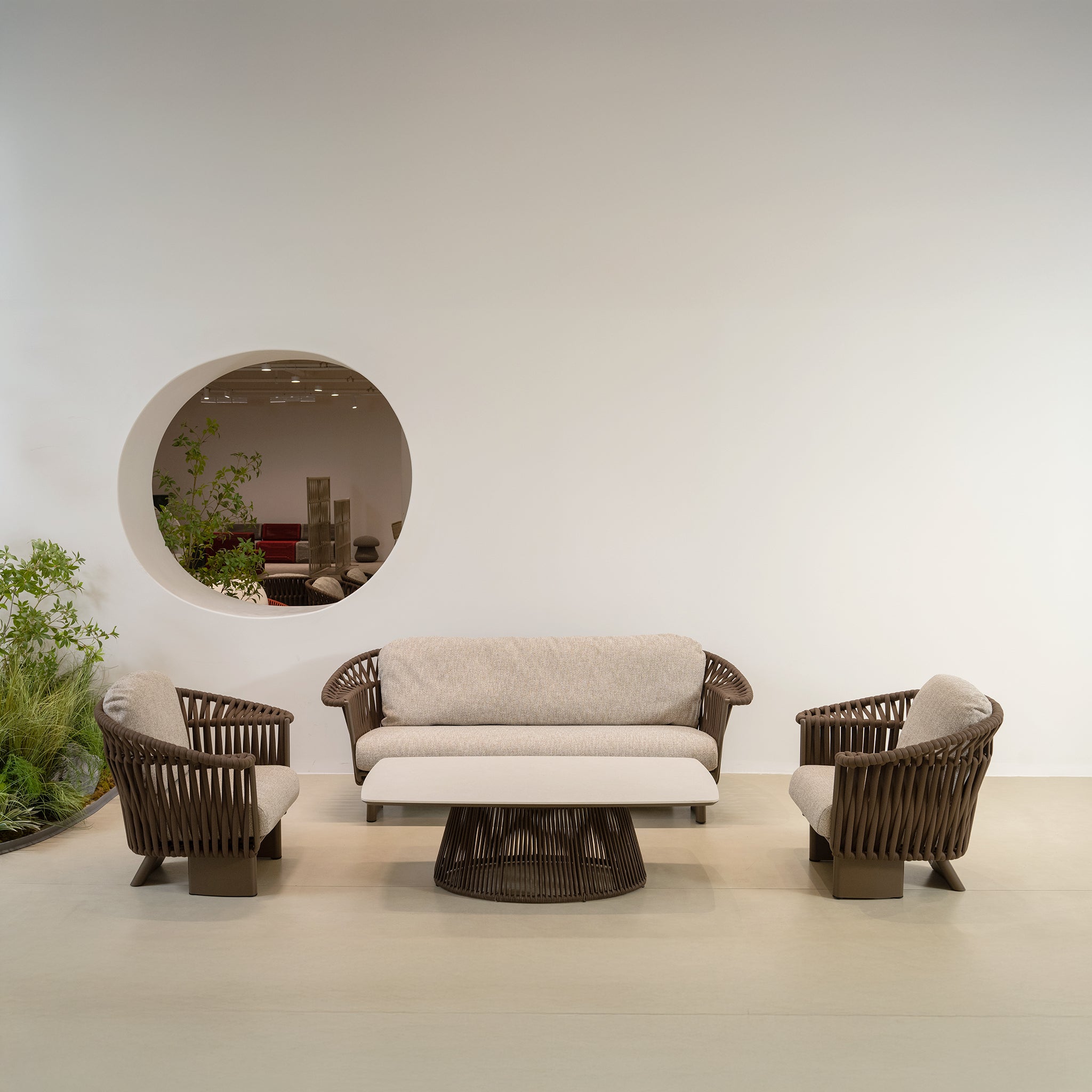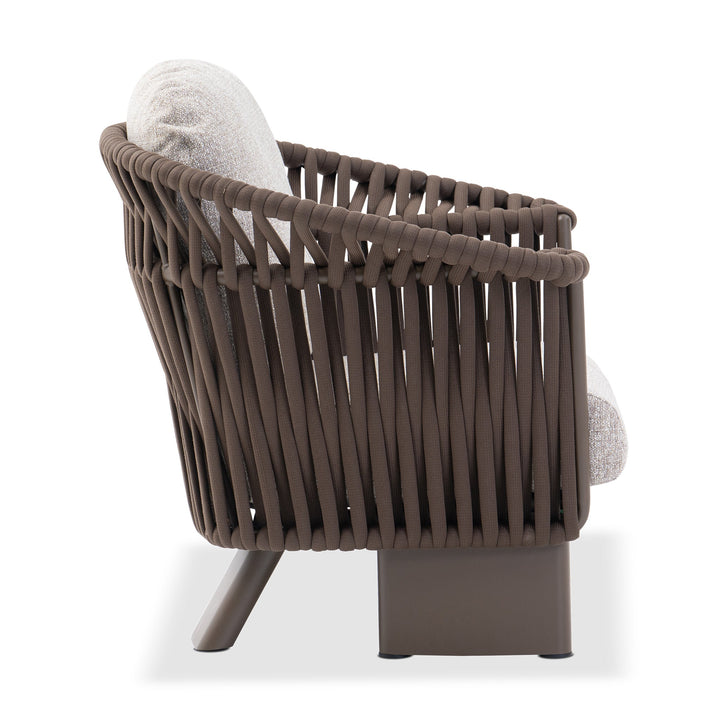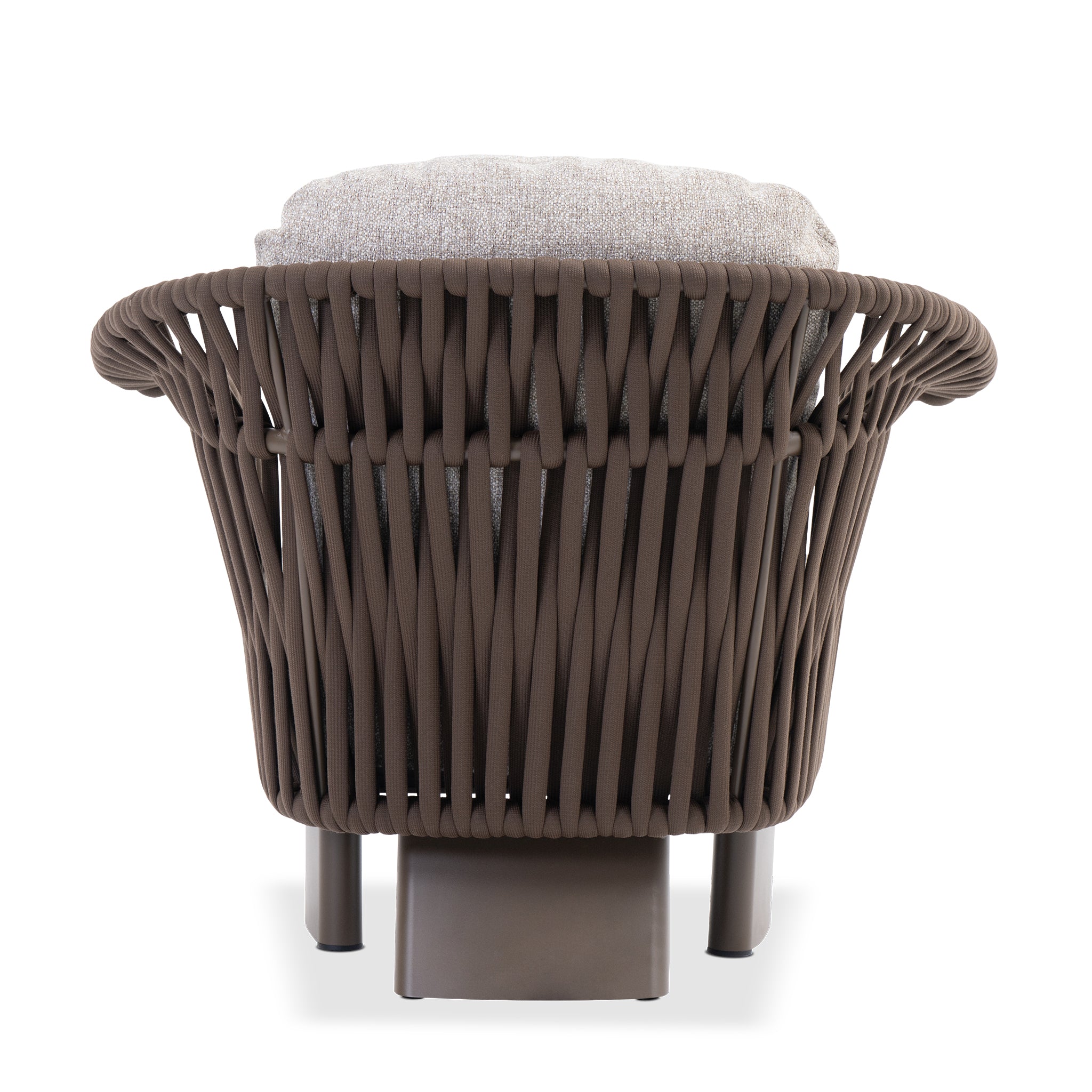 The crown armchair extends the collection’s sculptural aesthetic in a compact, commanding silhouette. Wrapped in the same chocolate-toned cocoa fabric and supported by a powder-coated aluminum frame, it offers plush, quick-dry cushions designed for enduring comfort. The signature mocha weave and bold, architectural legs mirror the 3-seater’s design language, delivering visual continuity with standalone appeal.