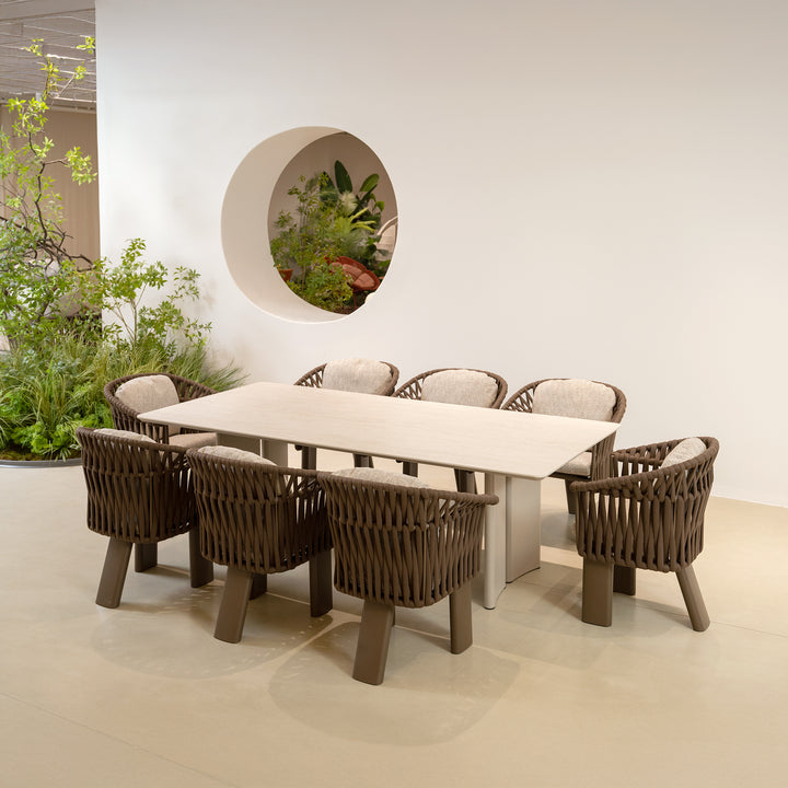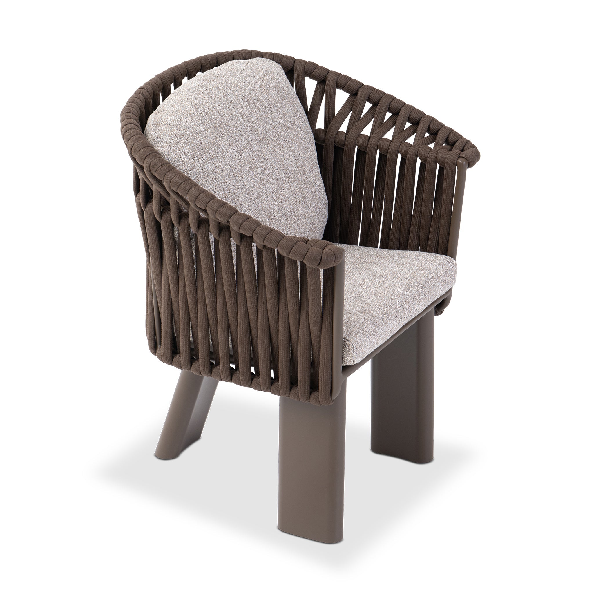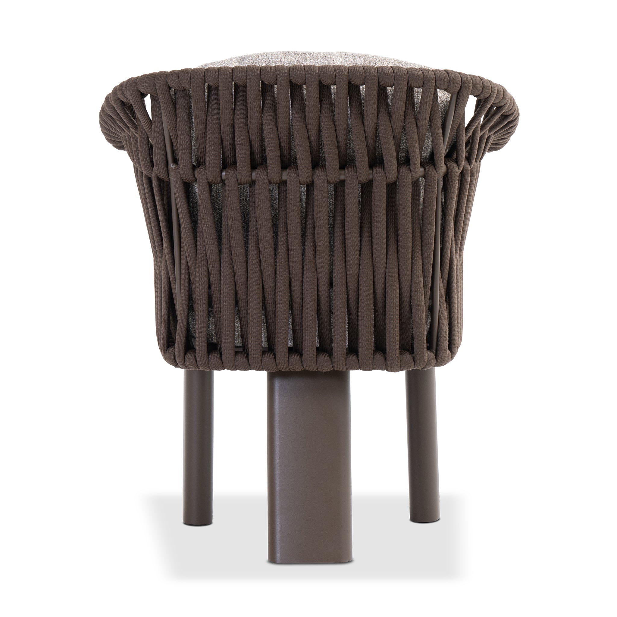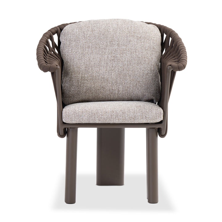 Upholstered in chocolate-toned cocoa fabric and supported by a powder-coated aluminum frame, it offers plush, quick-dry cushions designed for enduring comfort. The signature mocha weave and sculptural legs lend a grounded elegance that seamlessly ties into the crown collection.