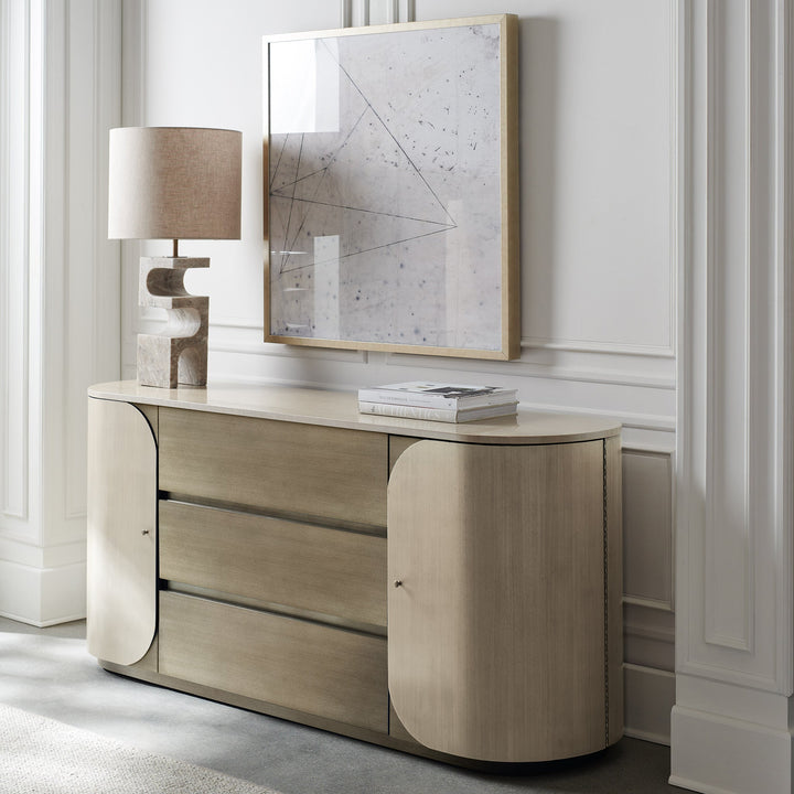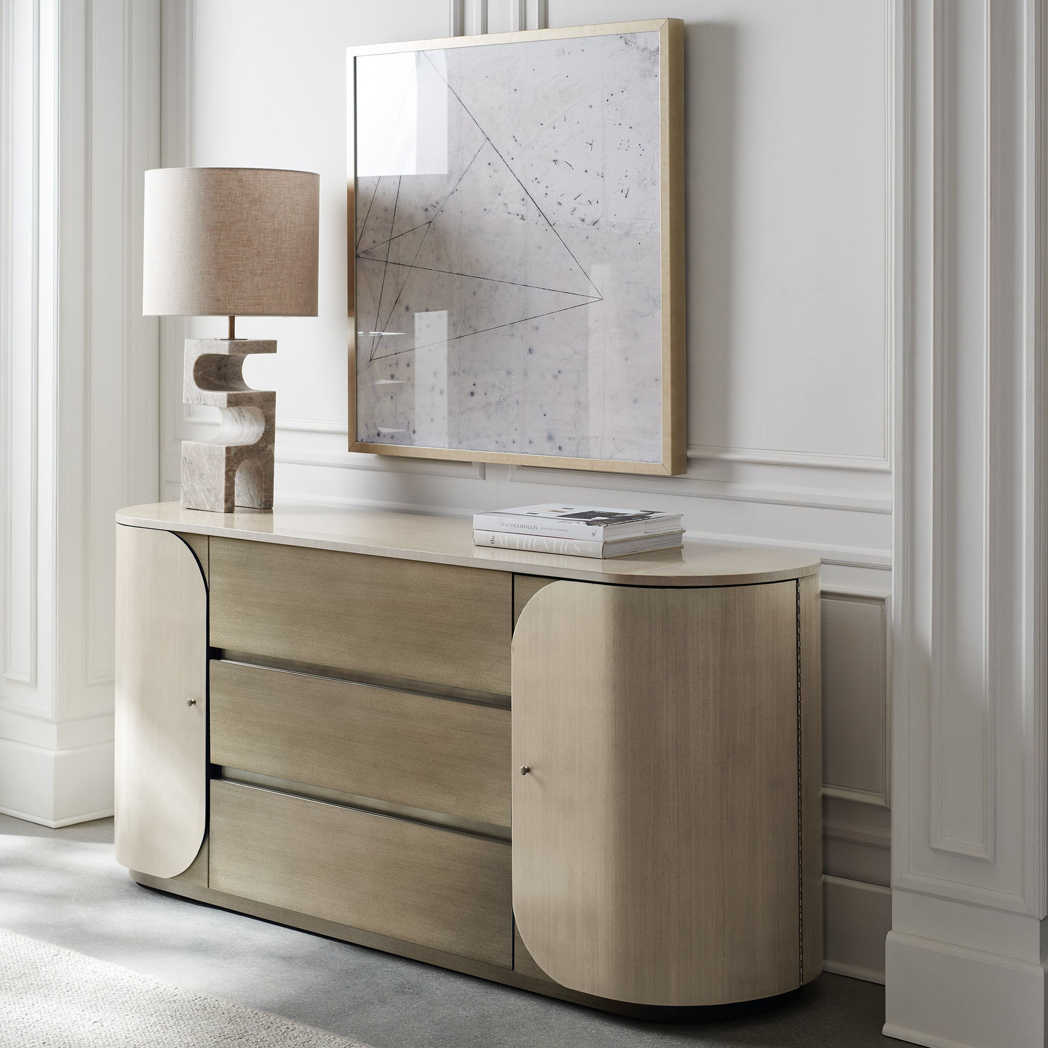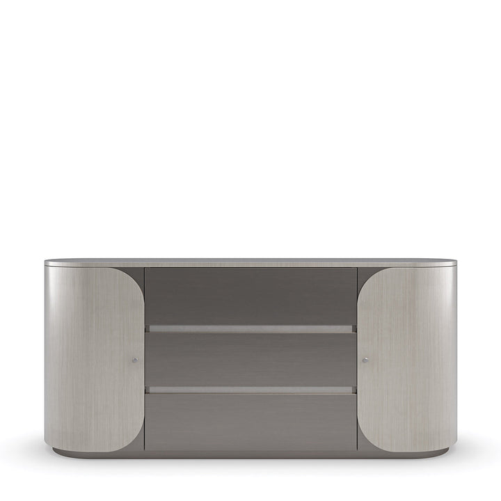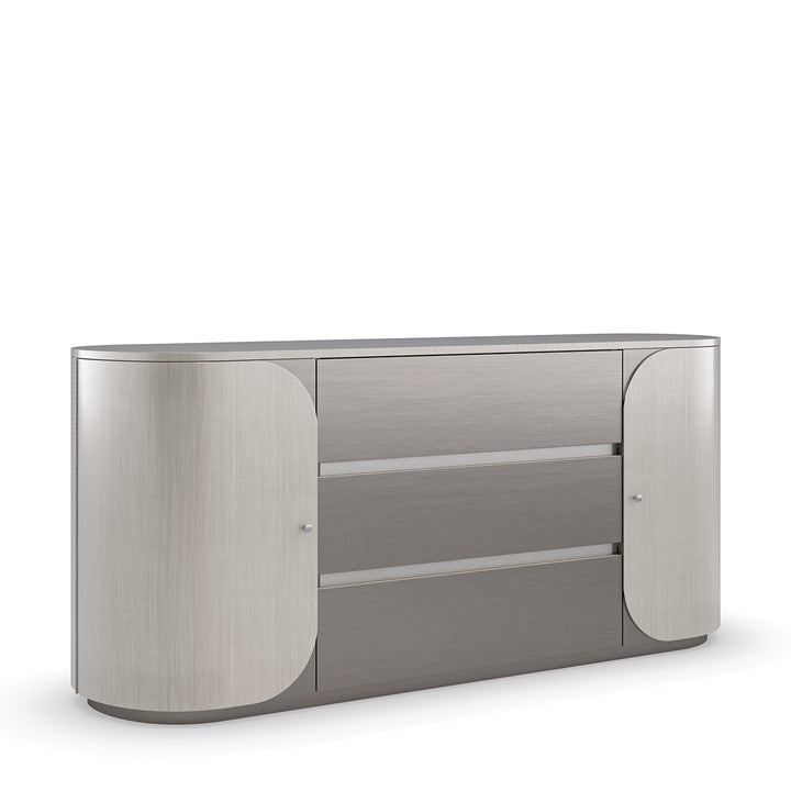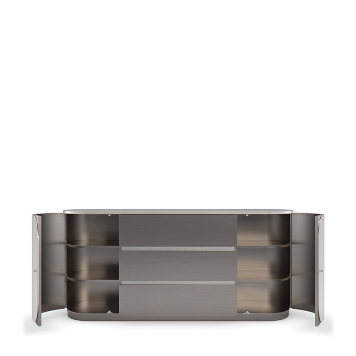 Flaunting refined lines and curves—this elegant dresser will surely be the focal point of your bedroom. Its oval-shaped form houses three soft-closing drawers finished in Smoked Stainless Steel Paint, while its two Thunder-coated doors conceal adjustable shelves. Take a peek into its storage and be enthralled by the interior's Cream Paint and Smoked Stainless Steel Paint finish.