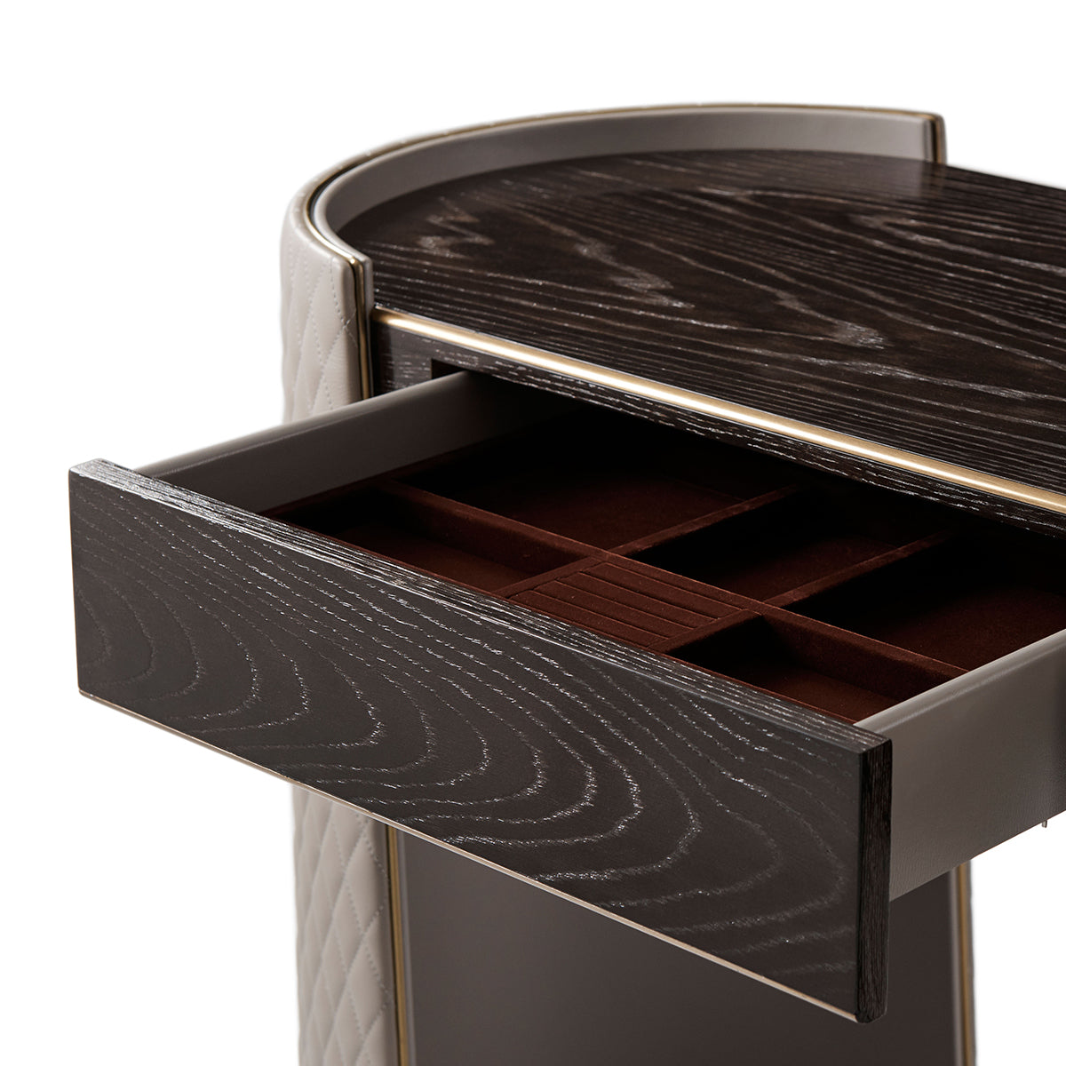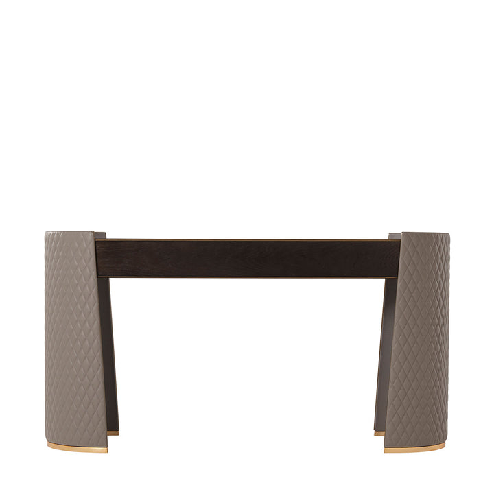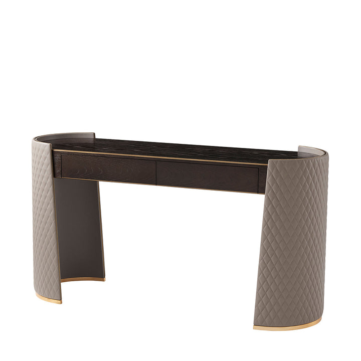 A royal style-oriented Devona dressing table is irresistibly your favorite spot to dwell peacefully. A rectangular designed bronze finish crown oak veneered top with brass molding gleams the exquisite borders. Two slide-out drawers store your beauty etiquettes sufficiently. A crescent-shaped waterfall descent base frame is supportive and attractive with diamond geometric pattern leather and striped brass finish.