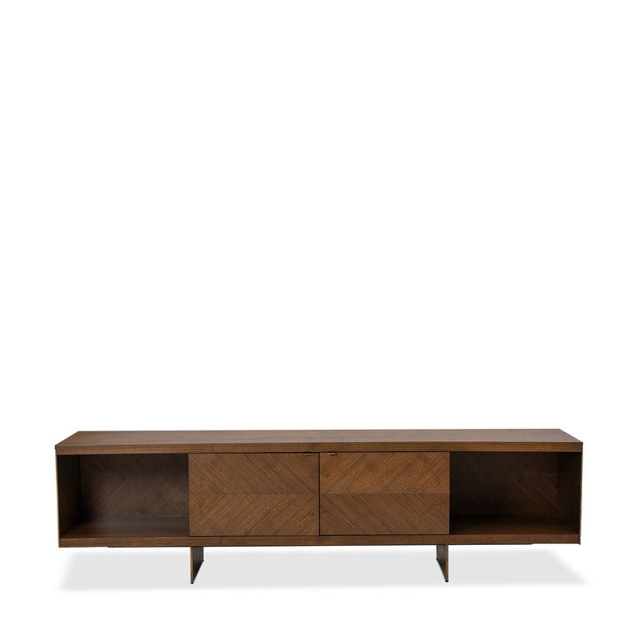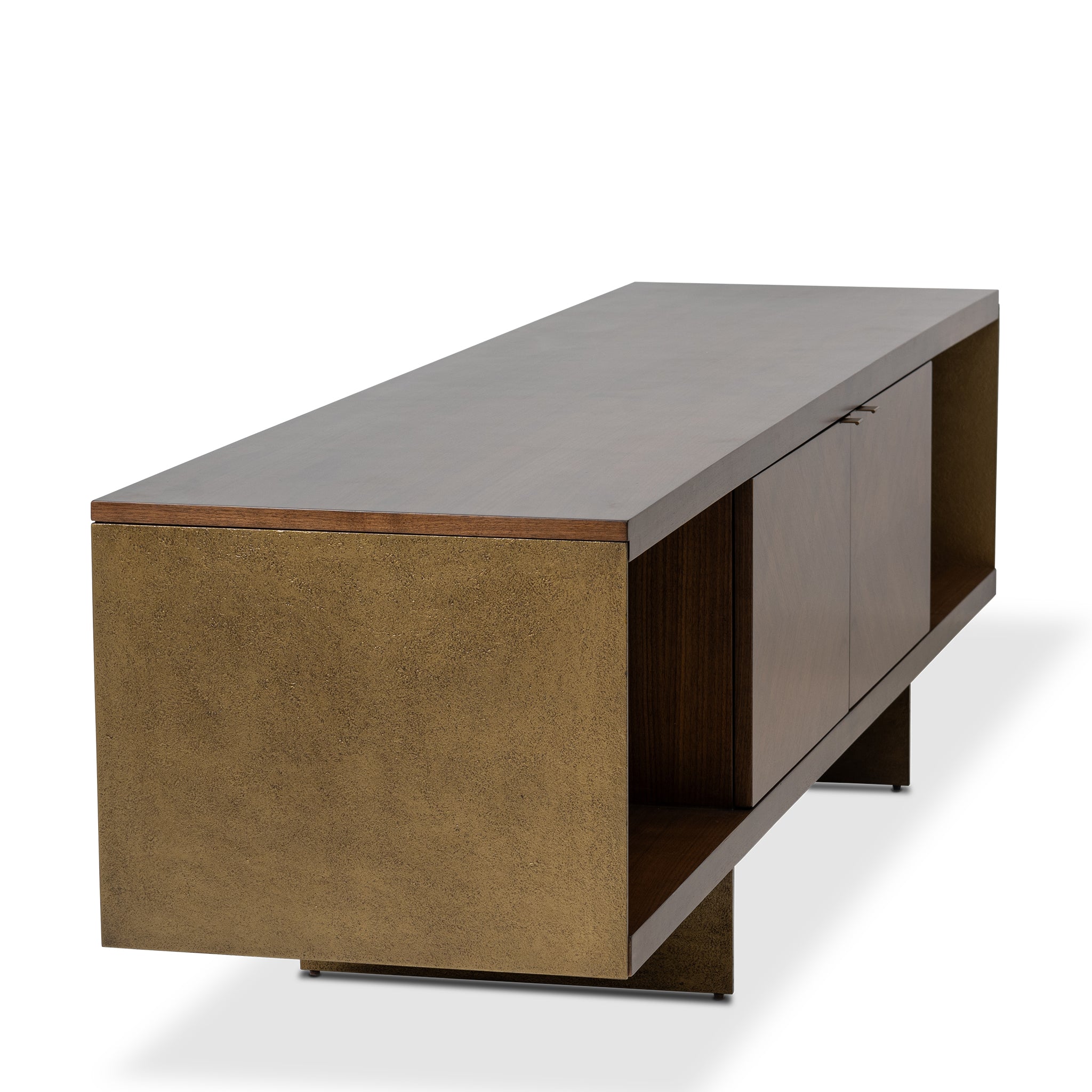 The chevron walnut design brings a natural and stylish look to this cabinet. Antique brass details add a touch of contrast, while flat pulls keep the design clean and modern. With both open shelves and closed storage.