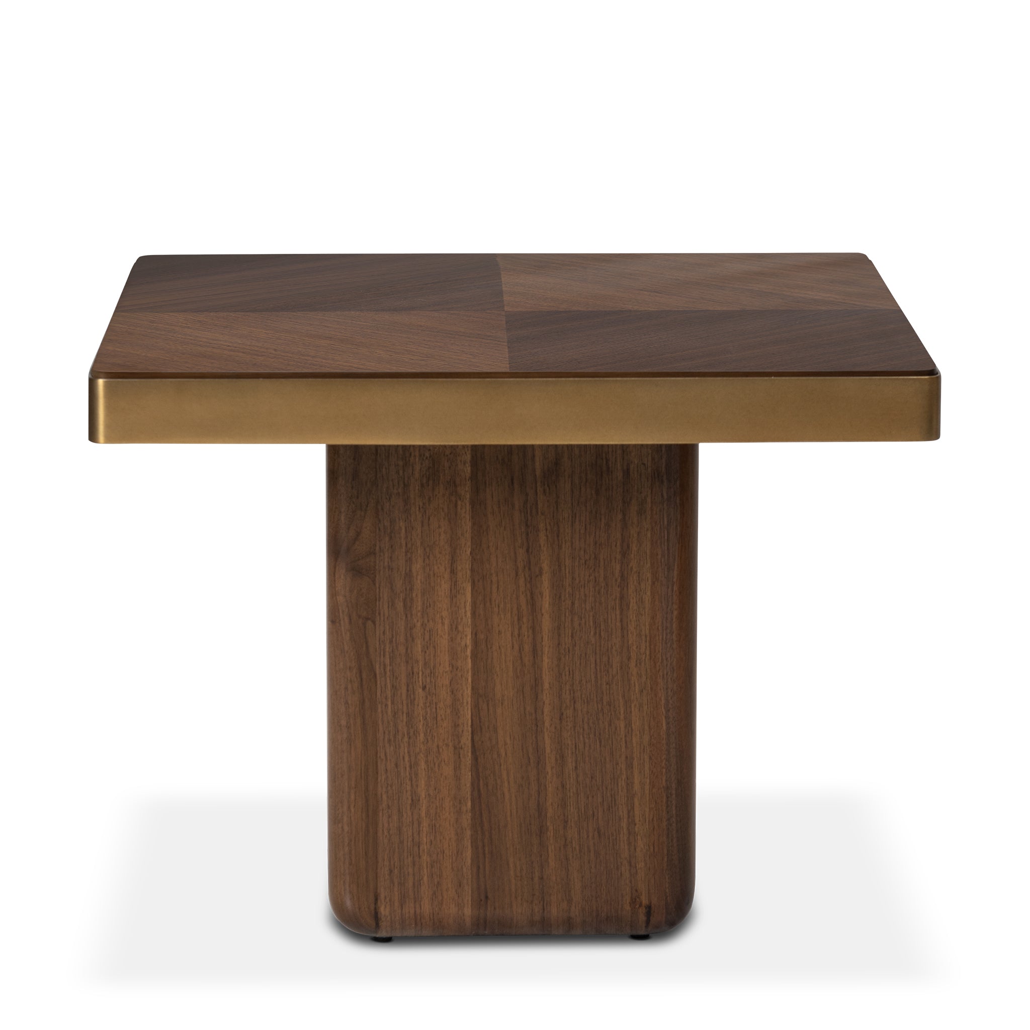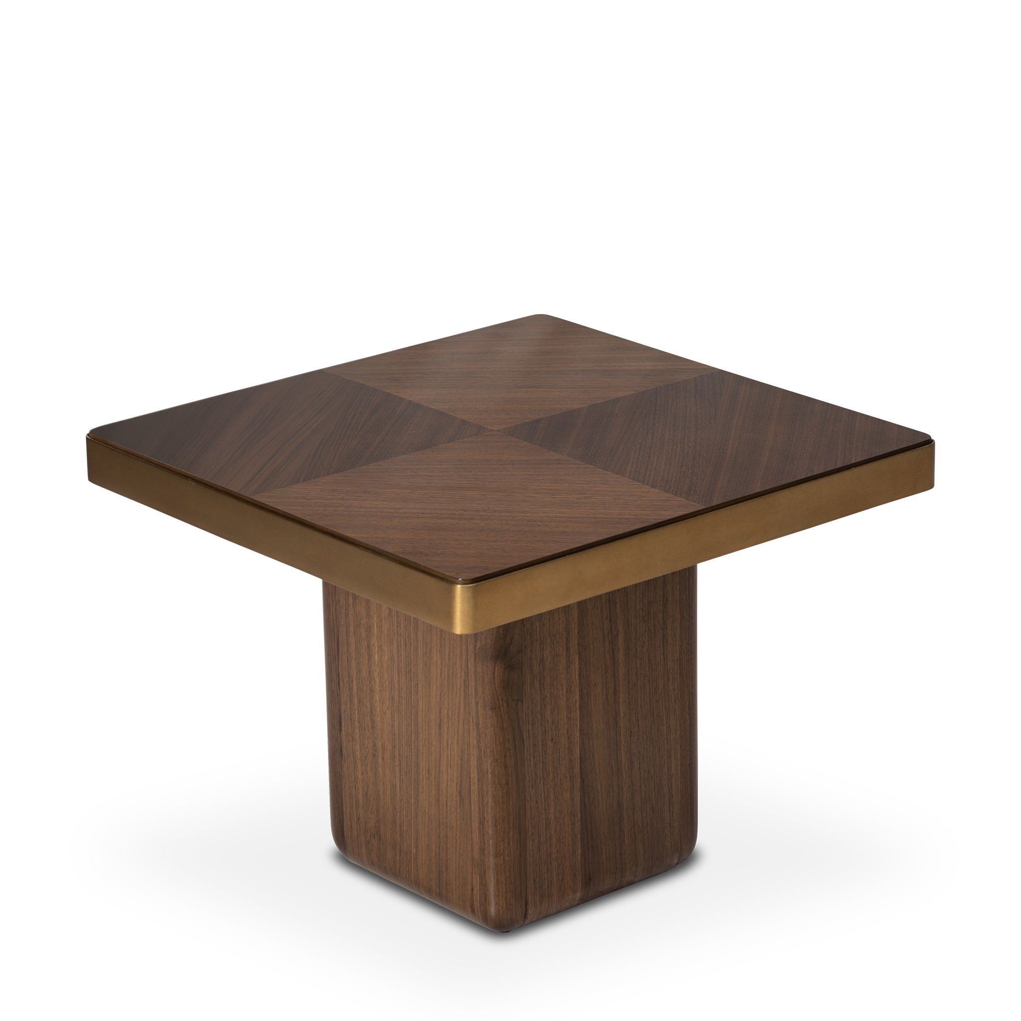 A bold square silhouette showcases warp marquetry on top in midtone walnut, highlighting the natural beauty of the veneer. A brushed antique brass band frames the top, adding depth and contrast to the design.