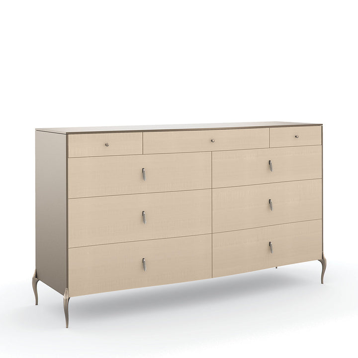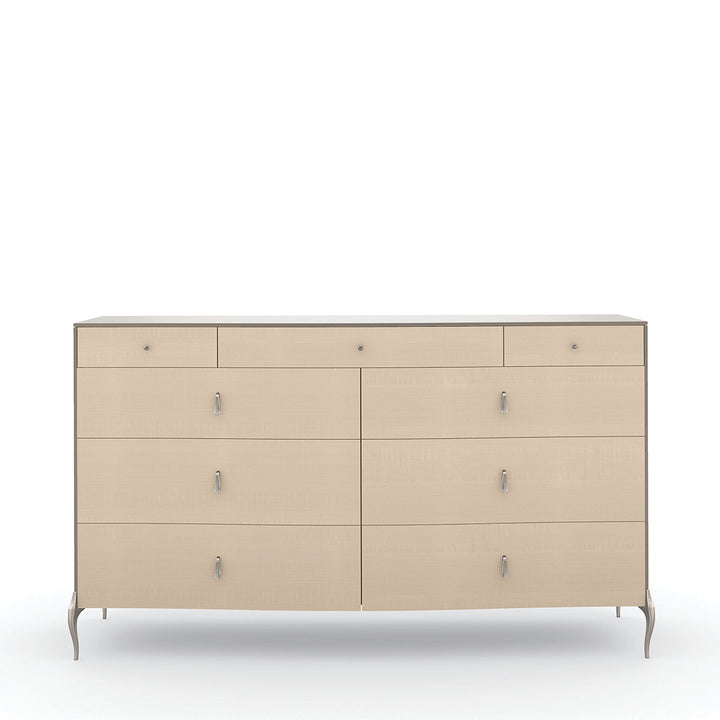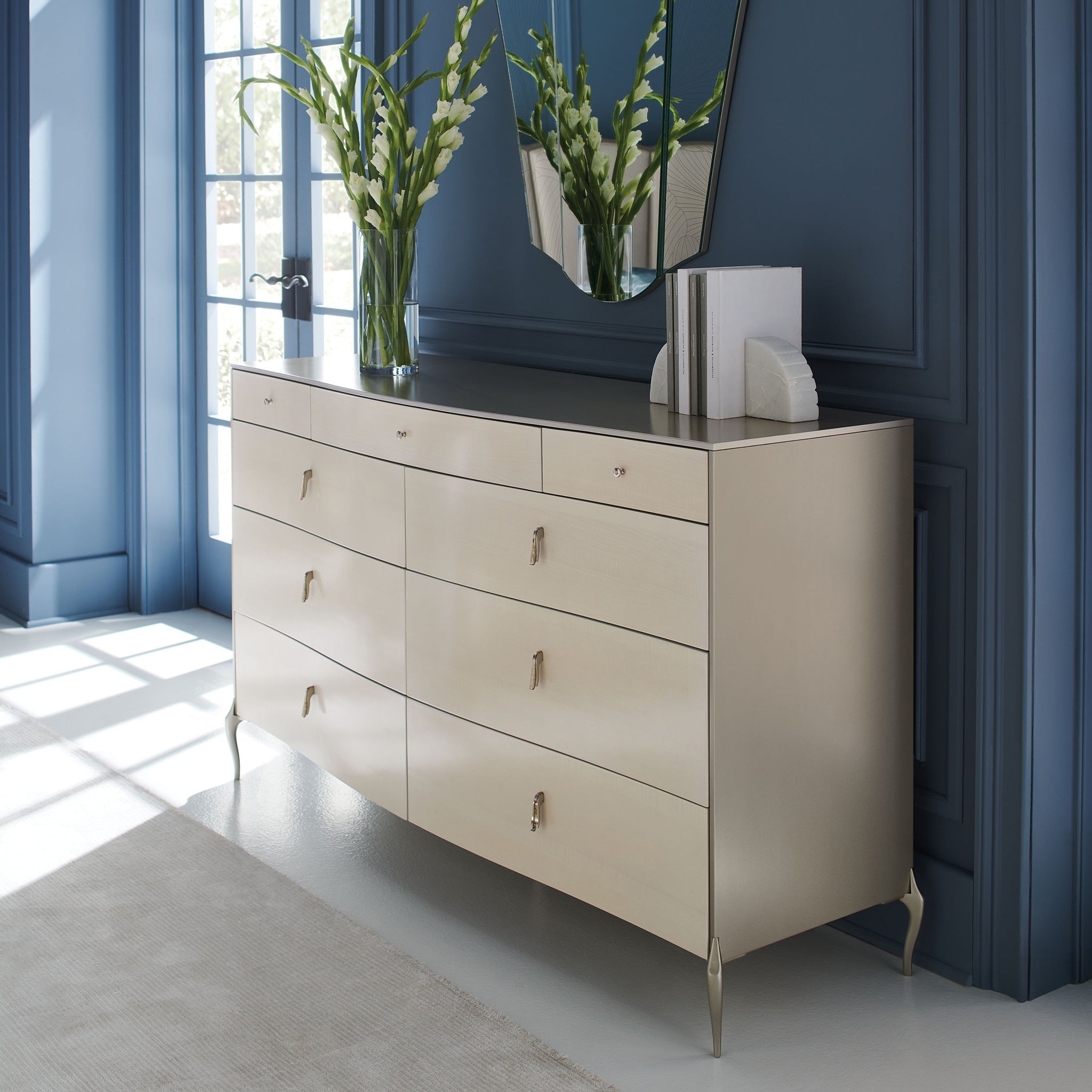 Poised to make an elegant first impression, this generous dresser introduces a refined mix of natural materials, with soft color palettes and a shimmering silver finish. Features nine soft-close drawers with fronts in Vanilla Cream, a soothing contemporary finish that brings to light the decorative character of figured sycamore. Elongated drawer pulls, inspired by an Art Deco jewelry pendant with a faux stone center, add a touch of grace. Ornate metal legs mimic flowing lines and a subtly curved top in Soft Silver Paint. Two felt-lined drawers on the top left and right add a note of luxury to intricately painted interiors.