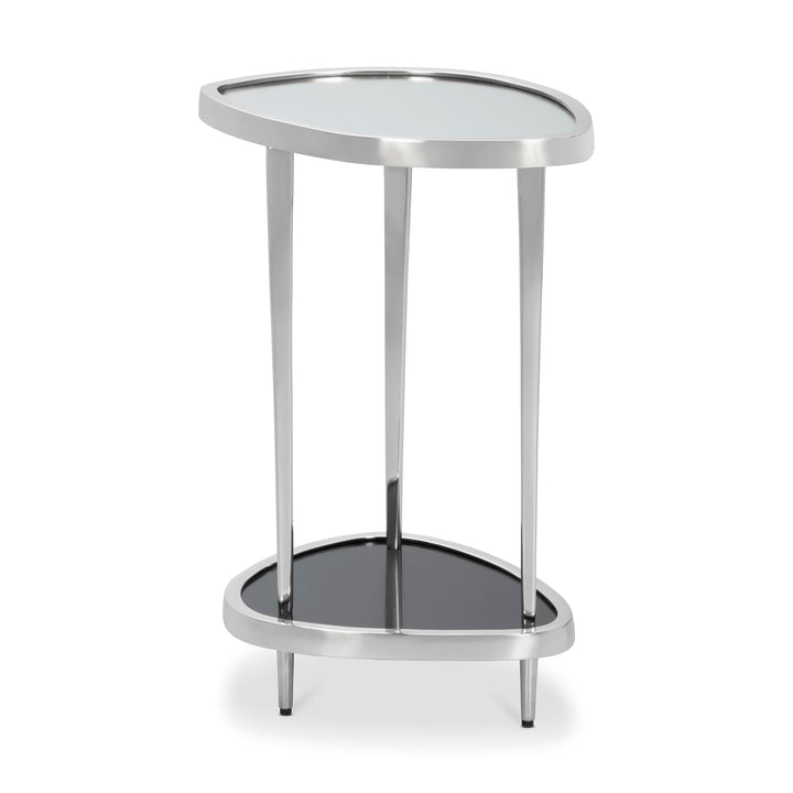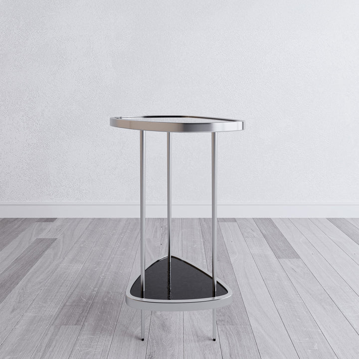 Defining excellence is the Earing Side Table—braced by three-legged Stainless Steel legs in Polished Nickel finish, displaying a sleek and durable image. Topped with a clear mirror that matches in shape with its lower Black Granite shelf, it is playfully encased in a metal frame for an overall seamless look. This piece is elegant and functional with an ear-like composition, which the name is inspired from.
