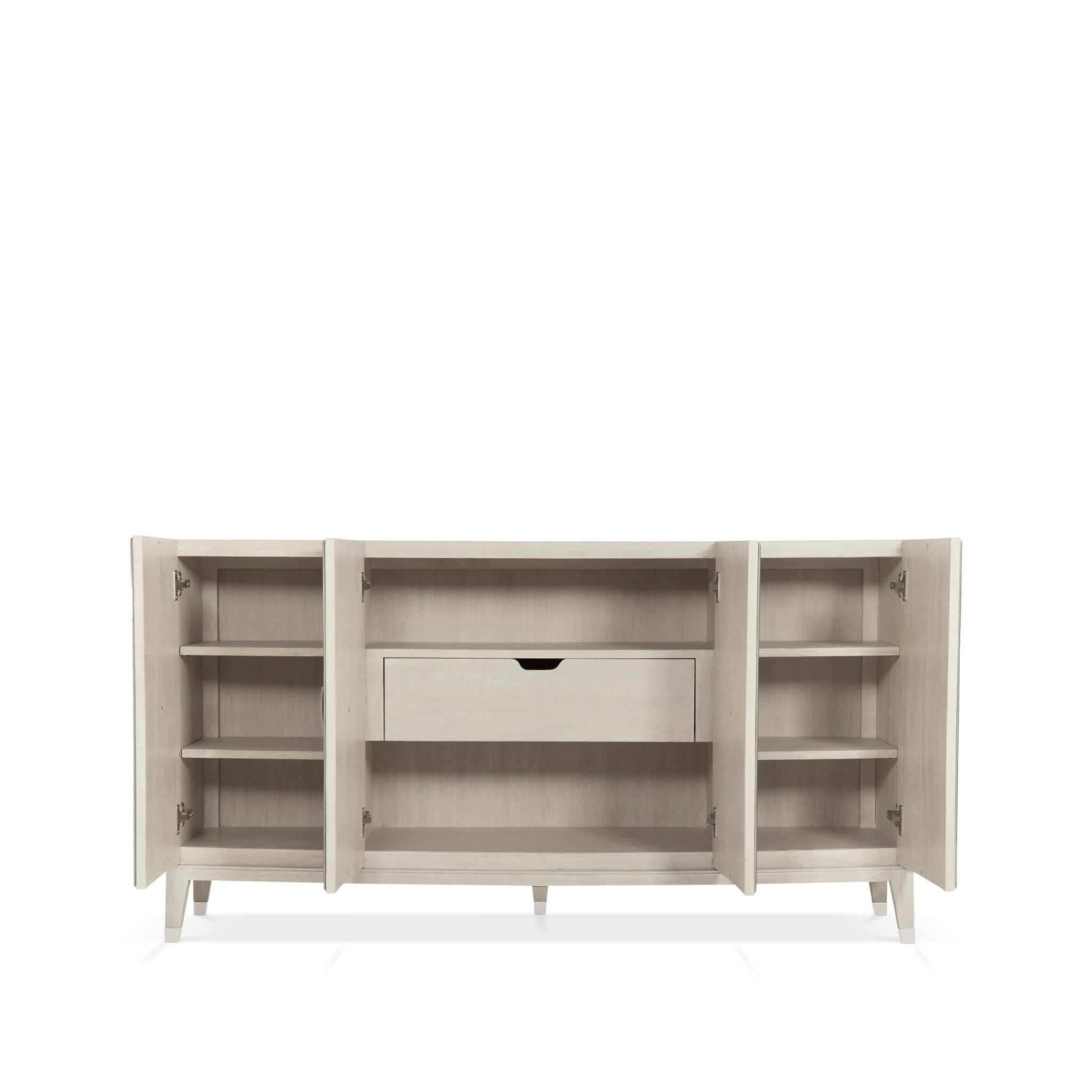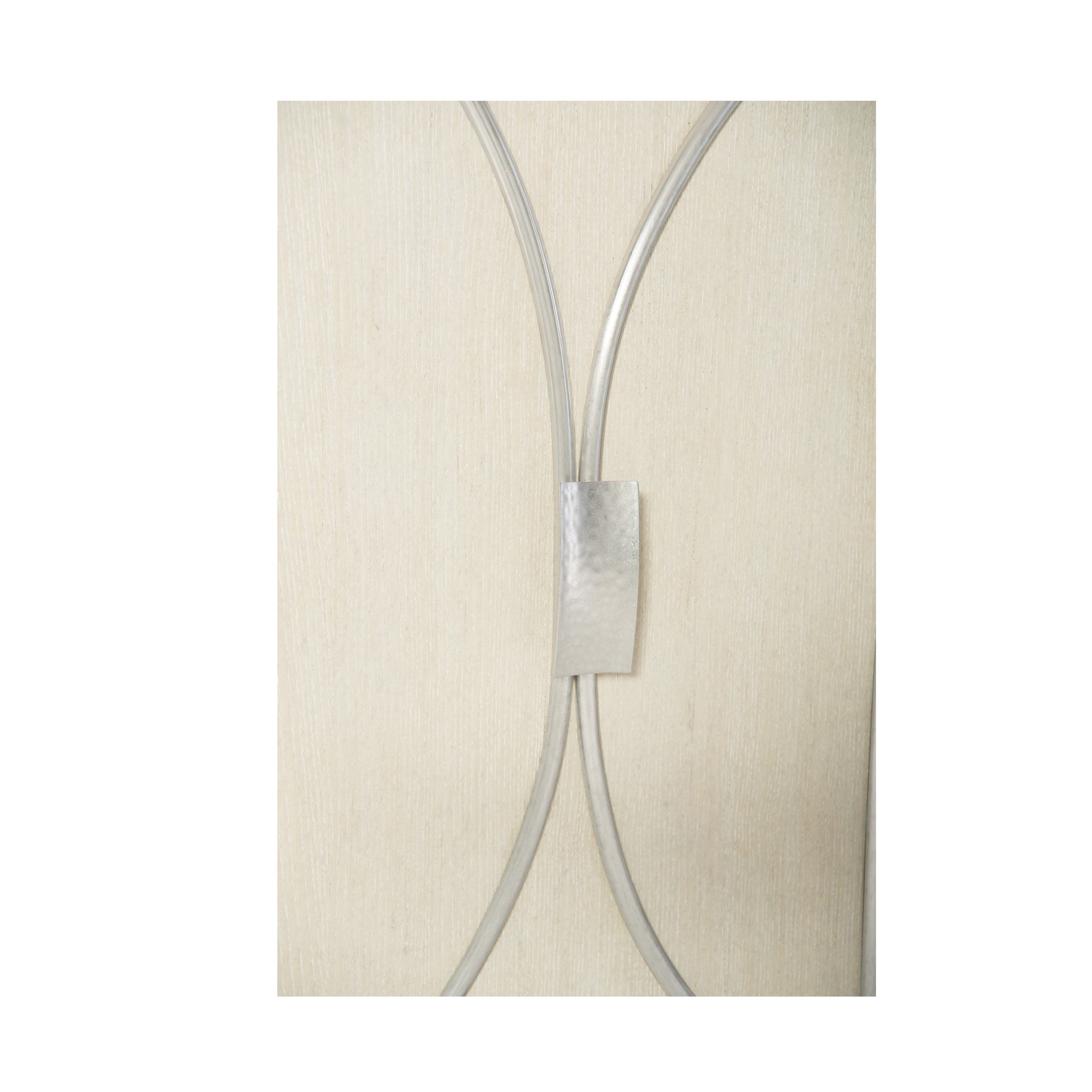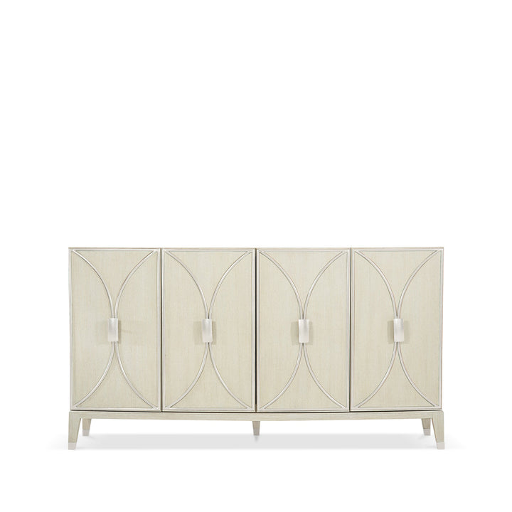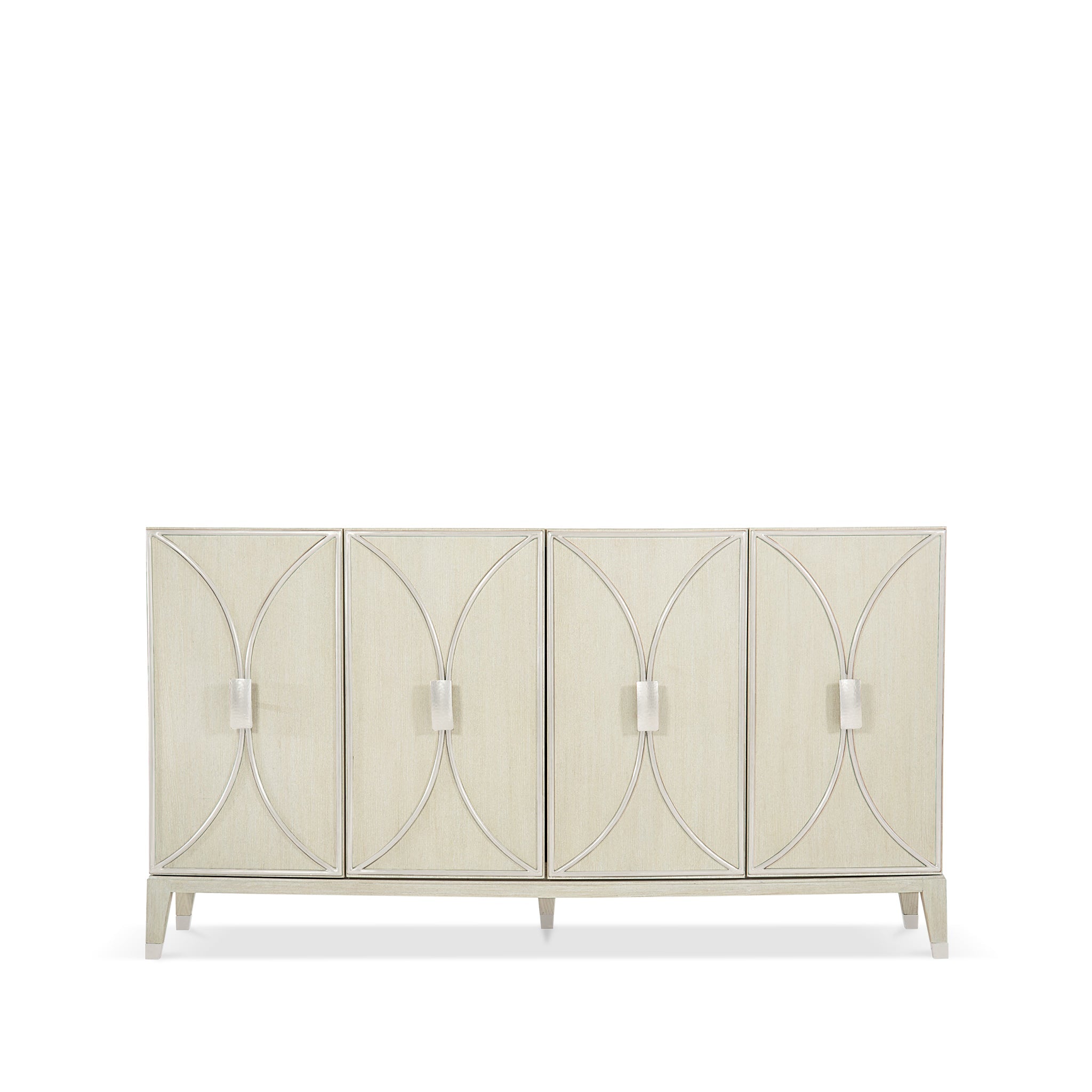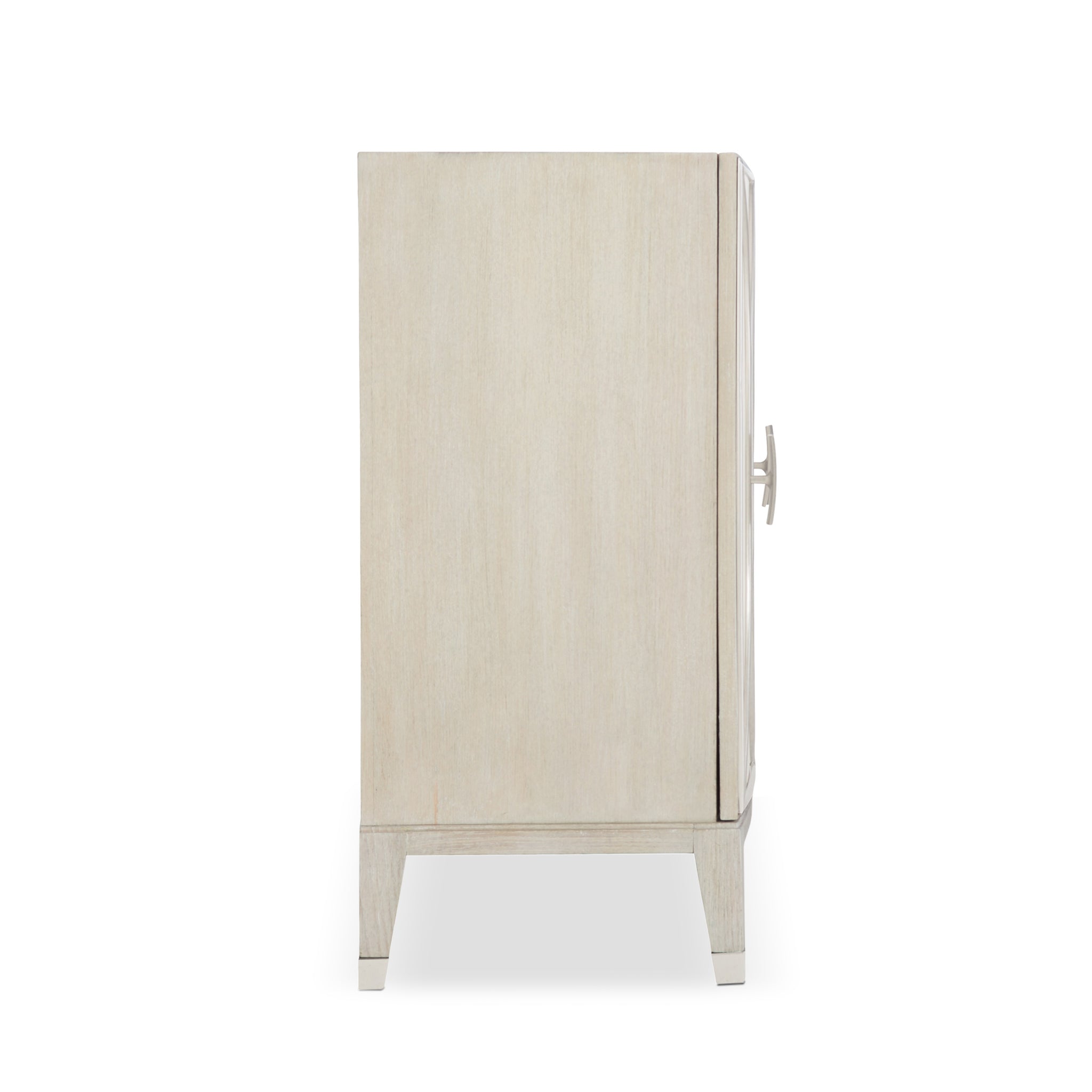 The interior of this furniture consists of six small compartments on both sides with adjustable racks. Besides, there are two long central sections on the top and bottom with the hand cut-out drawer and inset silverware. The Bowed case has four doors enhanced with a Cerused Linen finish and features Aged Silver finish metal-framed curves.