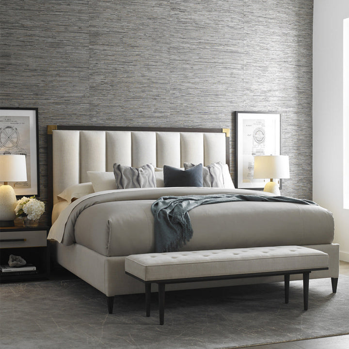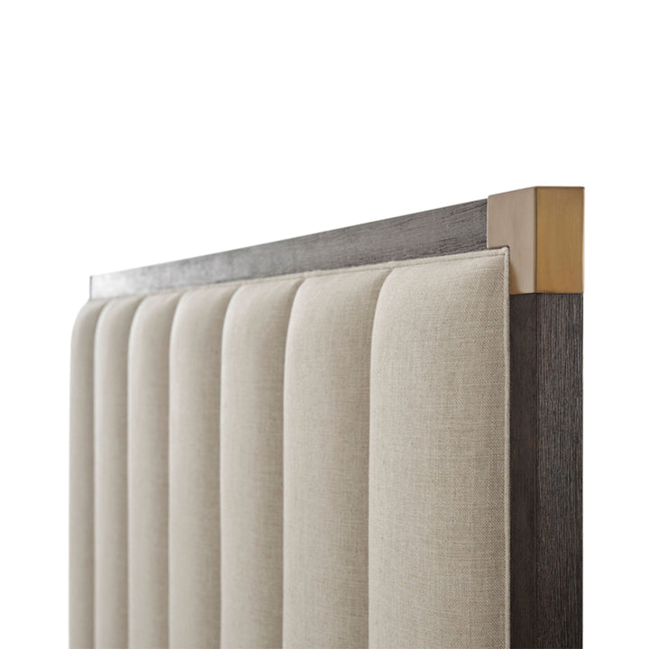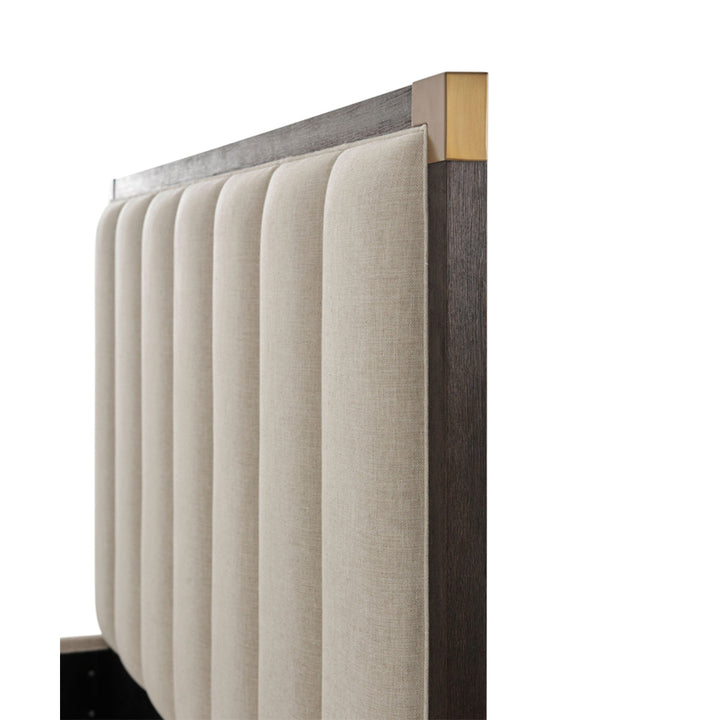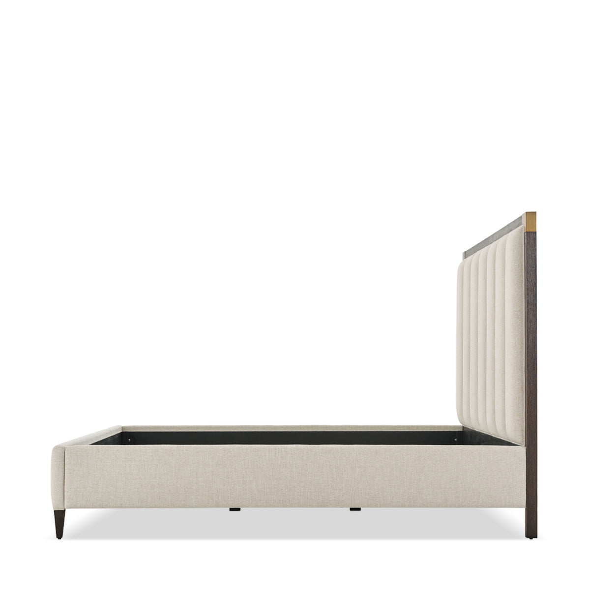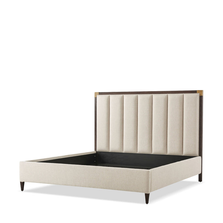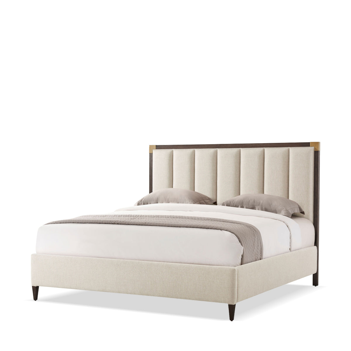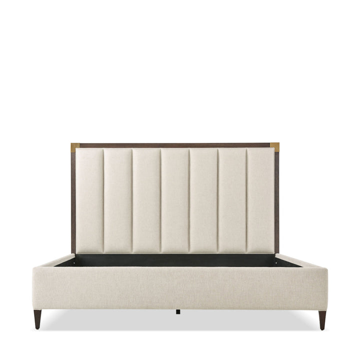 With a clean and sleek silhouette, the Embassy Bed in US King size is the epitome of comfort and style for your bedroom. The Cardamom finished frame with Brushed Brass corners complements the vertical channel stitching on the headboard. Completing the fine aesthetics are the tapered legs in the same finish.