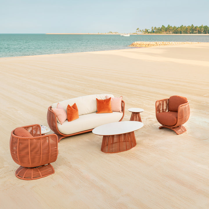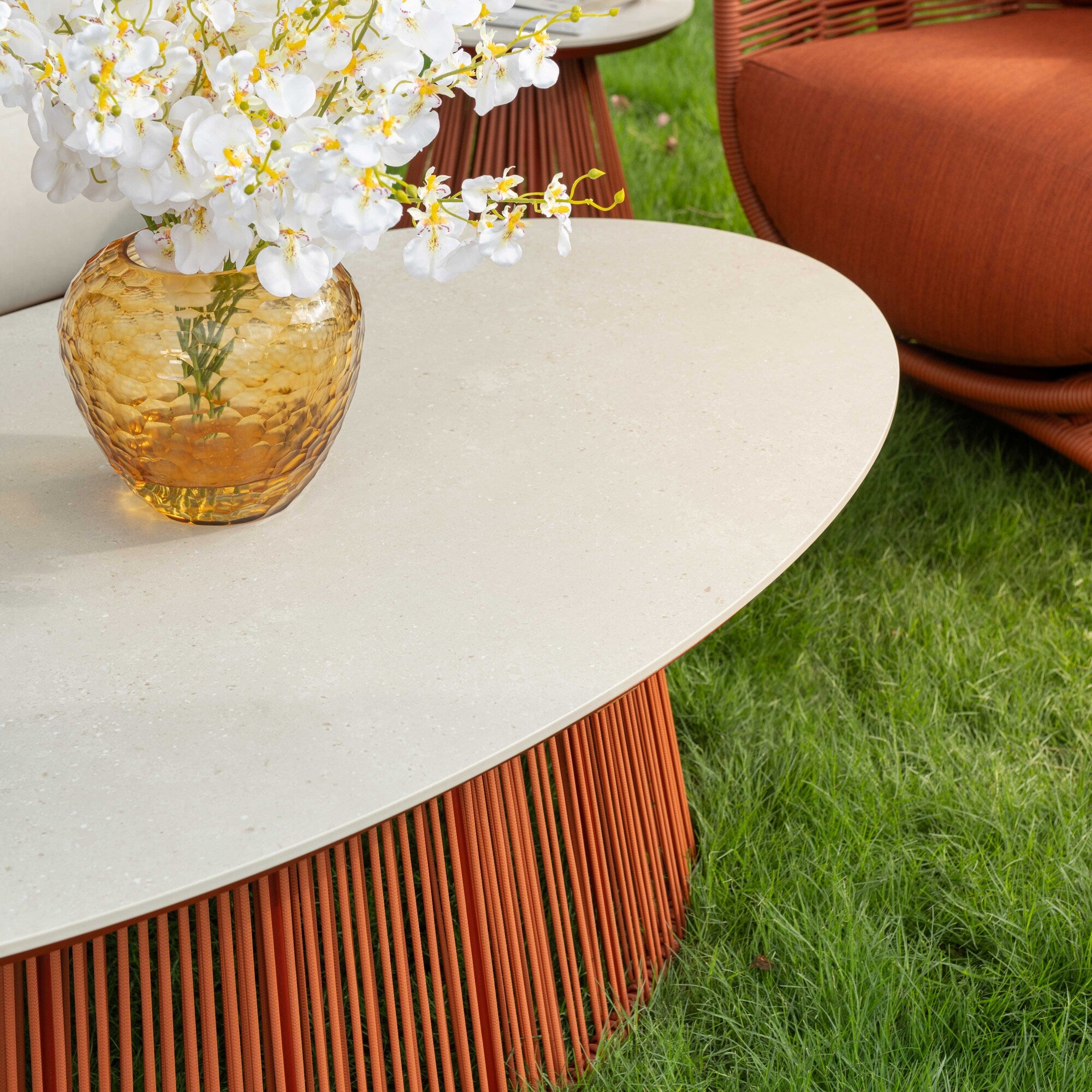 This coffee table features a ceramic oval top paired with a tapered base. It is finished with a powder-coated frame for added durability. The rich terracotta tone lends natural style and earthy elegance. The design extends the sphere collection’s modern style into your outdoor space.