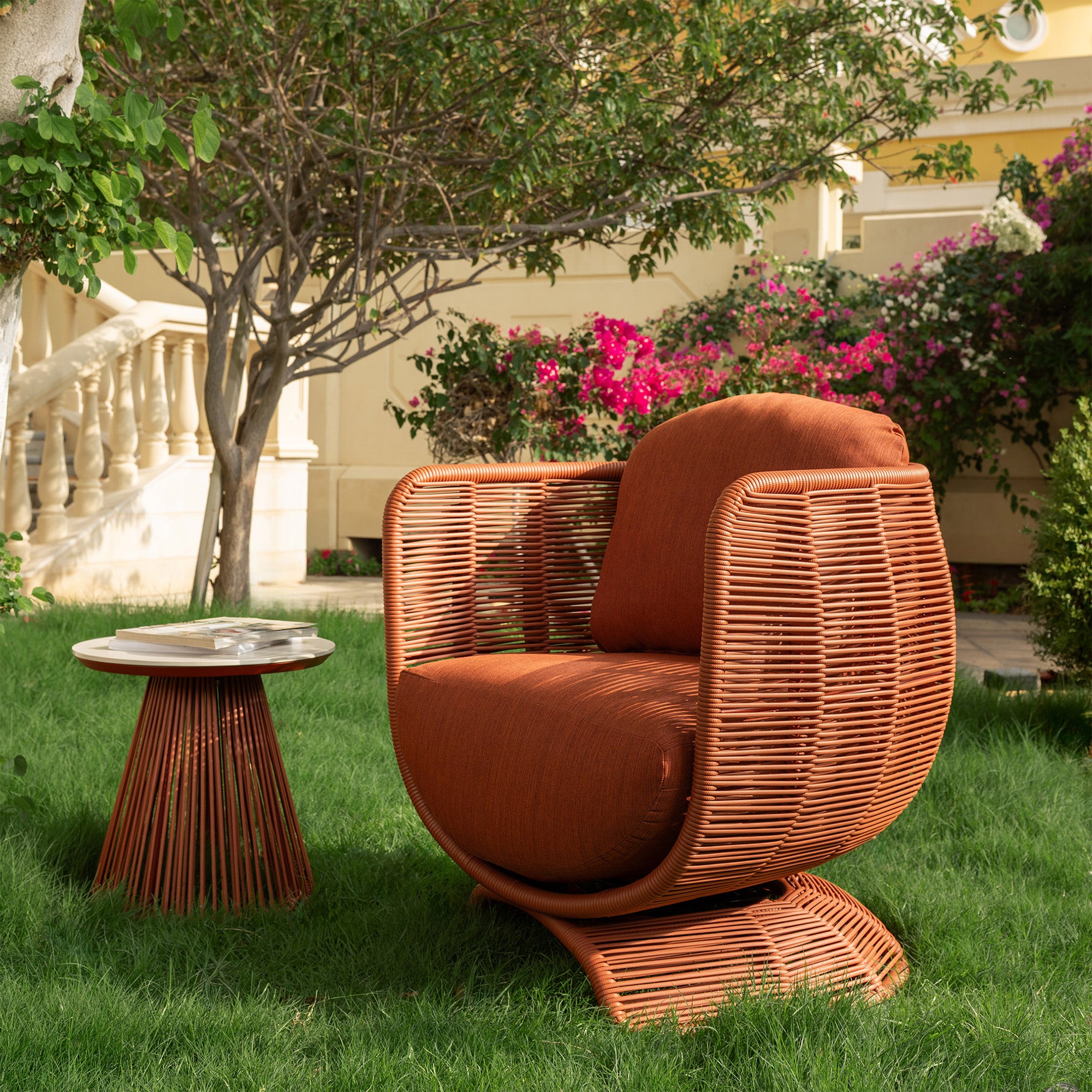 This side table pairs a smooth ceramic top with a tapered base in a rich terracotta hue, bringing warmth and depth to outdoor spaces. Framed in powder-coated aluminum, its open structure creates visual lightness while ensuring lasting durability. Combine with the sphere collection for a complete and elevated outdoor experience.