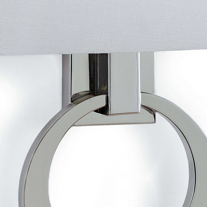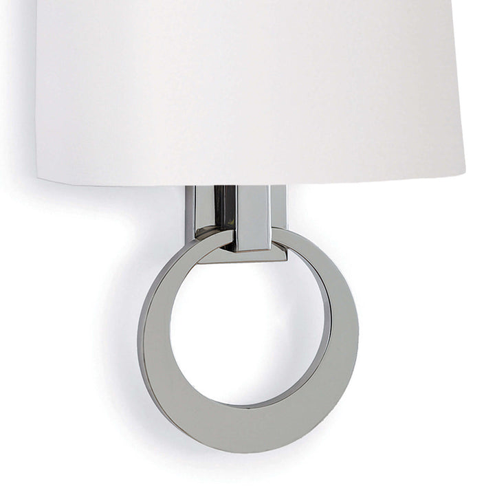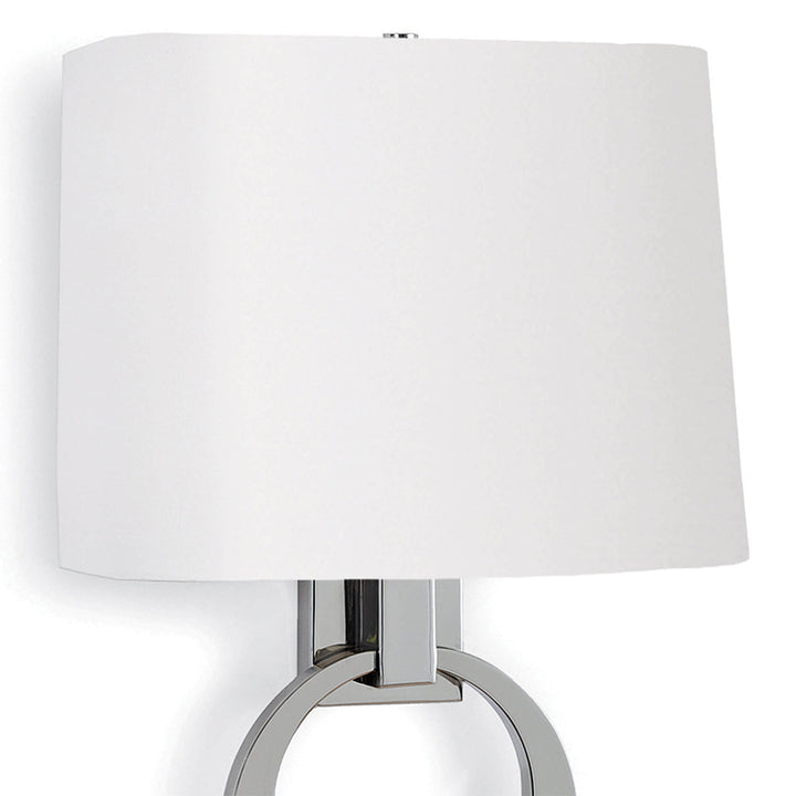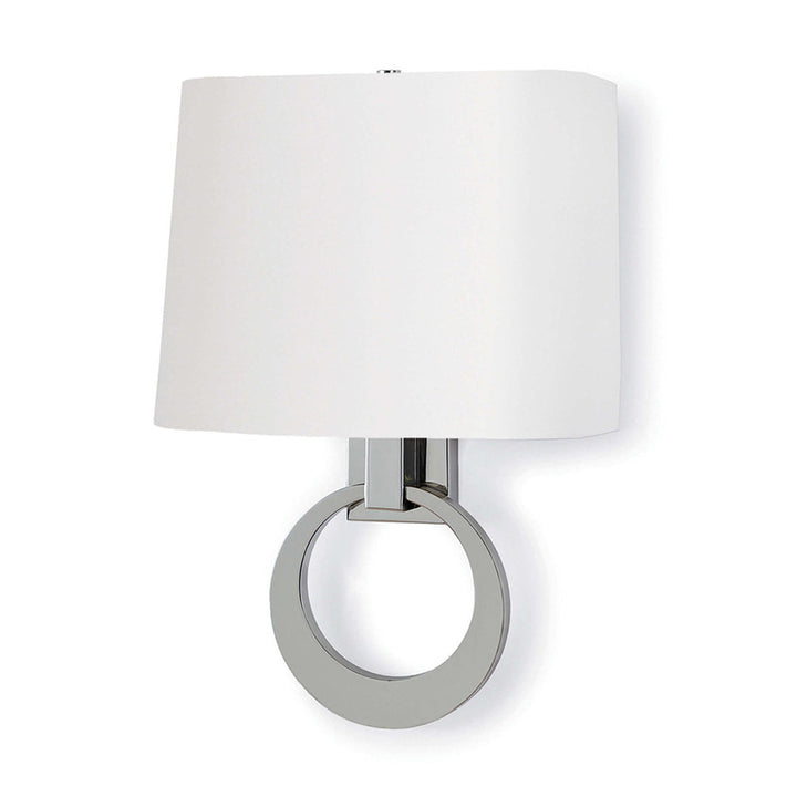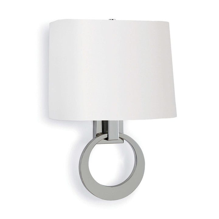 The Engagement Wall Sconce features a ring-shaped frame with a Polished Nickel finish to give it a retro appearance. At the top is a tapered shade in White Linen that complements the configuration. This sculptural beauty is ideal for adding warmth and soft lighting to your bathroom or foyer.