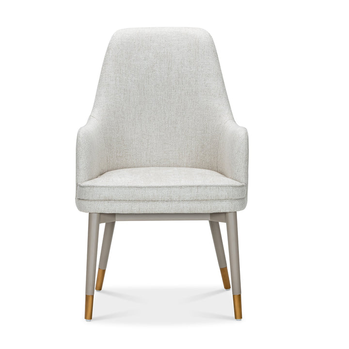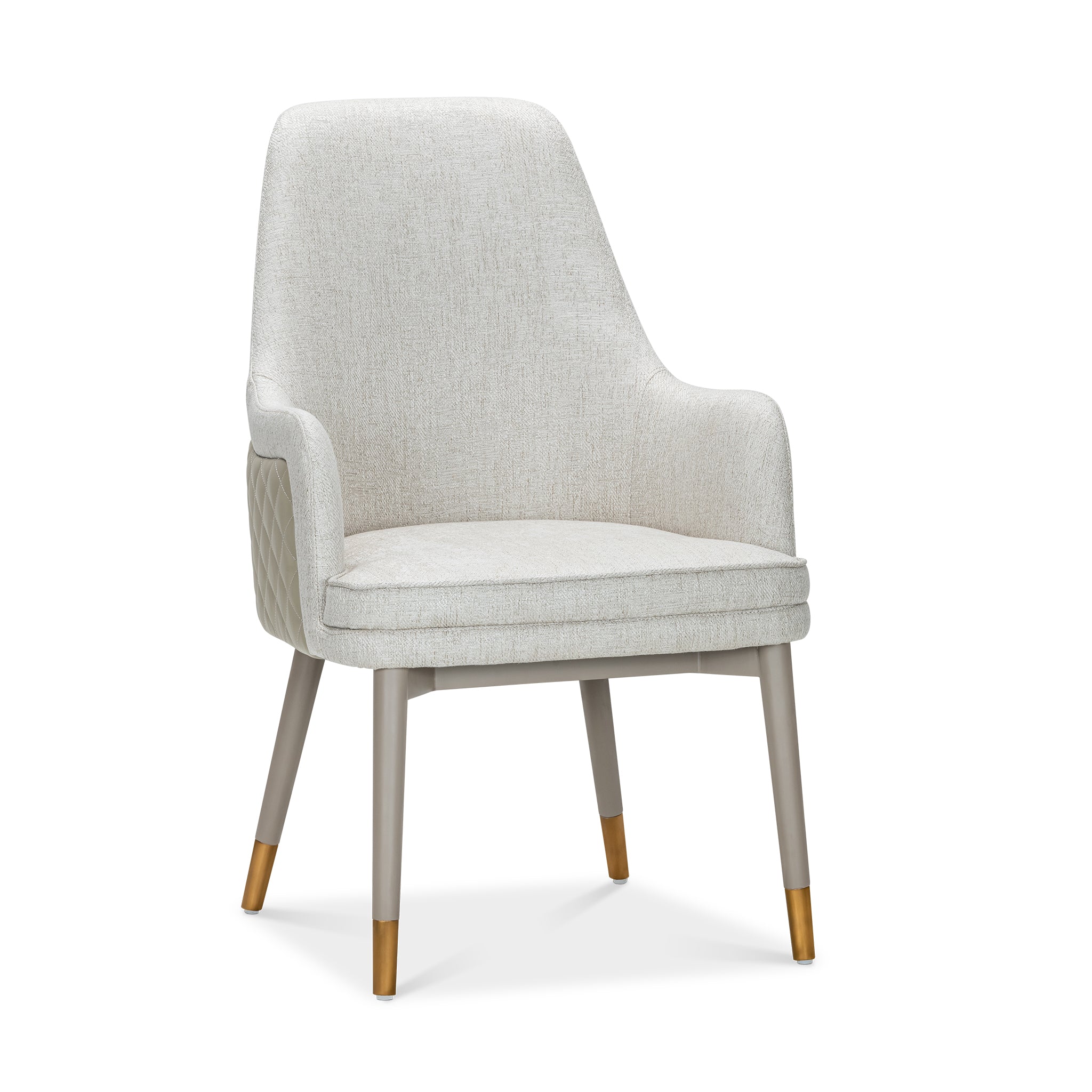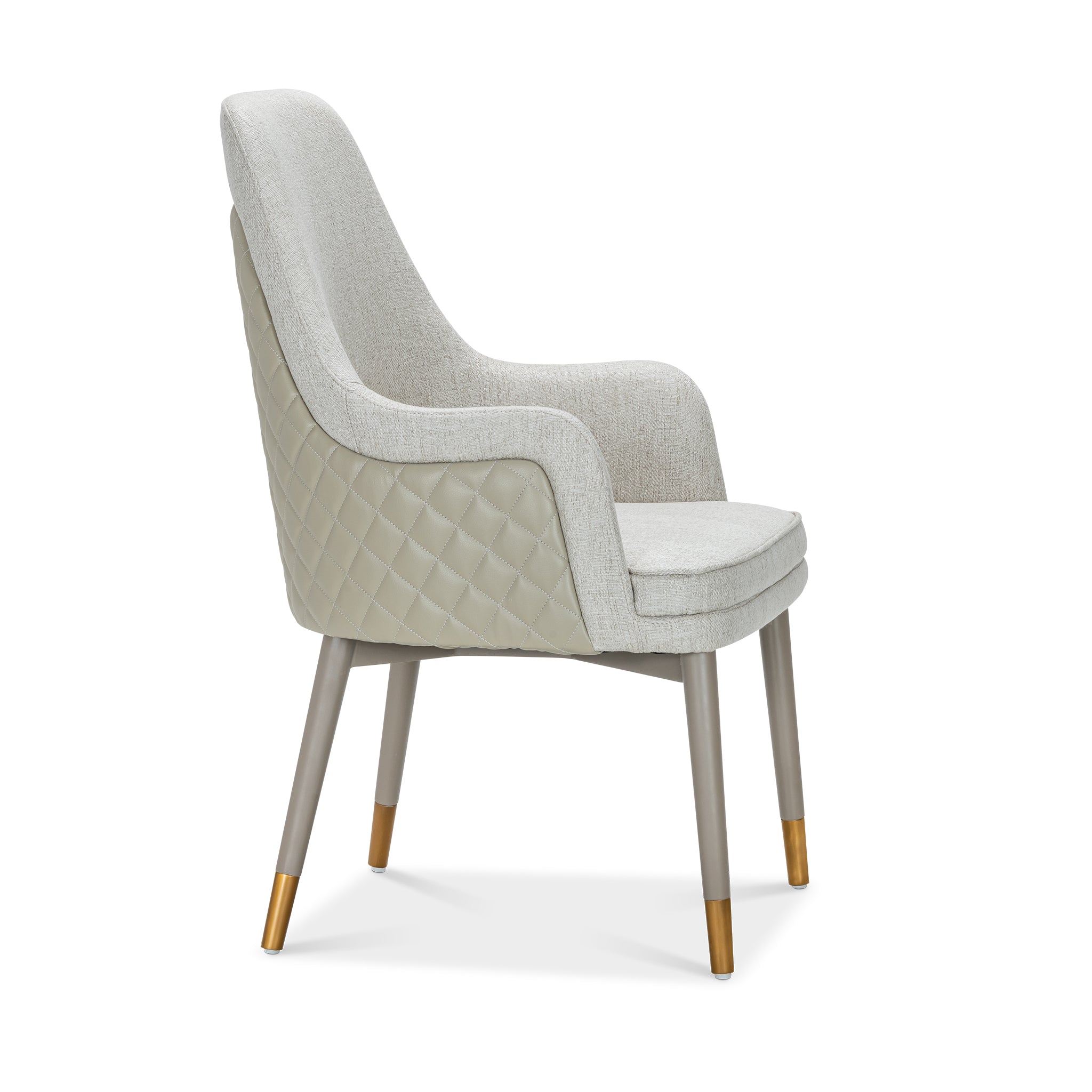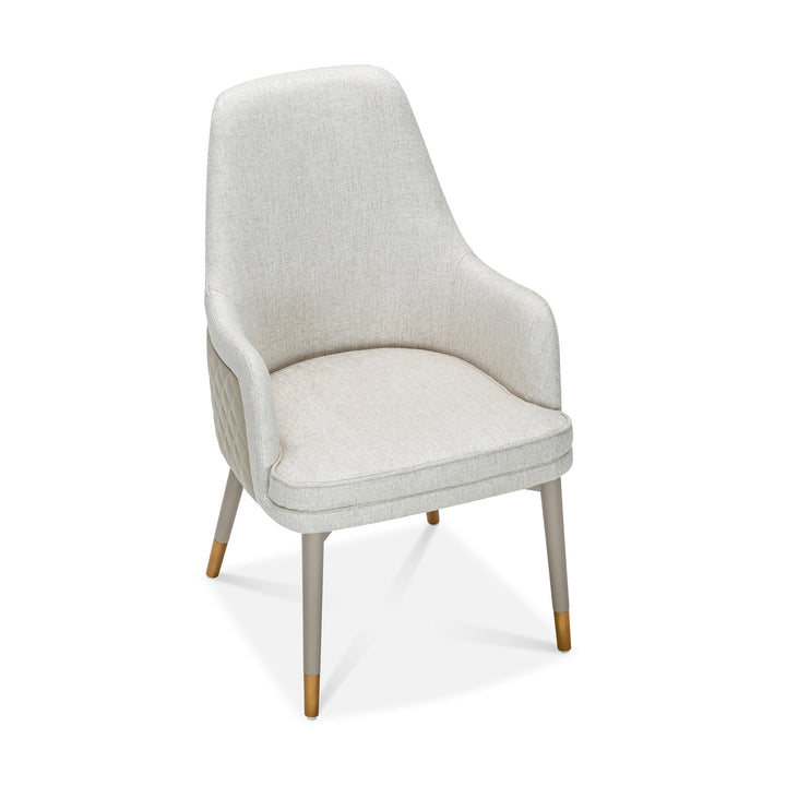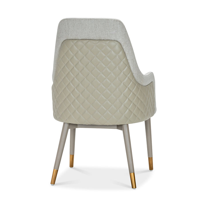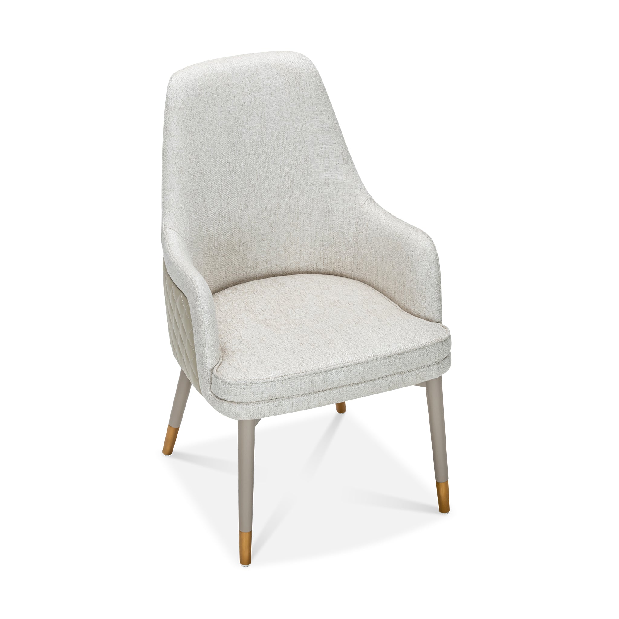 Upholstered in light beige chenille on the seating and the outer back stands out in dark beige faux leather, detailed with diamond quilting, greige legs with stainless steel metal ferrules in an electroplated brushed brass finish for a refined touch.