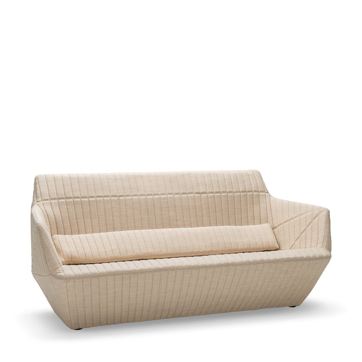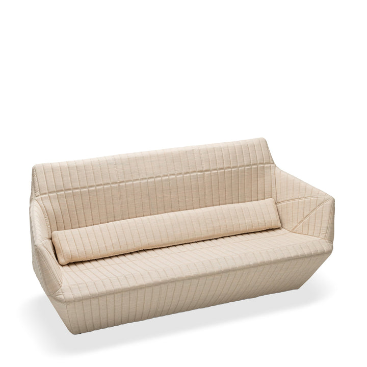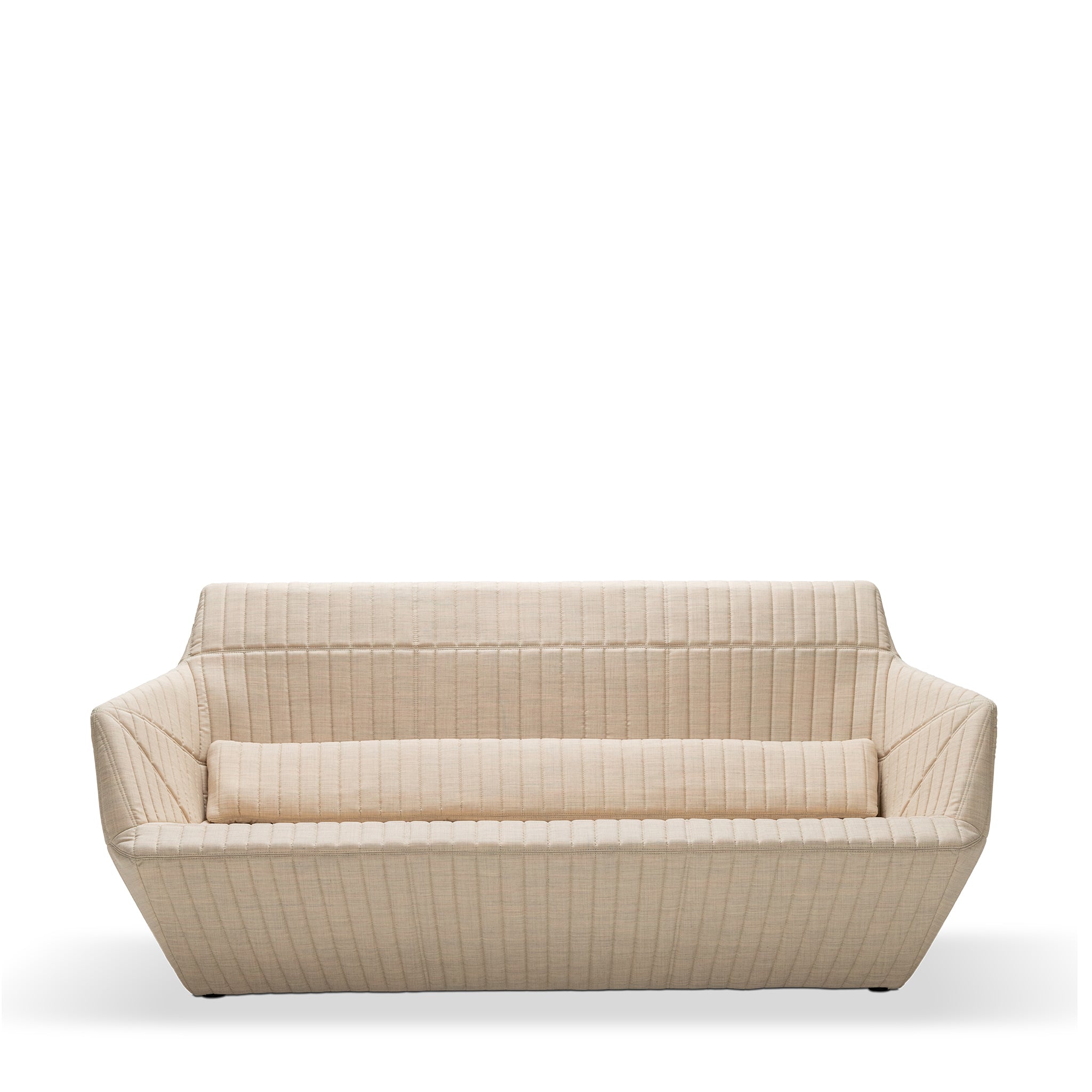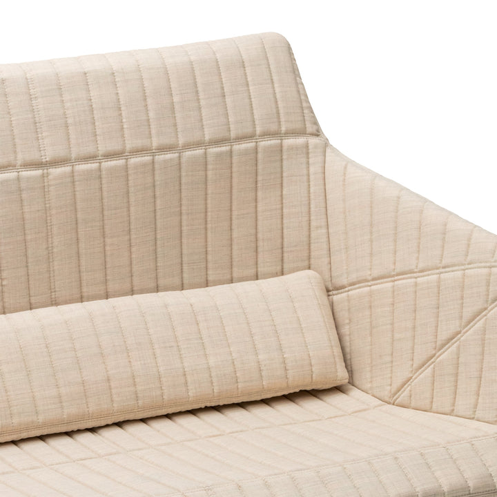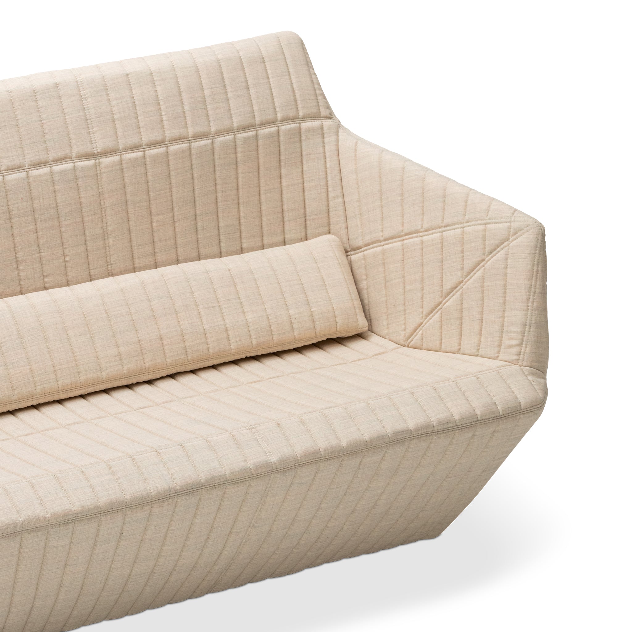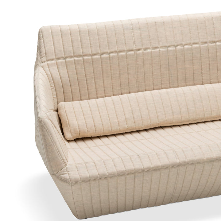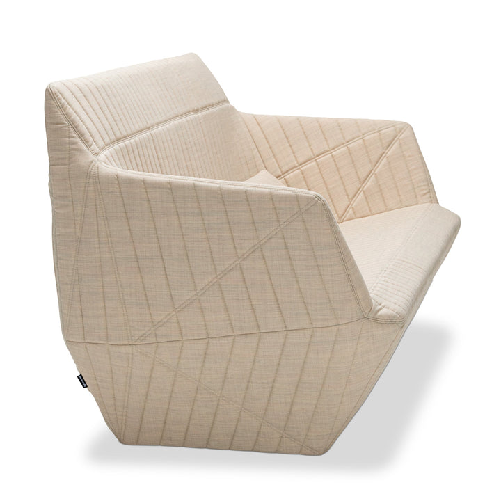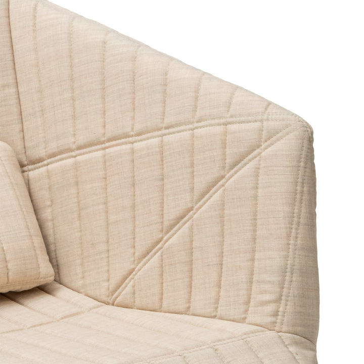 Designed to dazzle, the Facett 2-Seater Sofa boasts subtle curves and angles, offering geometric brilliance. It is draped in Ecru Laine fabric with a delicate channel stitching pattern to increase visual interest. An elongated lumbar cushion boosts the trendy aesthetic. This piece allows you to express your style and create an inviting haven for your guests