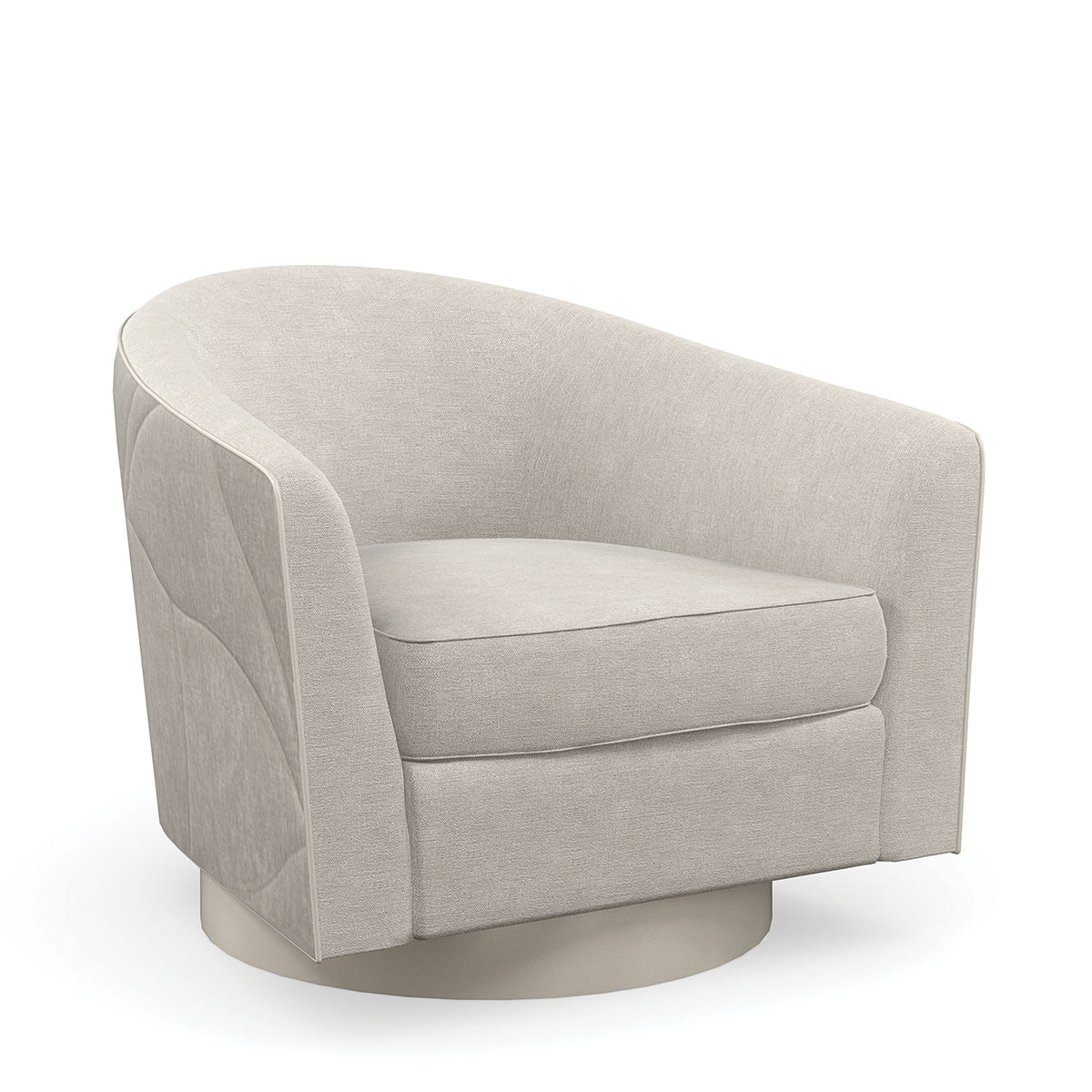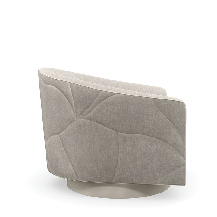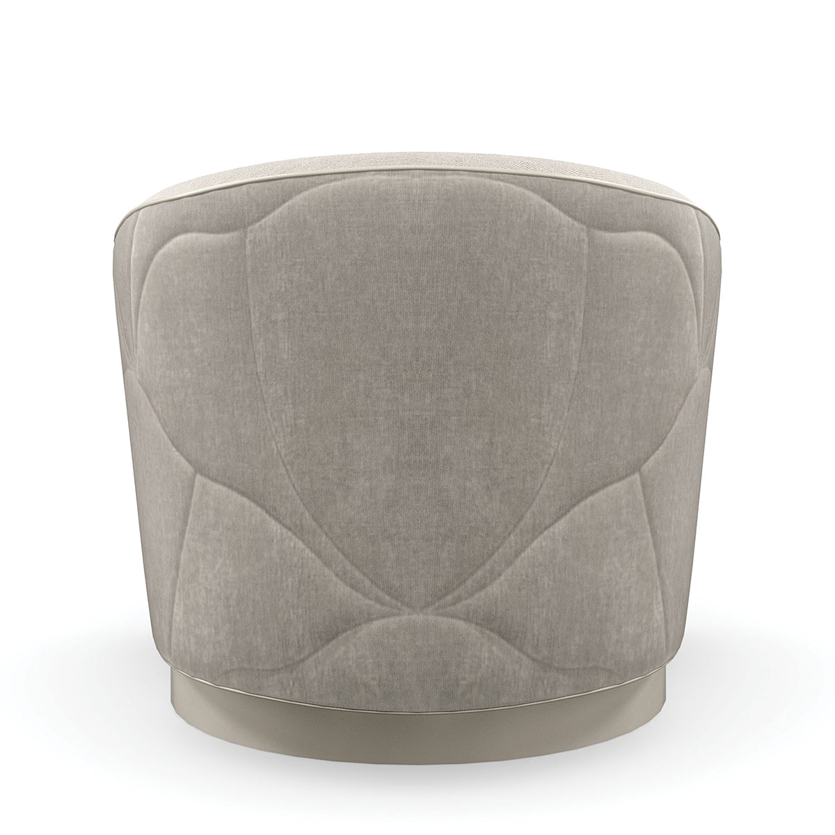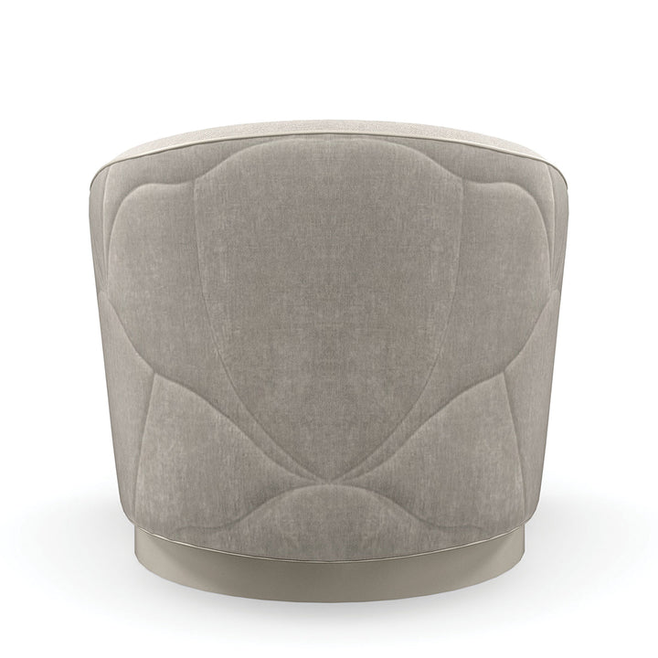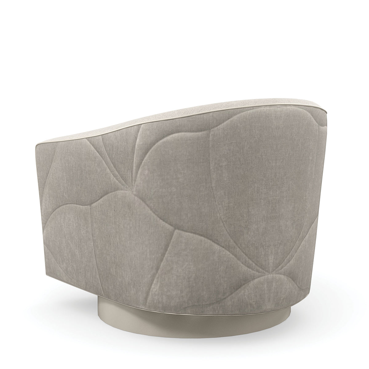 An all-around standout, this softly curved swivel chair wraps Tonal Grey fabric that oozes classic elegance. What's intriguing is the quilted ginkgo pattern along the back. With the set of accents, including the cream-colored welt and the Pearl Vinyl plinth base, this piece will undoubtedly create a bold statement in any setting.