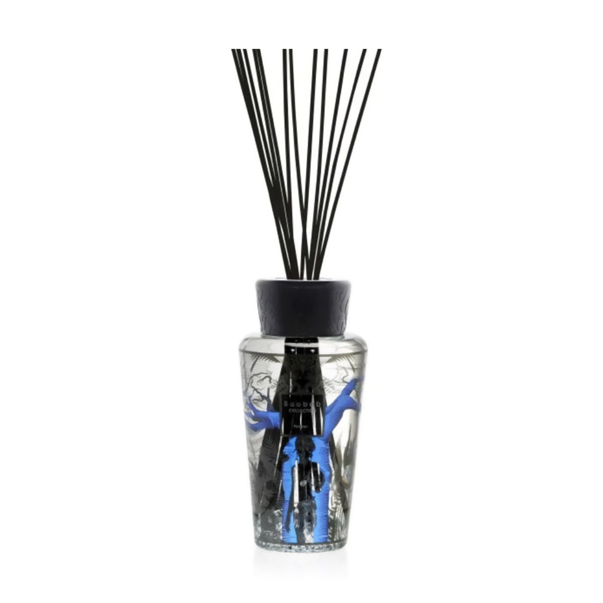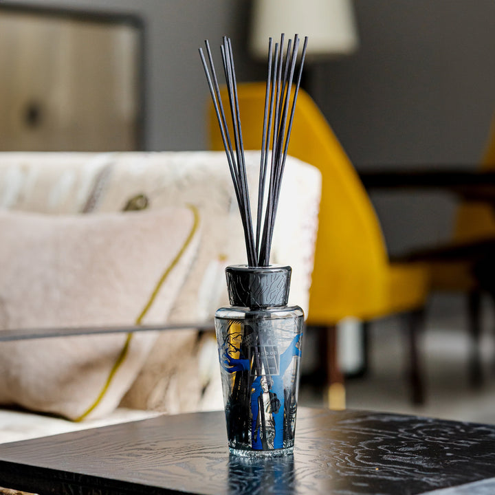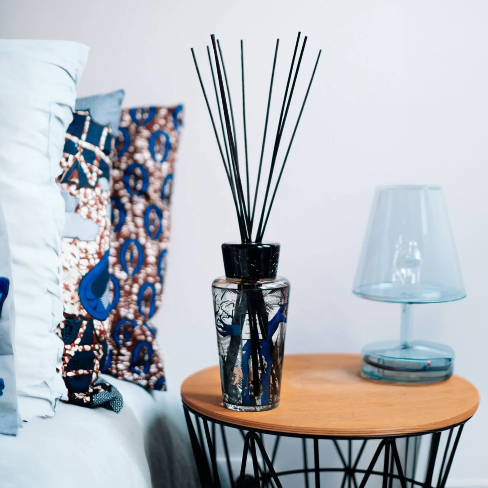 With glass decorated with an original fresco by artist Yann Legendre, the bottle of the Feathers Touareg home fragrance diffuser is a modern object finished with a black bakelite cap engraved with a root pattern.