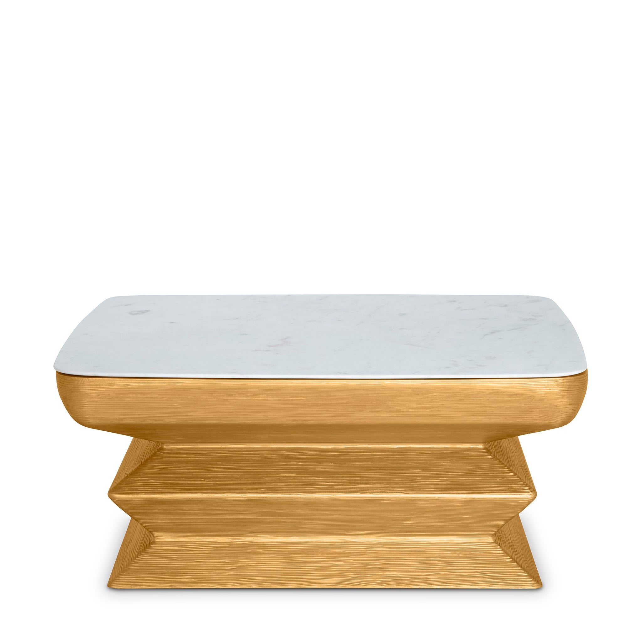 Simplicity beats complexity! This coffee table stands firm on a solid wood composition painted in a Brass finish, revealing a flowing horizontal carving. It is topped with a wider square-shaped White Banswara Marble, providing a flat and glossy surface. This low-profile piece will bring a classic yet trendy feel to your living space.