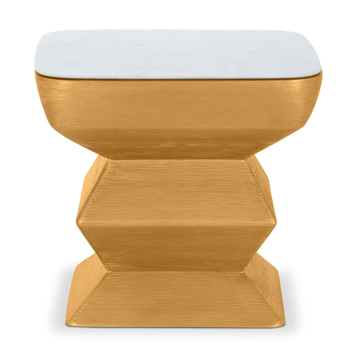This coffee table rests on a hand-carved wooden base in a Brass paint finish, showcasing a delicate horizontal pattern. It has a White Banswara Marble top showcasing a flat and glazed surface. The Flow Coffee Table B will uplift your home's interior design to a new level of luxury. By completing your interiors with all the Flow Table Collections, you can extend a harmonious visual appeal.