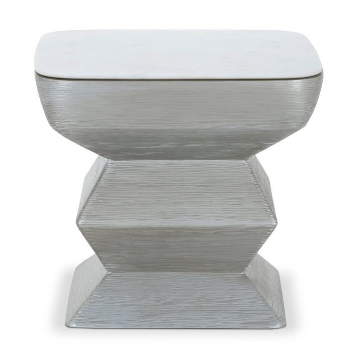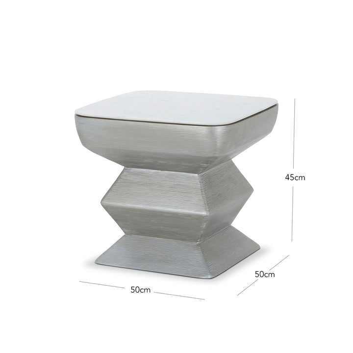 Crafted with a White Banswara Marble top and wooden composition on the base with flowing horizontal carving, this distinctive piece will win you over with it's irresistible charm. The Silver Paint finish on the sculptural beauty makes a bold statement and adds a touch of refined elegance.