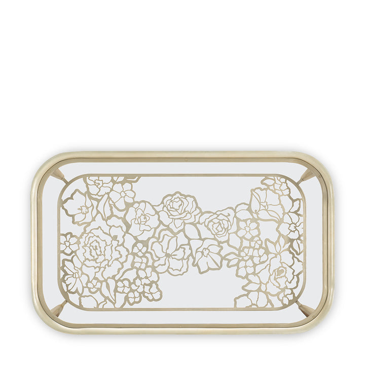 Defined by its distinctiveness, this cocktail table is in full bloom. A rounded rectangular metal frame encloses a tempered glass top with an elegant bevel. Look below and see the beauty of a metal stretcher crafted of cutout flowers arranged in a geometric pattern forming a virtual garden. Graceful cabriole legs support its open design and are highlighted with a silver leaf finish in Oracle. While traditional at heart, this captivating table is sure to surprise and delight all who see it.