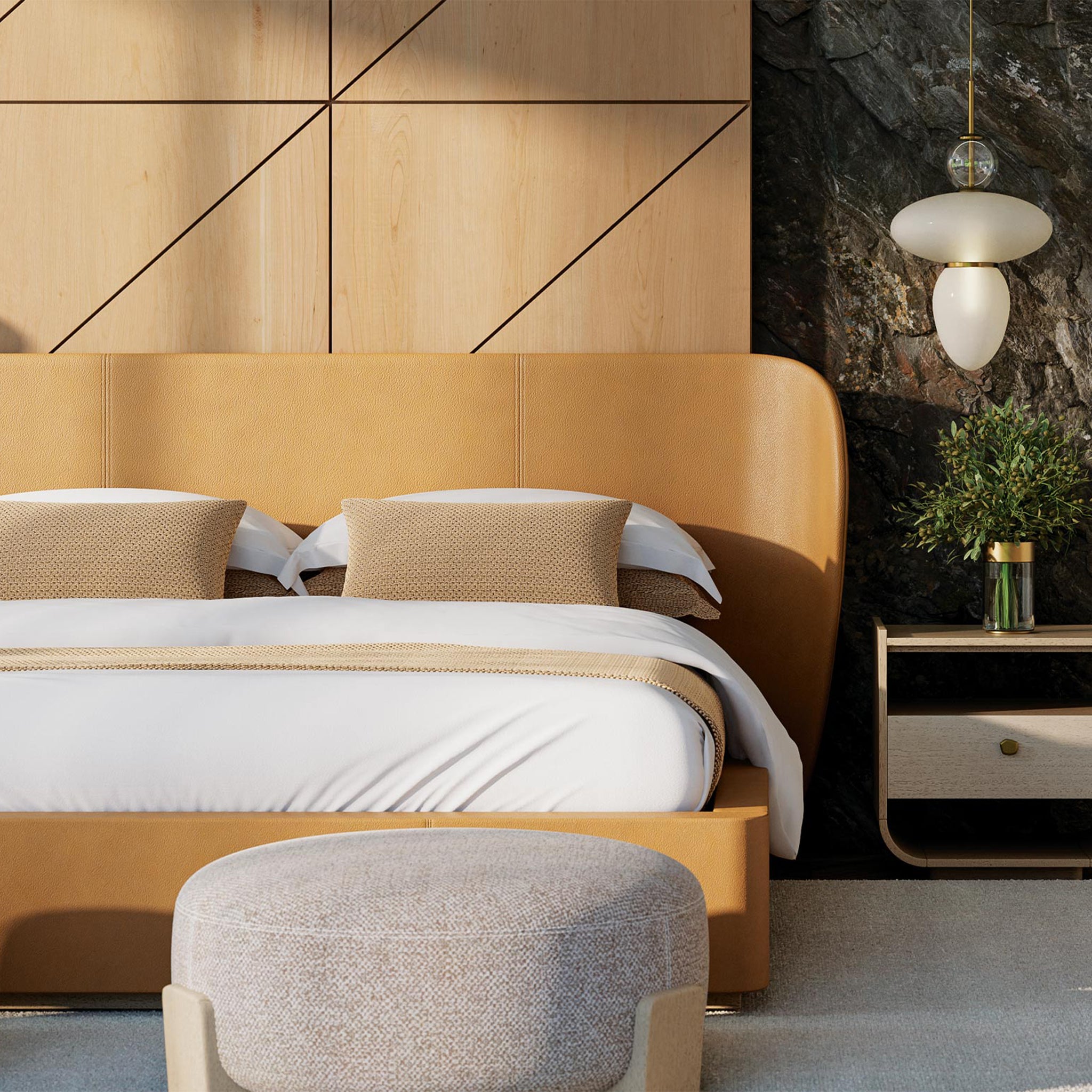 A modern silhouette with soft contours defines the character of this upholstered bed. Its seamless frame creates a clean, unified look that blends comfort with style. Supported by a plinth base in Palma finish, it introduces subtle sophistication to any bedroom setting.