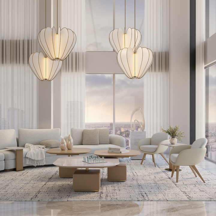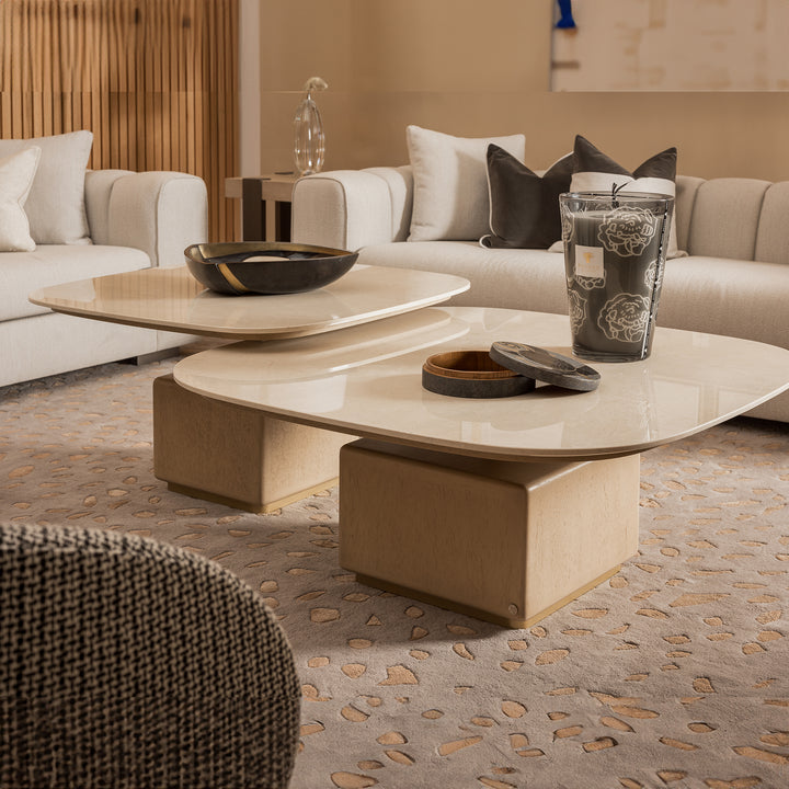This sophisticated cocktail table combines wood, stone, and metal. The lower top features Seike Wood with a Natural finish, while the cushion-cut top features Ivory Marble, exuding timelessness. Its central metal framework is attached to a boxy base that gets a gleaming Gold finish.