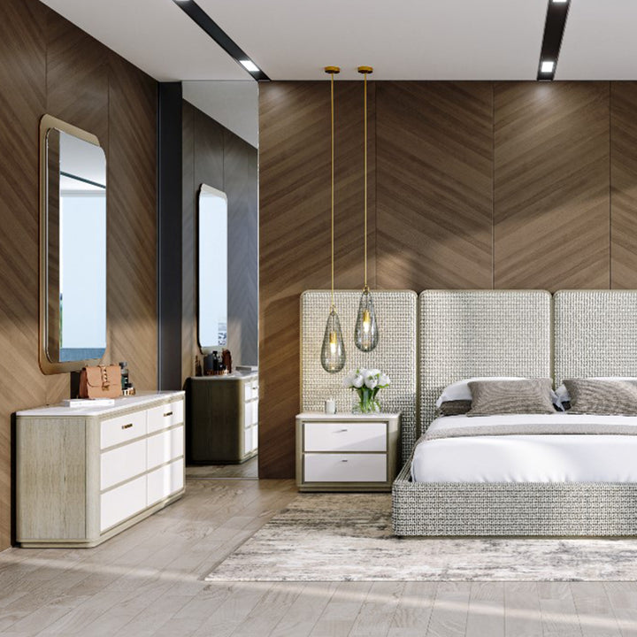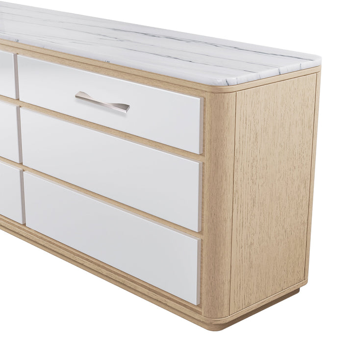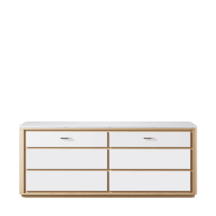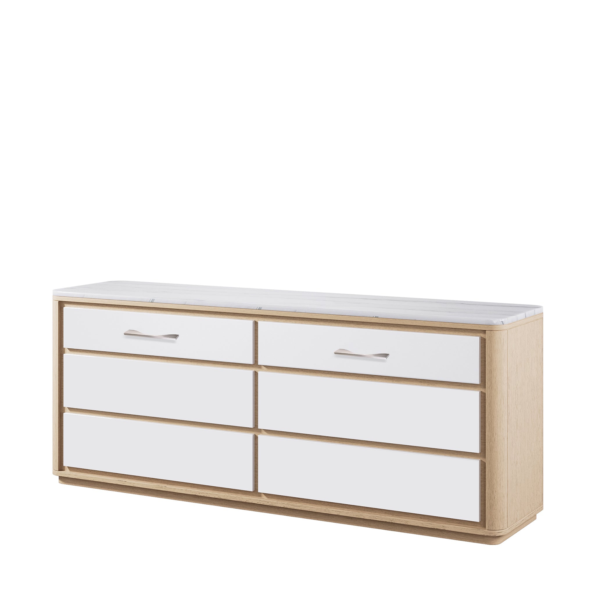 The Gem Dresser 101 will keep your bedroom neat and organized by carrying six drawers with a White High Gloss finish. Its robust frame is crafted in Seike Wood with a Natural finish for a minimalist aesthetic. Add a top made of White Fog Stone to it, and you'll have a handy place to keep frequently used items.