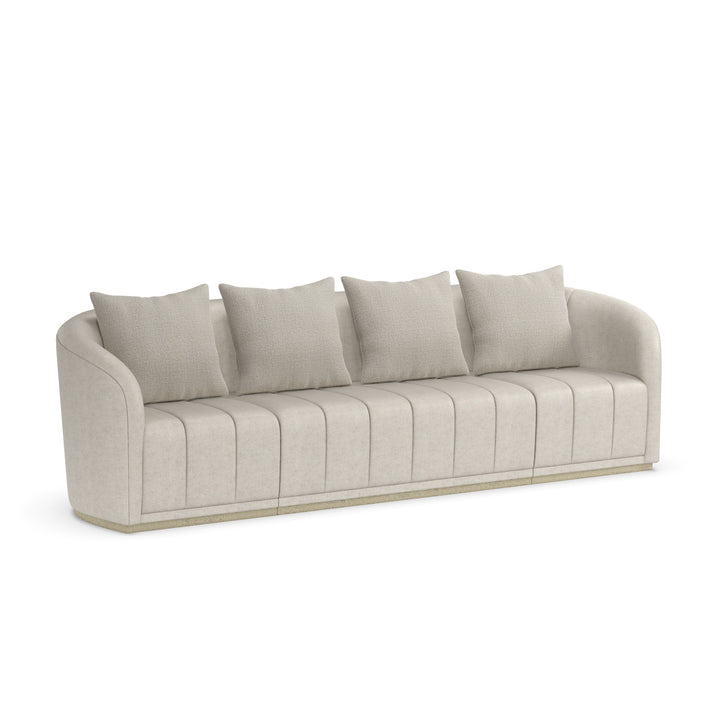 A contemporary sofa defined by its smooth curves and elongated form. The design features vertical panel detailing along the seat, complemented by plush back cushions for added comfort. Its seamless structure and balanced proportions make it a versatile addition to modern interiors.