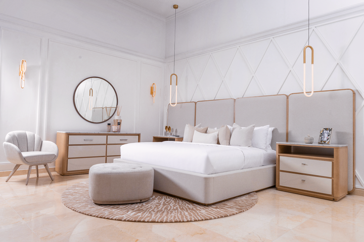 Designed with attention to detail, this King Bed comes with grand upholstered panels providing a frame for the bed as well as the nightstands on both sides. The soft, rounded curves highlight the silhouette while creating a cozy atmosphere. It's a perfect combination of design and functionality.