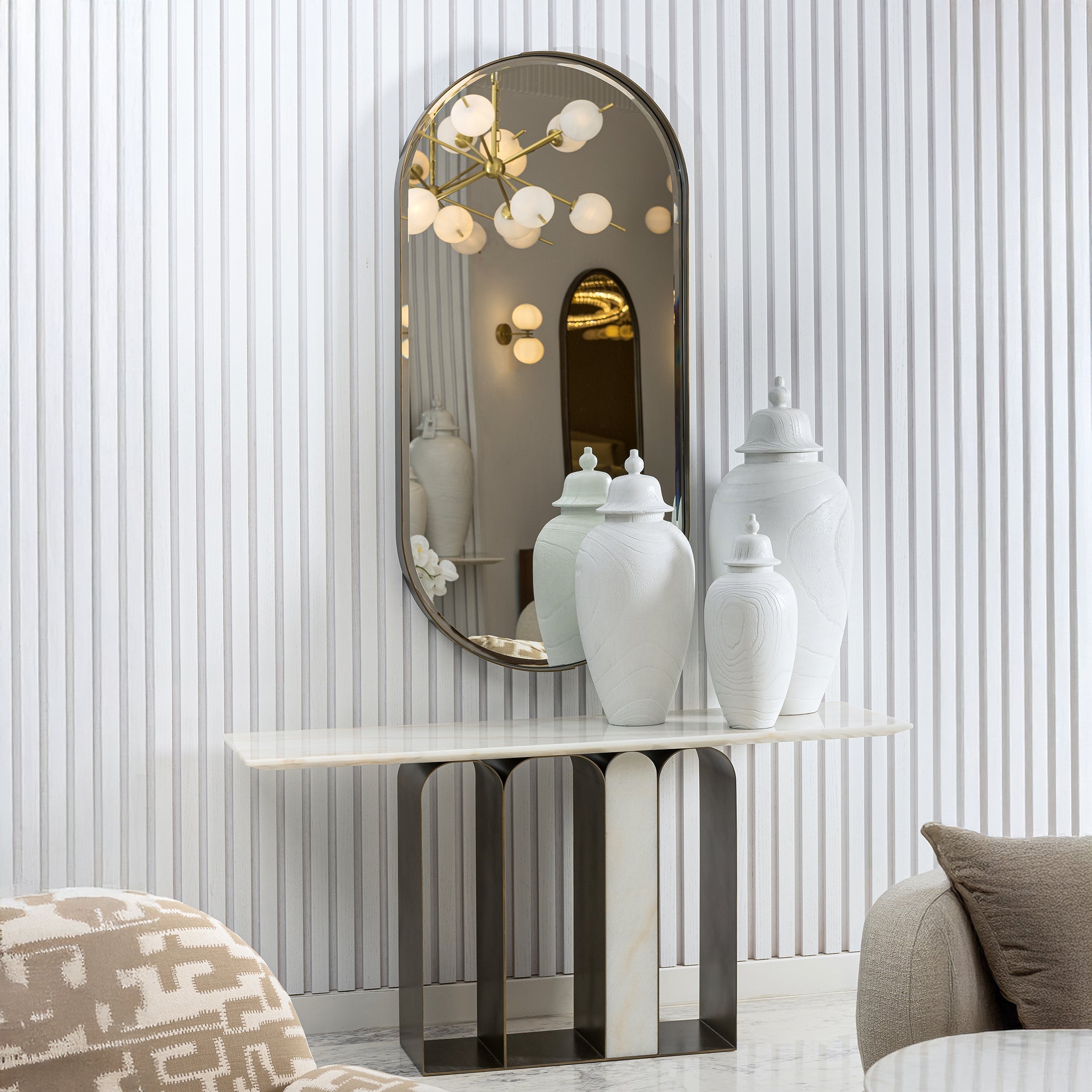 A stylish console features a rectangular natural white marble top supported by sculpted frames in an antique brass finish. A vertically placed marble slab accentuates the structure, while the distinctive veining of the stone makes each piece truly one of a kind.