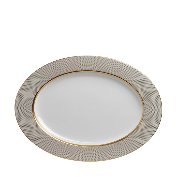 The absolutely stunning Narumi Gold Diamond Oval Platter shows a regal work of art. It is composed of fine and delicate Bone China, which is safe and durable as well. The immaculate whiteness is rimmed in golden for a touch of elegance. A perfect, classy tableware for everyday use!