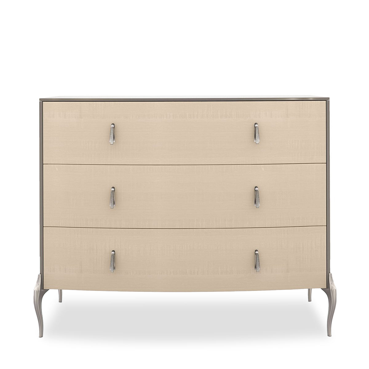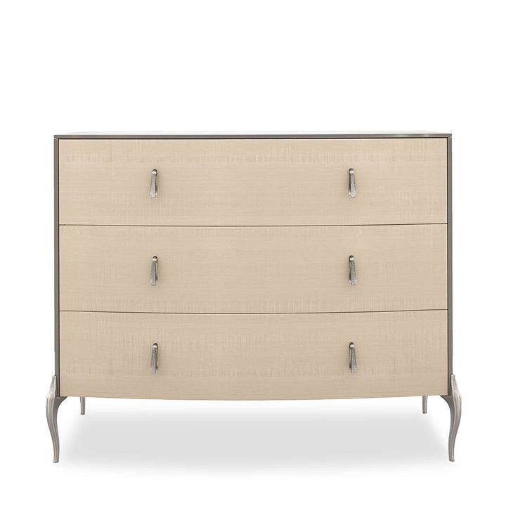 Flowing lines and soft, silvery paint make an elegant first impression with this three-drawer nightstand. Introducing a fresh perspective on light wood finishes, drawer fronts in Vanilla Cream bring to light the decorative character of figured sycamore. Elongated drawer pulls, inspired by an Art Deco jewelry pendant with a faux stone center, add a touch of grace. Ornate metal legs balance the subtly curved top and case, creating cool shimmer in Soft Silver Paint.
