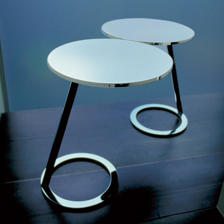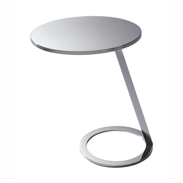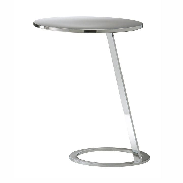 Wake up to the perfect blend of style and practicality with the Good Morning Chrome End Table. It features a slightly slanted frame that sits atop the ring base for a unique aesthetic. A perfect-in-size rounded top can hold your favorite beverage close by. The Polished Chrome finish injects an air of sophistication into this muted piece.