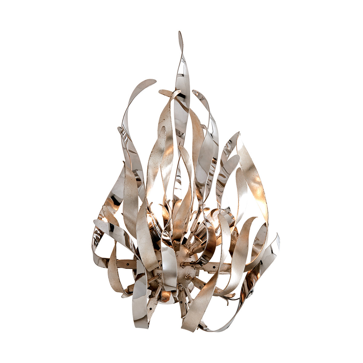 Graffiti Wall Sconce is a revolutionary work of art that's quite different from the regular lighting fixtures. It is an arrangement of swirling blades made of handcrafted iron in Silver Leaf with a Polished Stainless finish. Fitted with Smoke Glass diffusers, this luminary piece is the perfect addition to make a bold statement through your interior decor scheme.