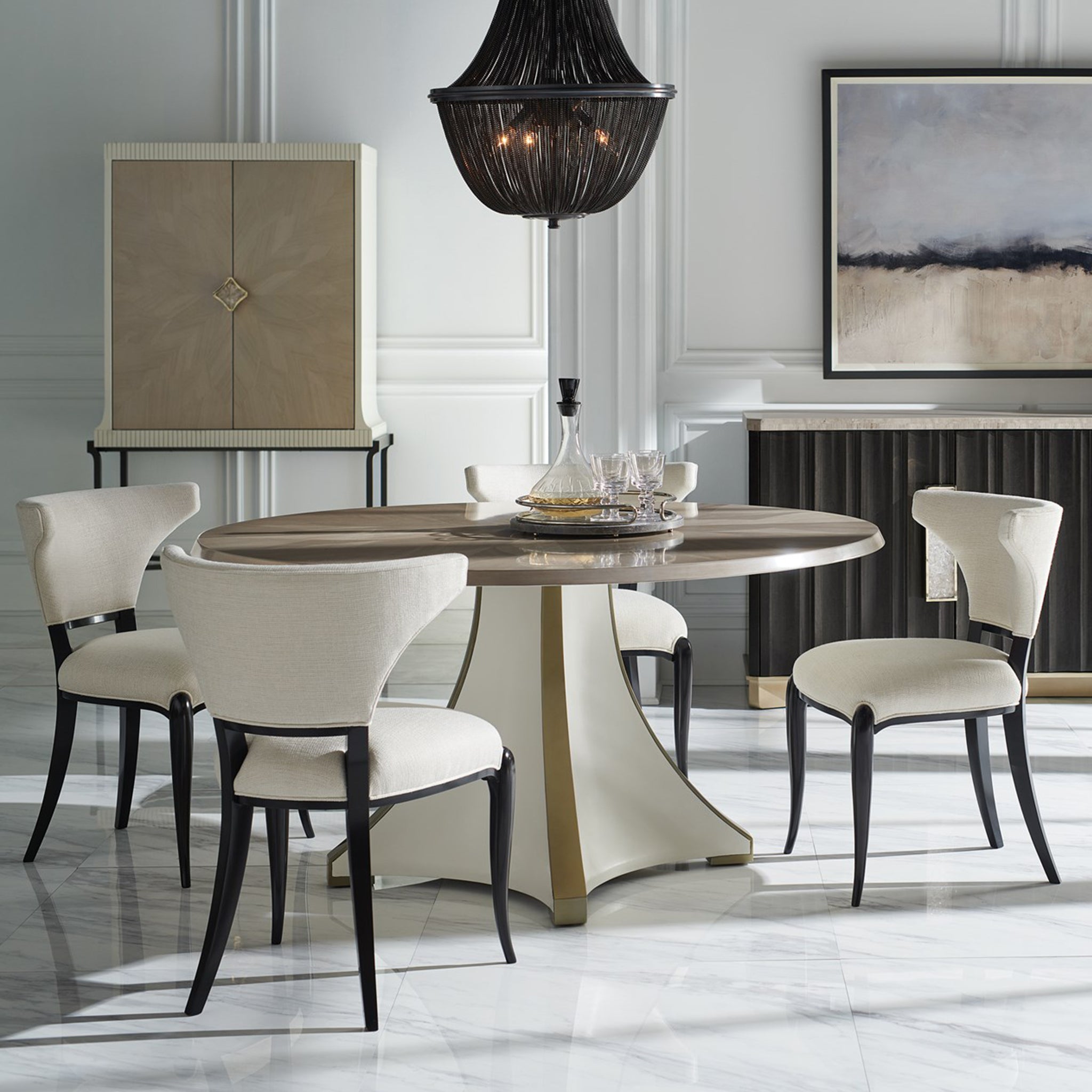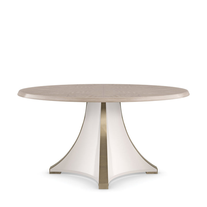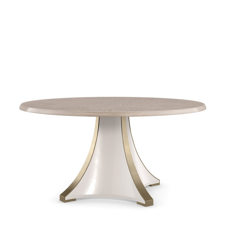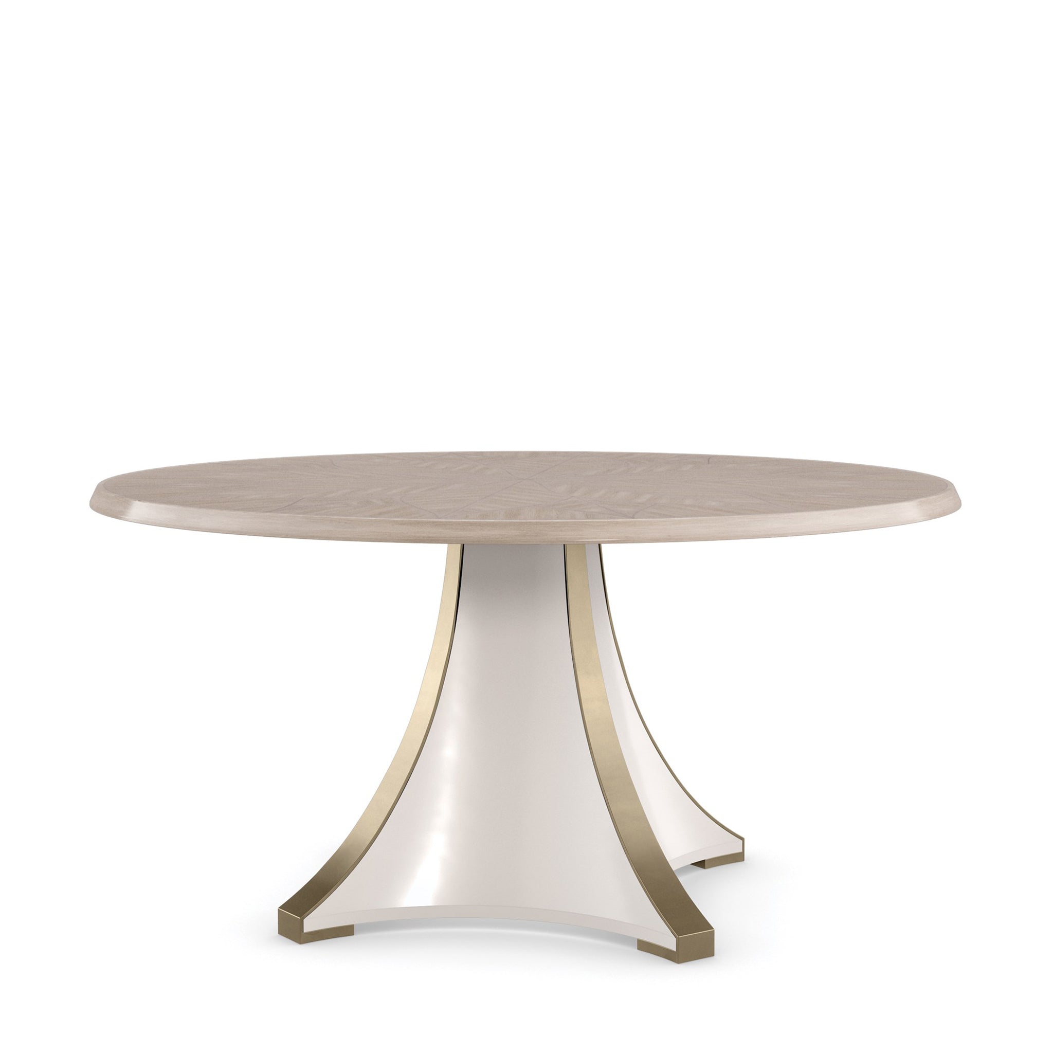 Anticipate extraordinary dining experiences with the Great Expectations Dining Table. The round Moonstone top radiates a celestial allure, while the triangular Pearly White resin base, adorned with Majestic Gold accents, delivers an elegant aesthetic. This masterpiece seamlessly marries form and function, promising a dining setting that surpasses expectations.