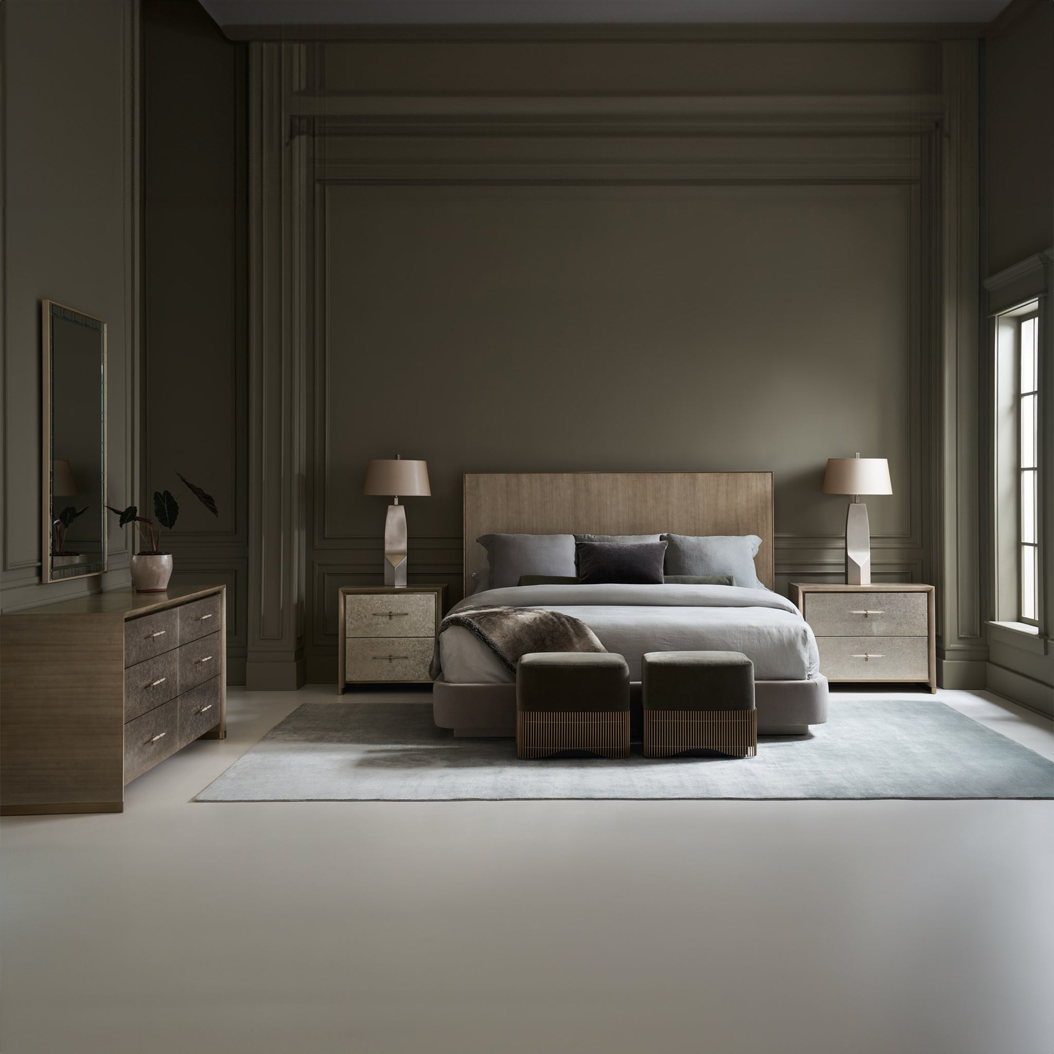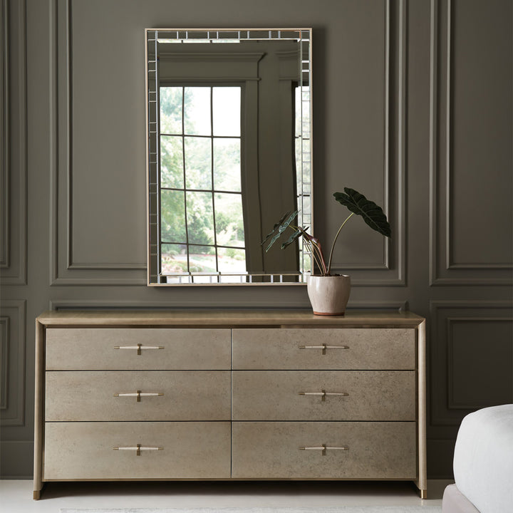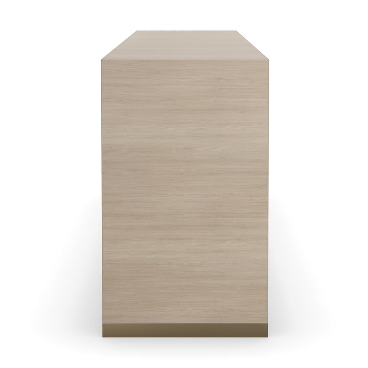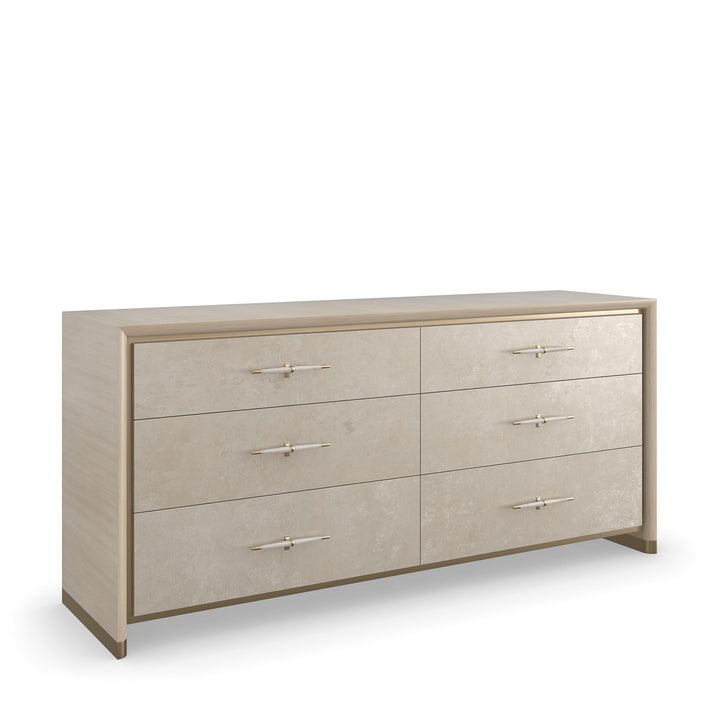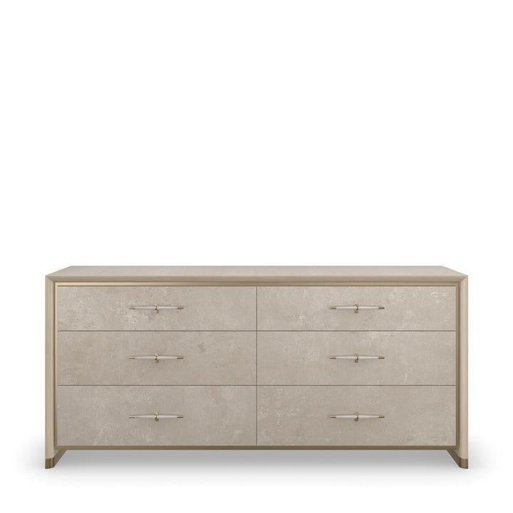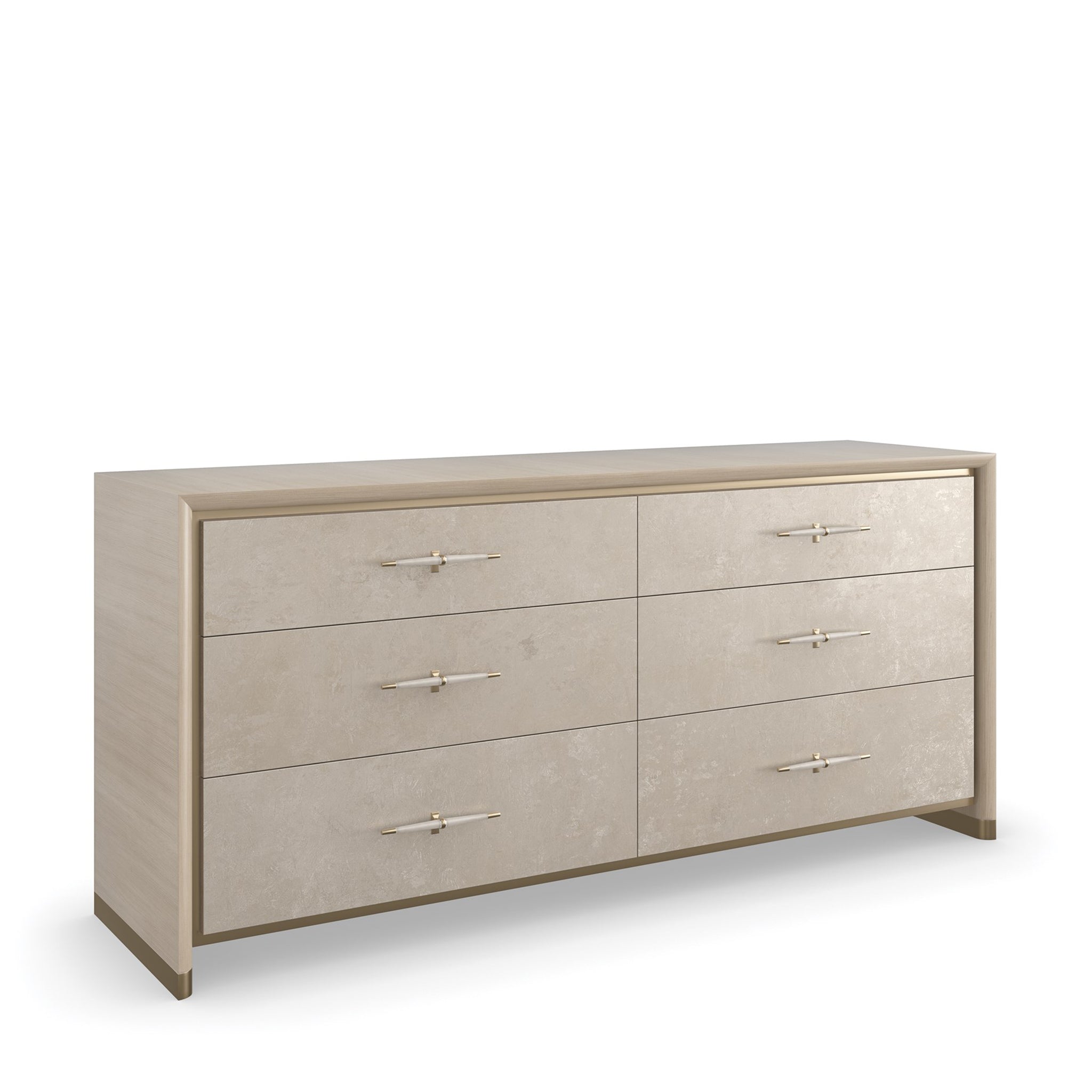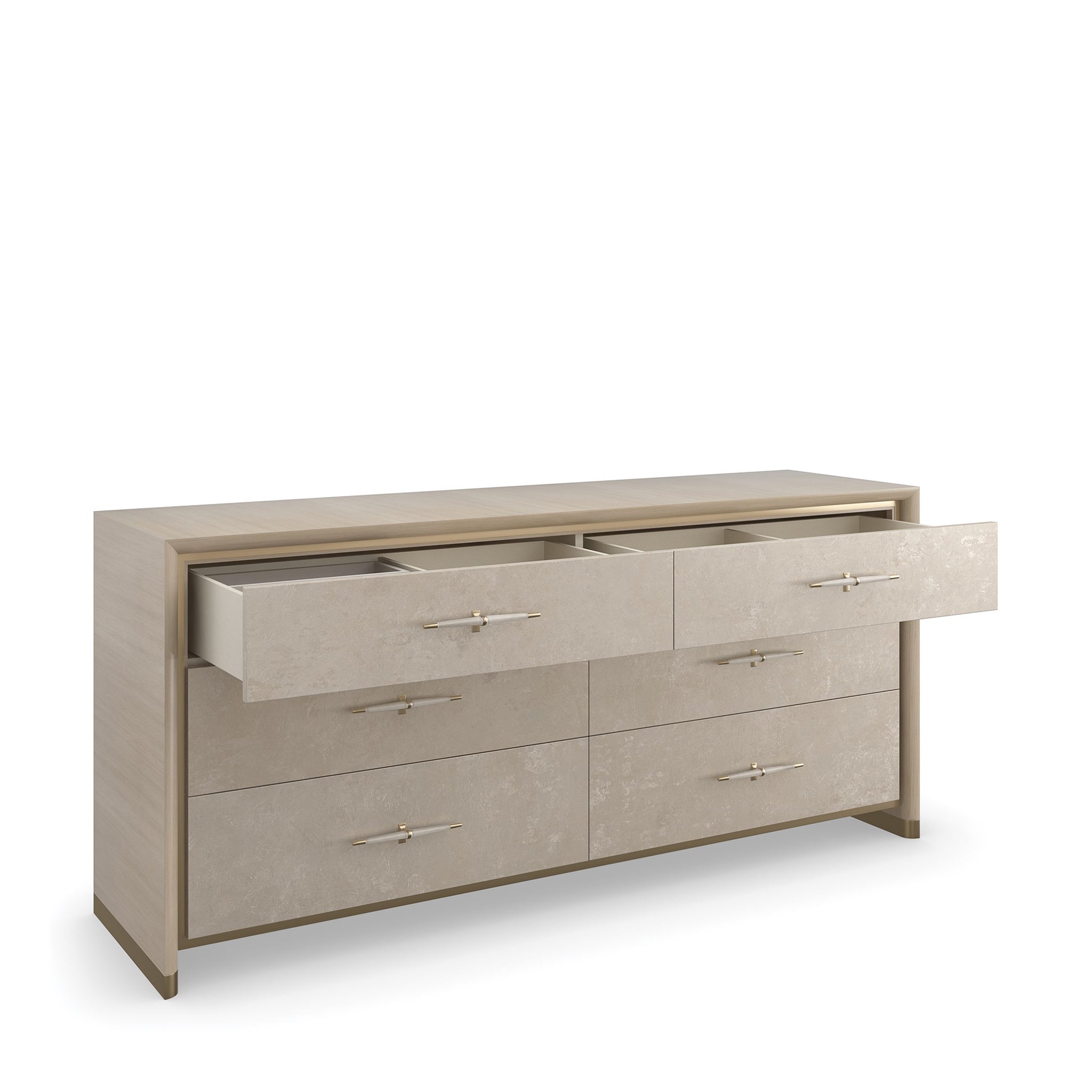 Unveiling the sophisticated Hang Up Dresser - a seamless blend of style and practicality. Its Dry Martini-finished case radiates elegance and is complemented by six Winter Frost drawers. The soft-close undermount guides and top drawer dividers oversee impeccable organization. The top left drawer is equipped with a removable jewelry tray. Brushed Gold metal caps on the end panels, Linen drawer interiors, and bespoke hand-stitched vinyl-wrapped hardware elevate the dresser's elegance to new heights.