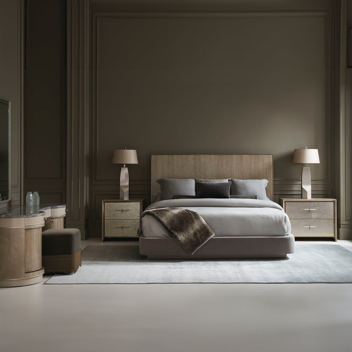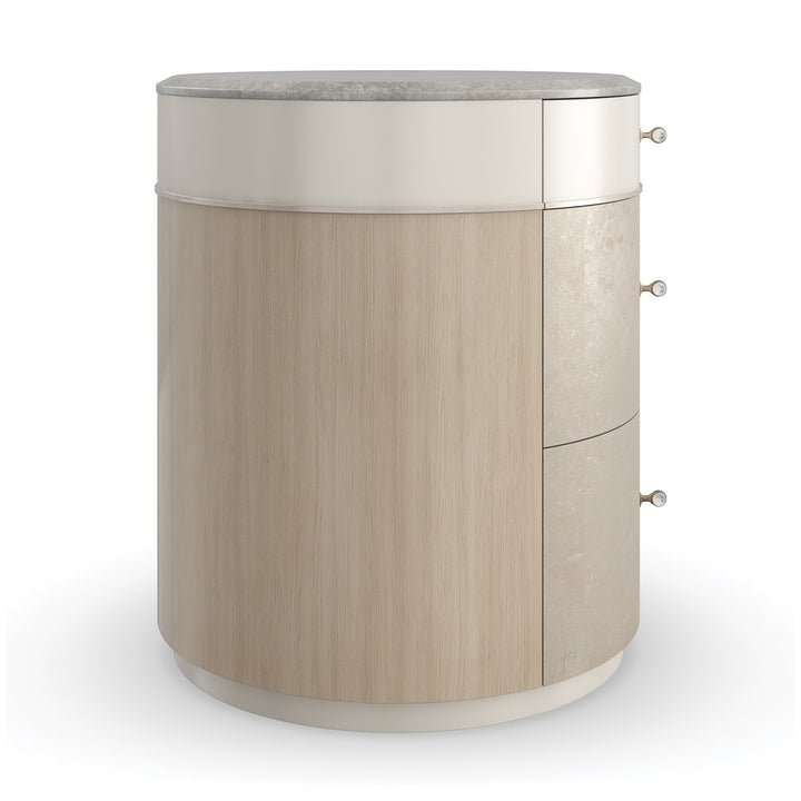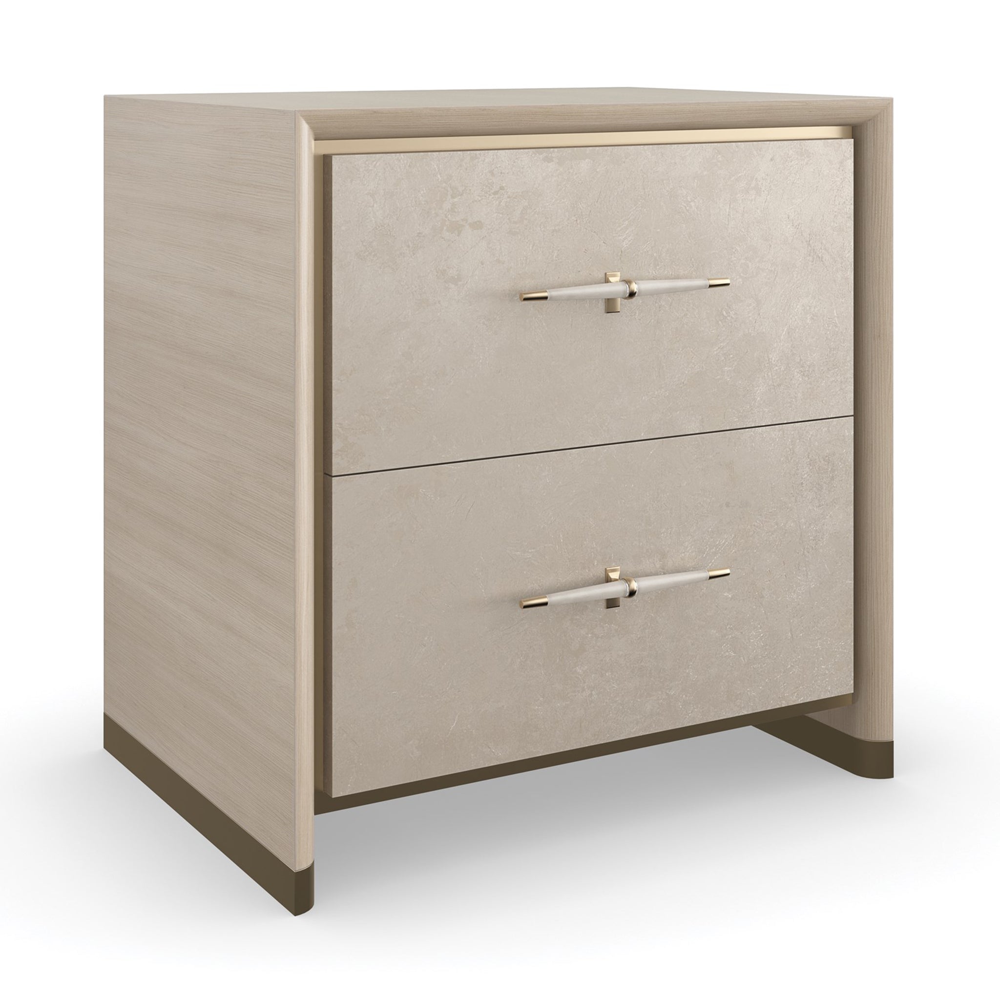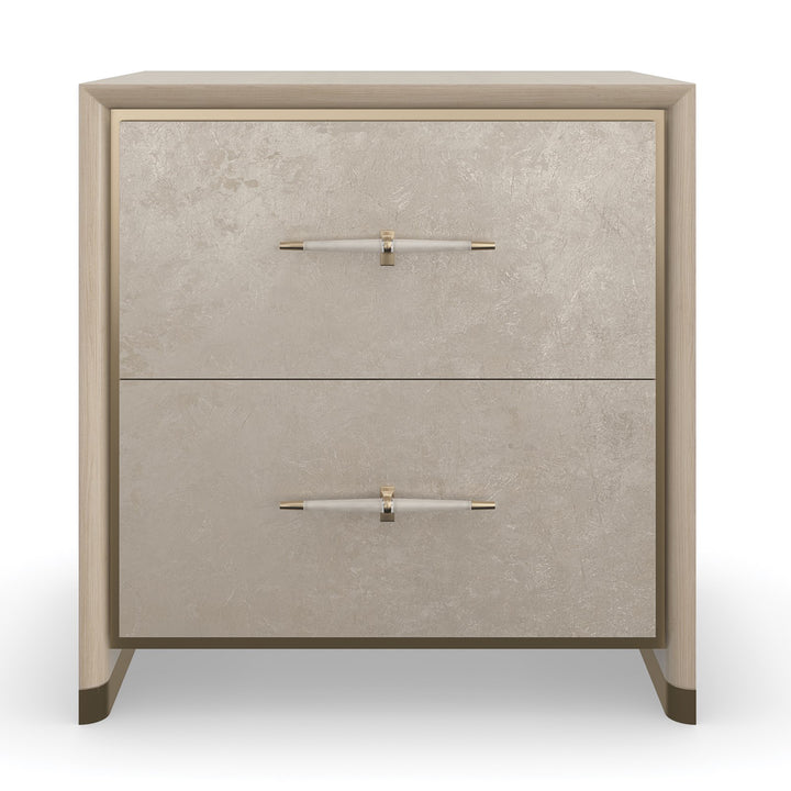 Meet the Hang Up Small Nightstand – a compact powerhouse of style and functionality! The robust case frame, finished in the chic Dry Martini, sets a sophisticated tone. Two drawers feature Winter Frost fronts and soft-close undermount guides, providing ample storage. The metal cap in Brushed Gold on the end panels adds a touch of glamour. Inside, discover the linen-finished drawer interior and convenient wire management access. With hand-stitched vinyl-wrapped hardware, this nightstand exudes charm with a classy edge.