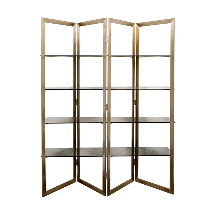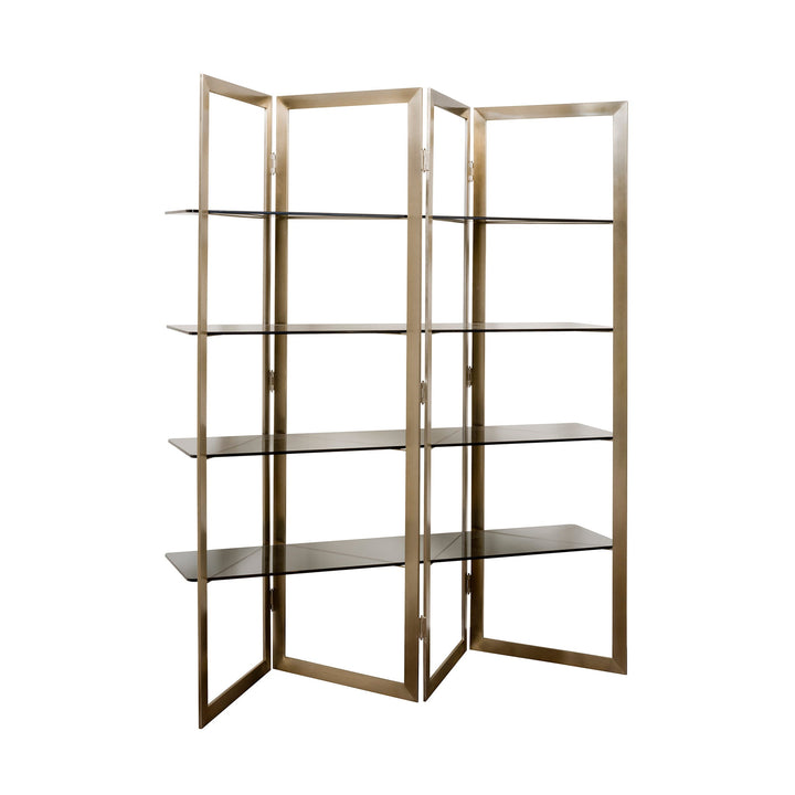 Make any corner shine with the Hinge Etagere - a composition of metal and glass. Four black glass shelves accompany the exquisite White Bronze Metal frame. It is perfect for delightfully displaying pictures, plants, books, and other decorative pieces.