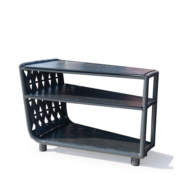 Understated yet versatile, this side table features a welded Aluminum frame in an Anthracite finish, infusing an industrial aesthetic. An intricate weaving in UV-treated outdoor Acrylic fabric increases the bar of sophistication. It boasts a Ceramic Glass top and two shelves for neatly organizing your items.