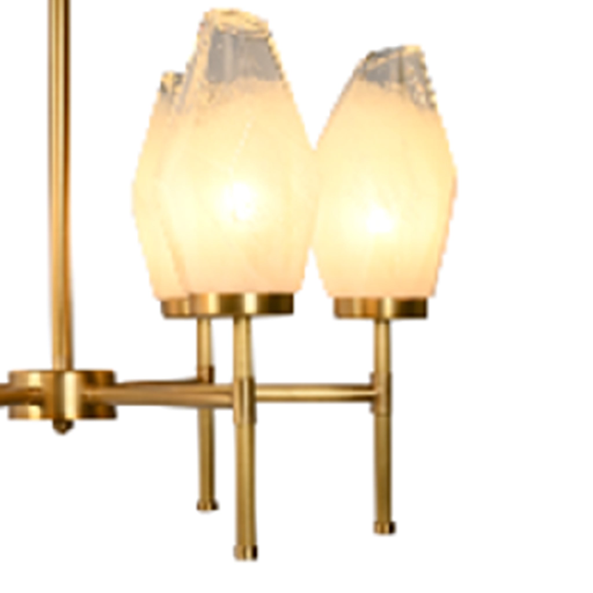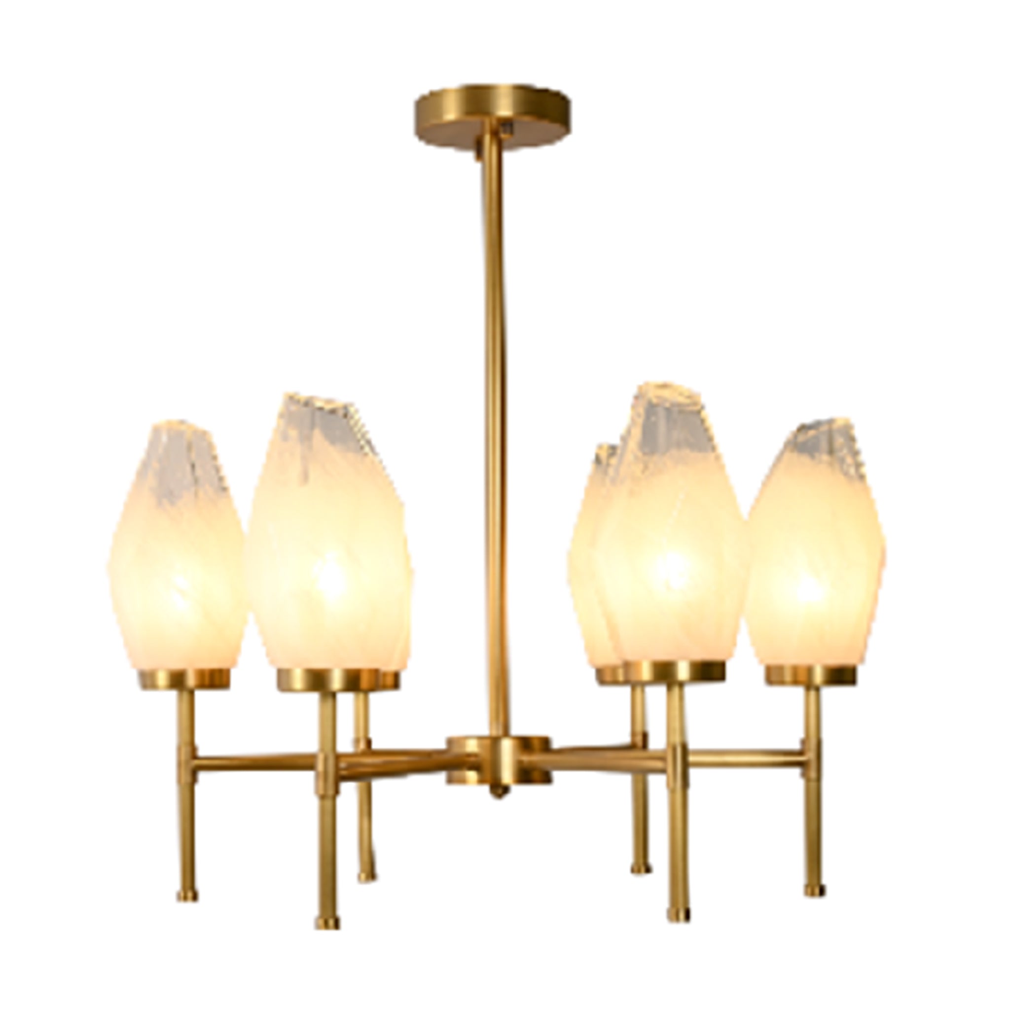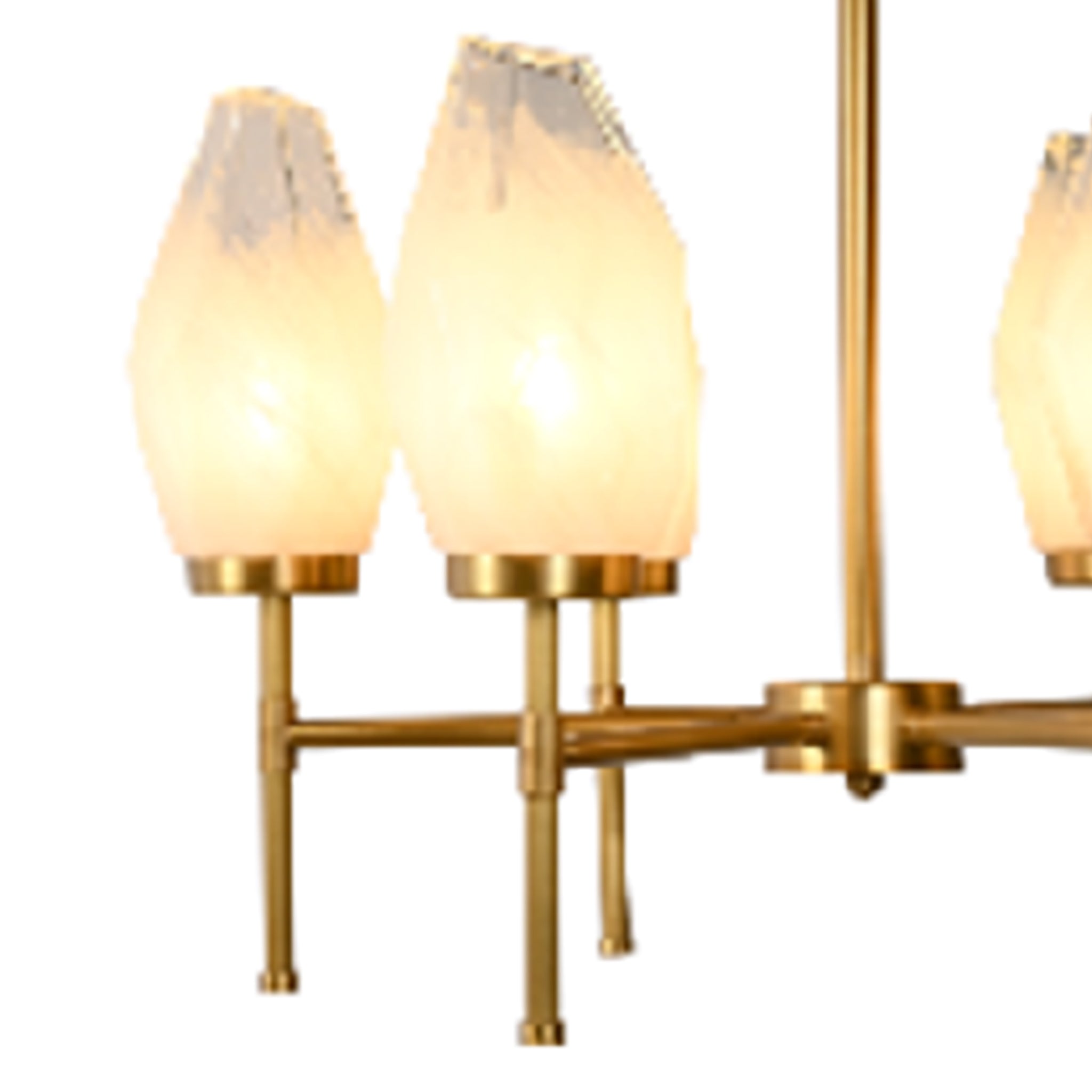 Six sculptural glass shades that resemble the shape of an iceberg are featured on this chandelier, which inspires creative thought. A crisp and pristine Steel frame in an Antique Brass finish completes the lavish outlook.