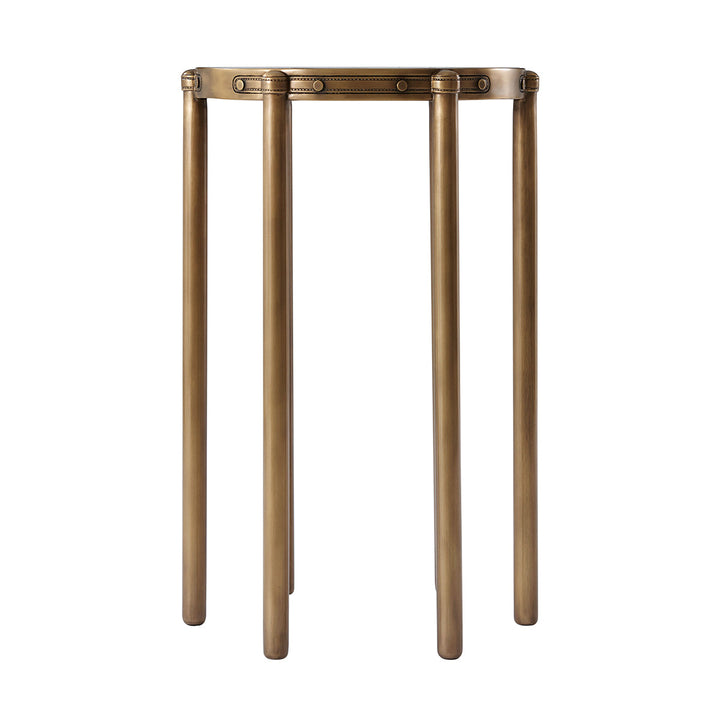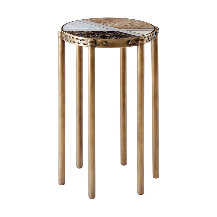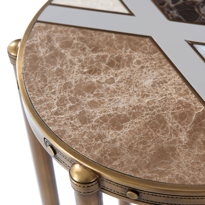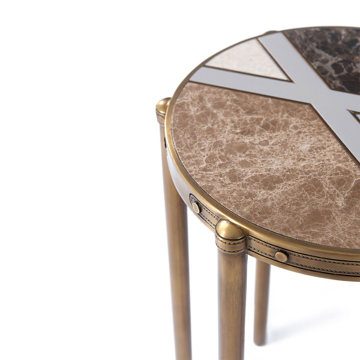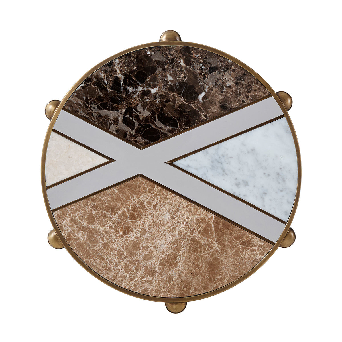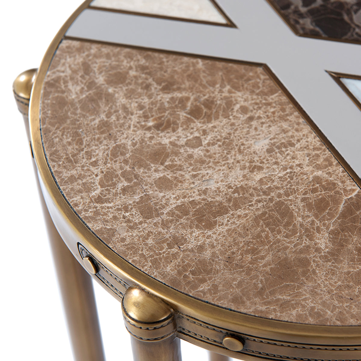 Identity of ethnicity marks this accent table with its artisan craft. The exquisite parquetry marble inlaid top lacquers to glossy detail. Solid brass strapped frieze details are ideal for connecting the circular top. It is a pop-up glory to embellish your modern art deco spaces.
