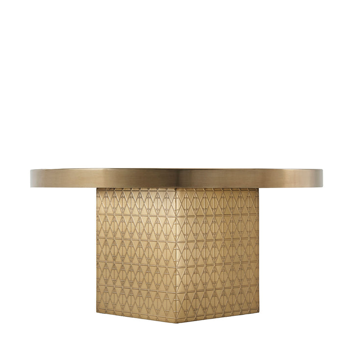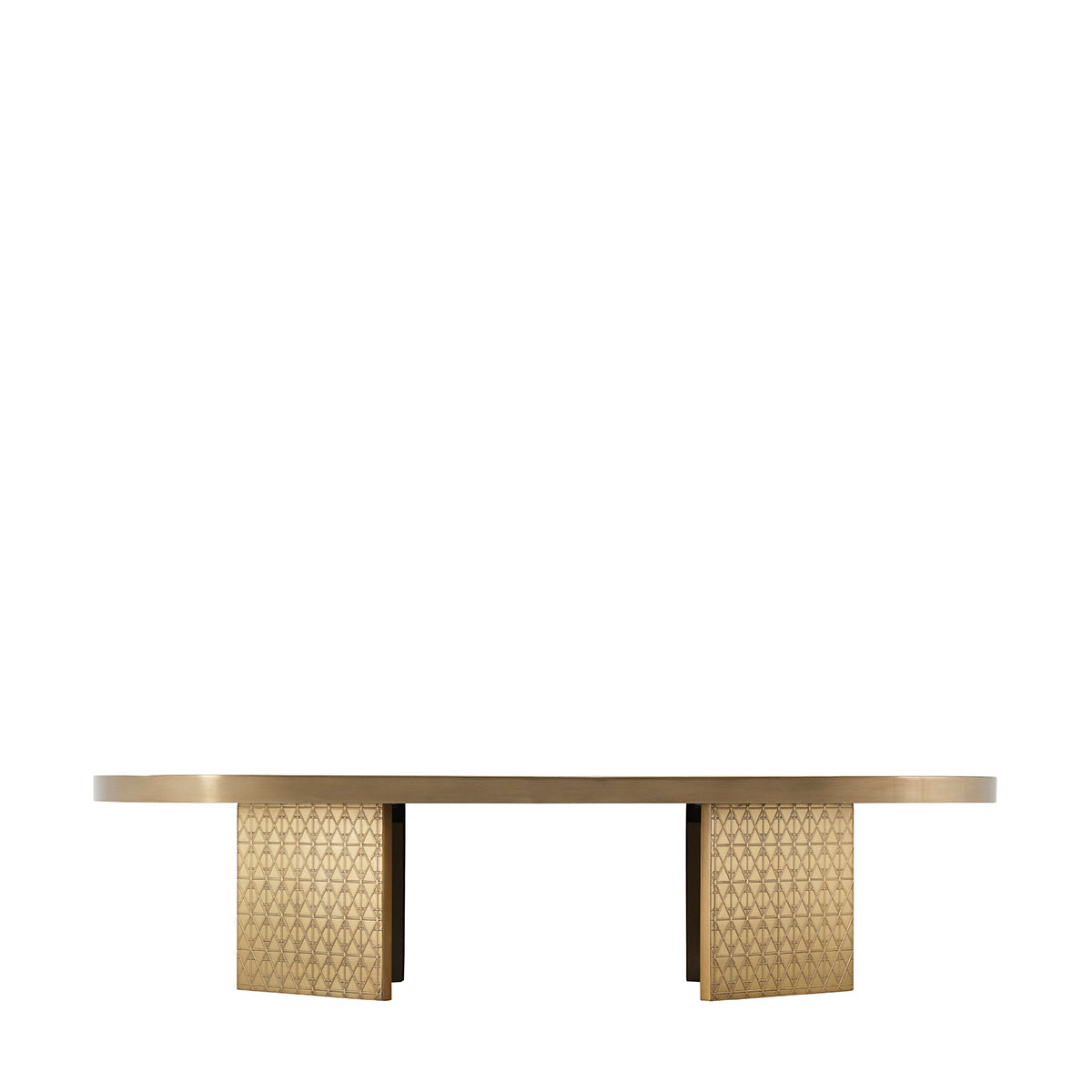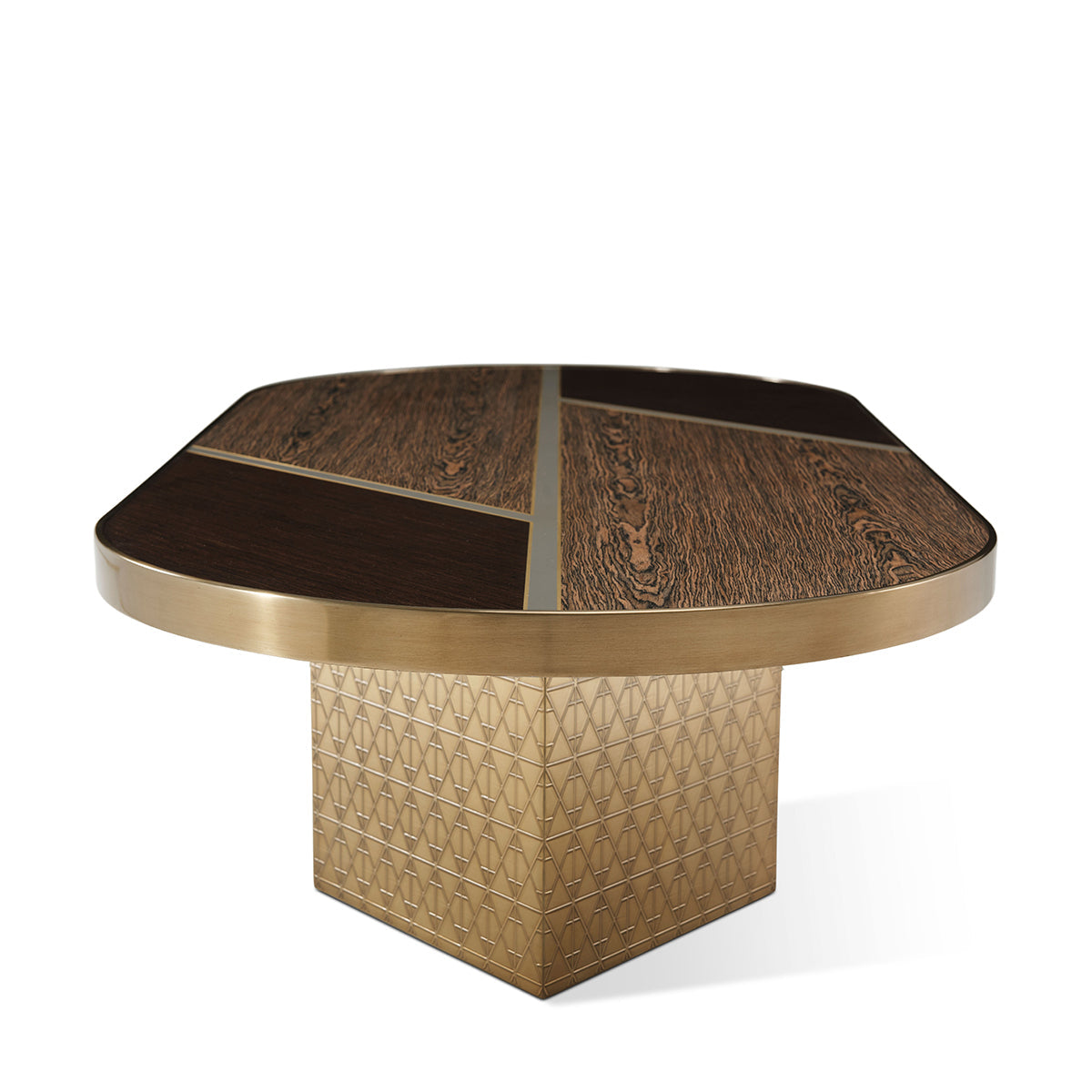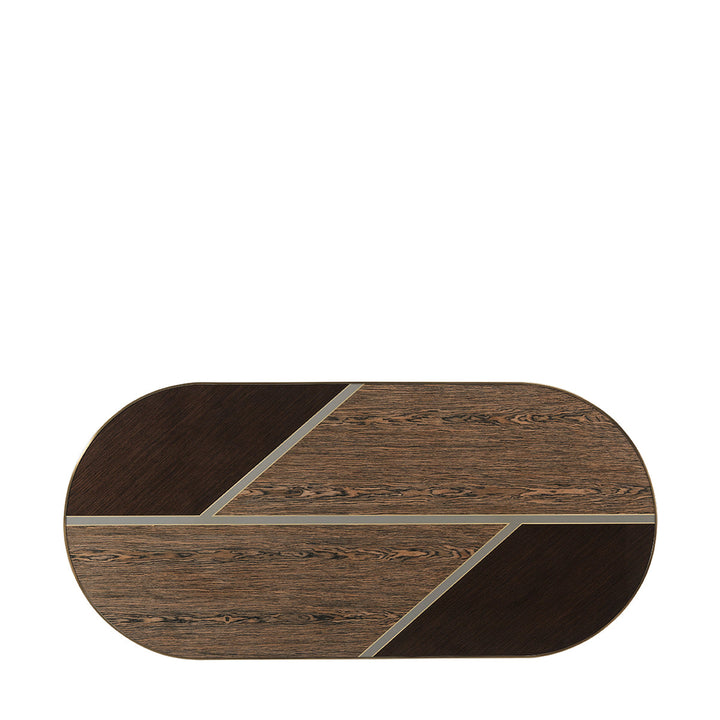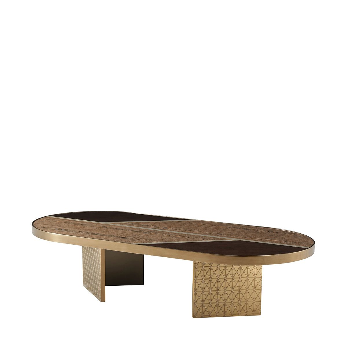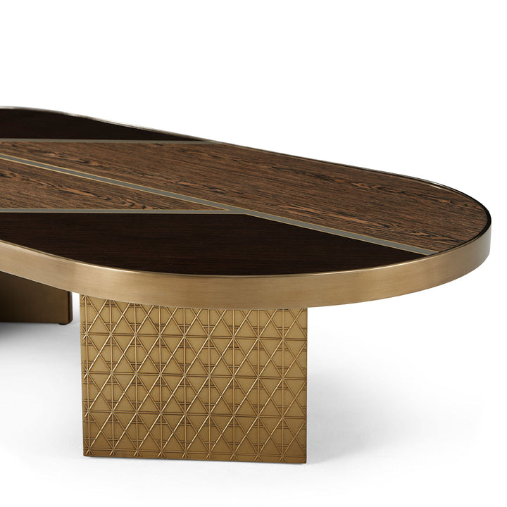 Flaunt your classy decor choices by adding the Iconic Cocktail Table to your living space. Its racetrack top adorned with Parquetry finished in Lacquer and Veneer set the perfect mood for indulgence. The V-shaped bases containing geometric etching work instantly capture attention, creating a focal point in the room. Its intricate Brass inlaid detailing further elevates the aesthetics.